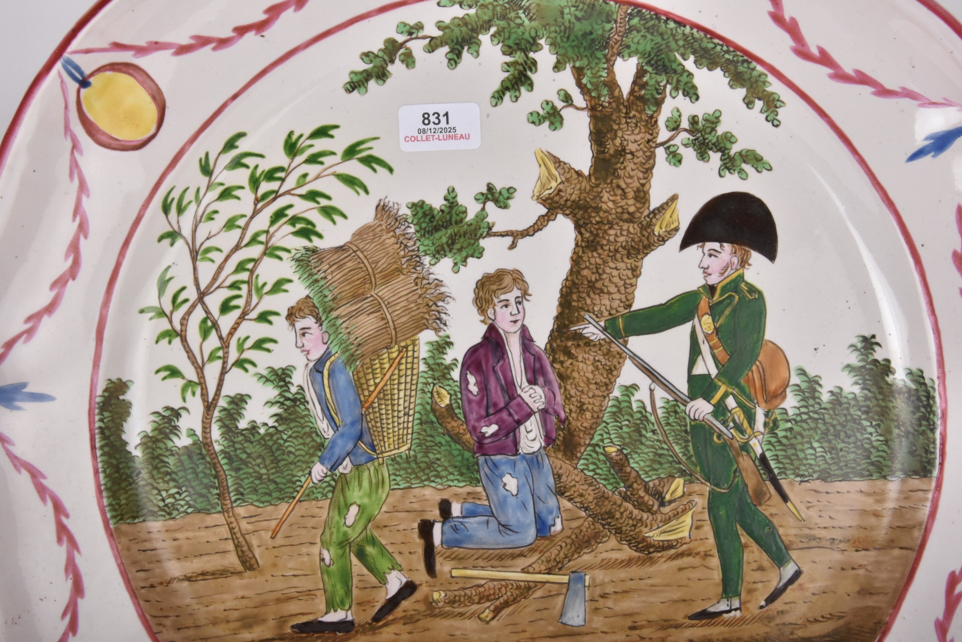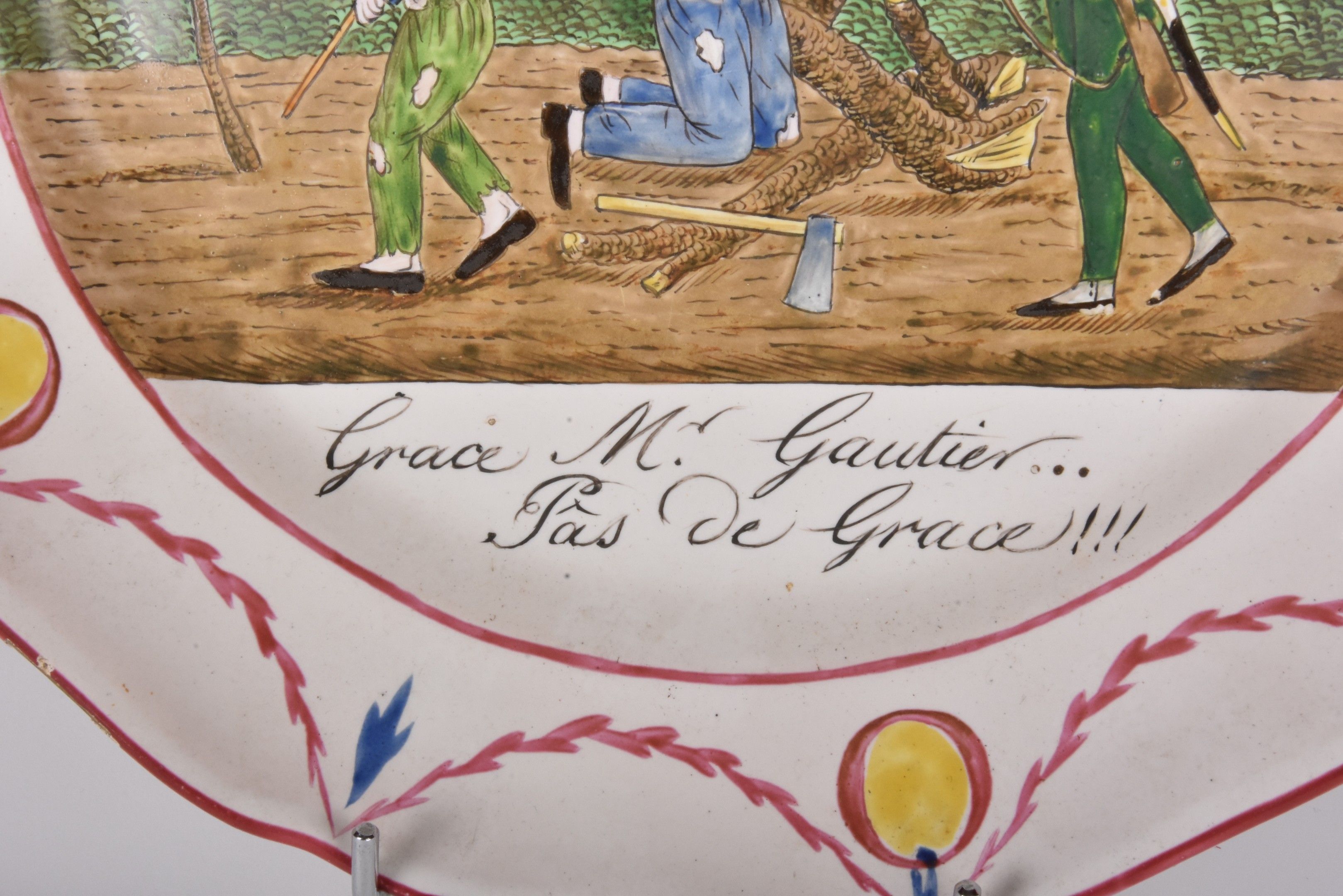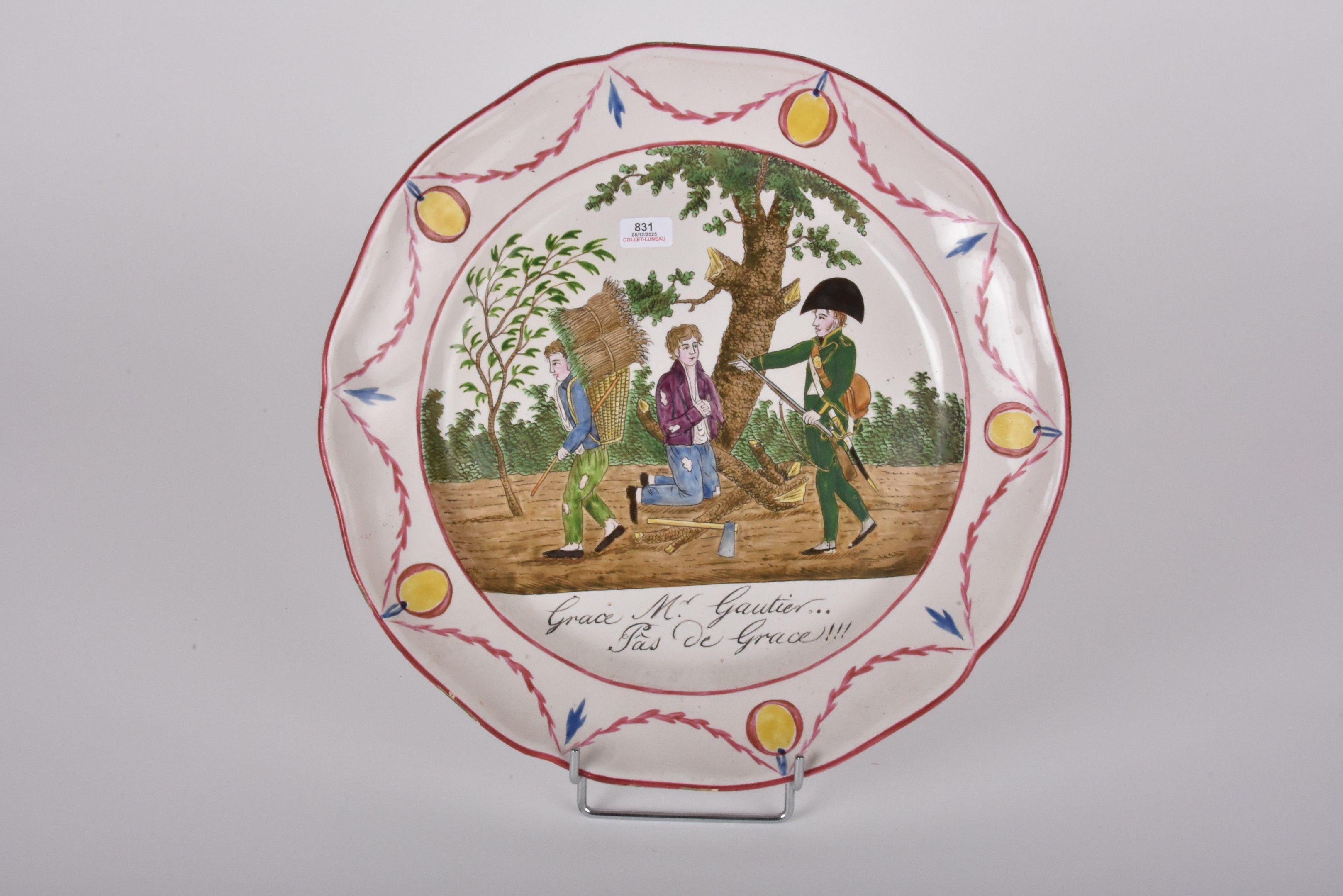 LES ISLETTES Dupré period - Earthenware dish decorated with an animated scene of a forest ranger "Grace Mr Gautier... Pâs de Grace!!!. The wing is decorated with draperies and medallions. 19th century (enamel chips around the rim). Diameter 30,5 cm