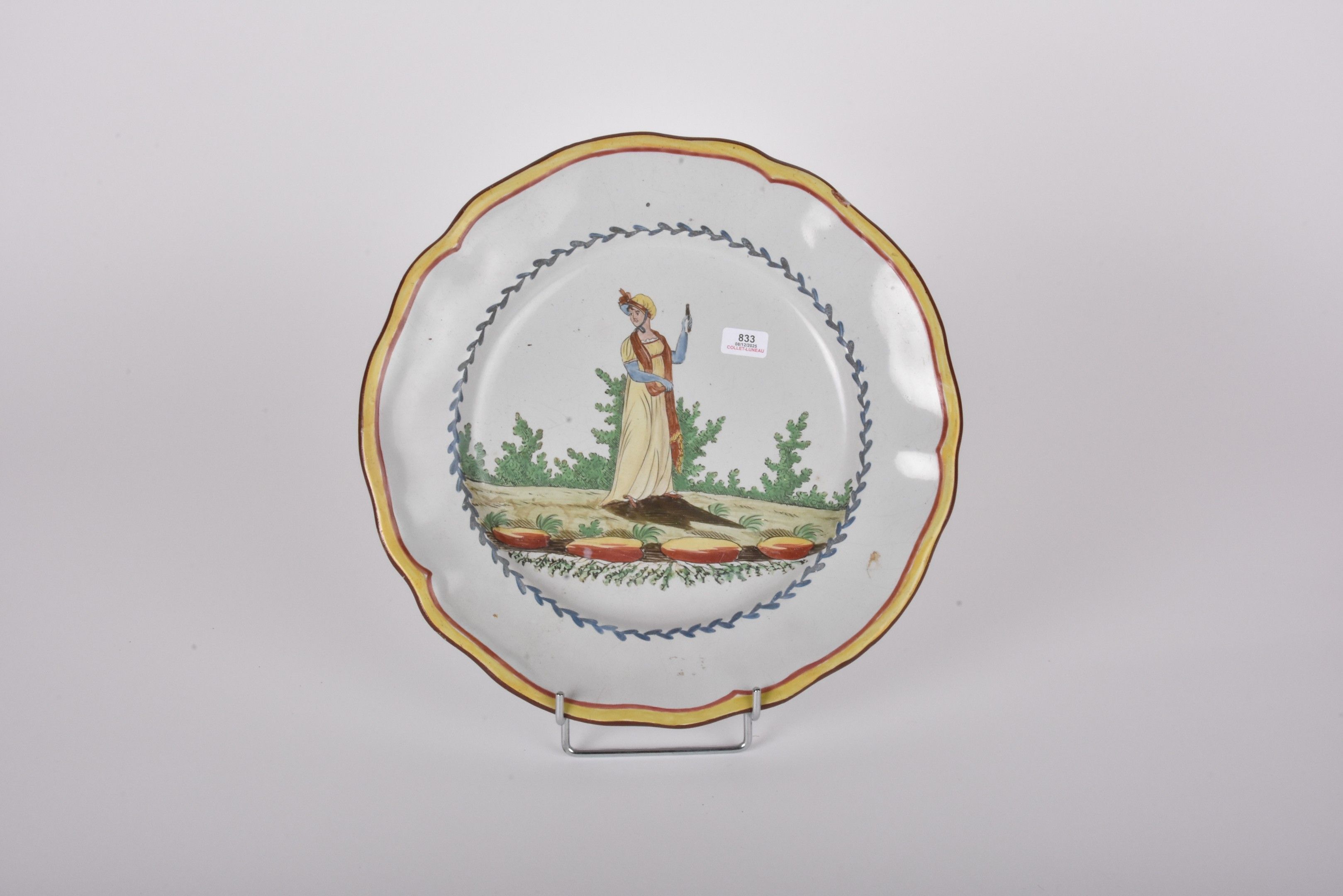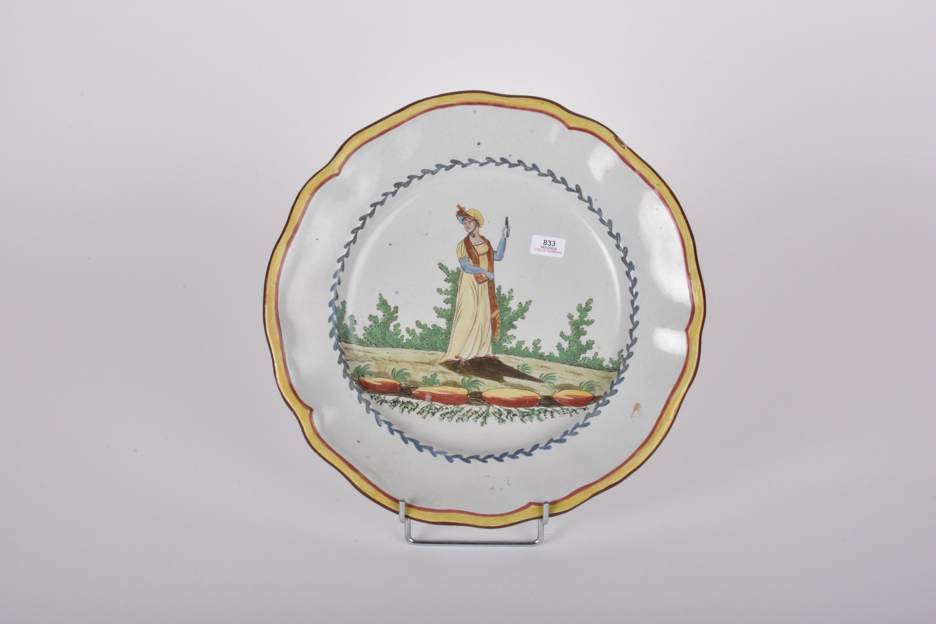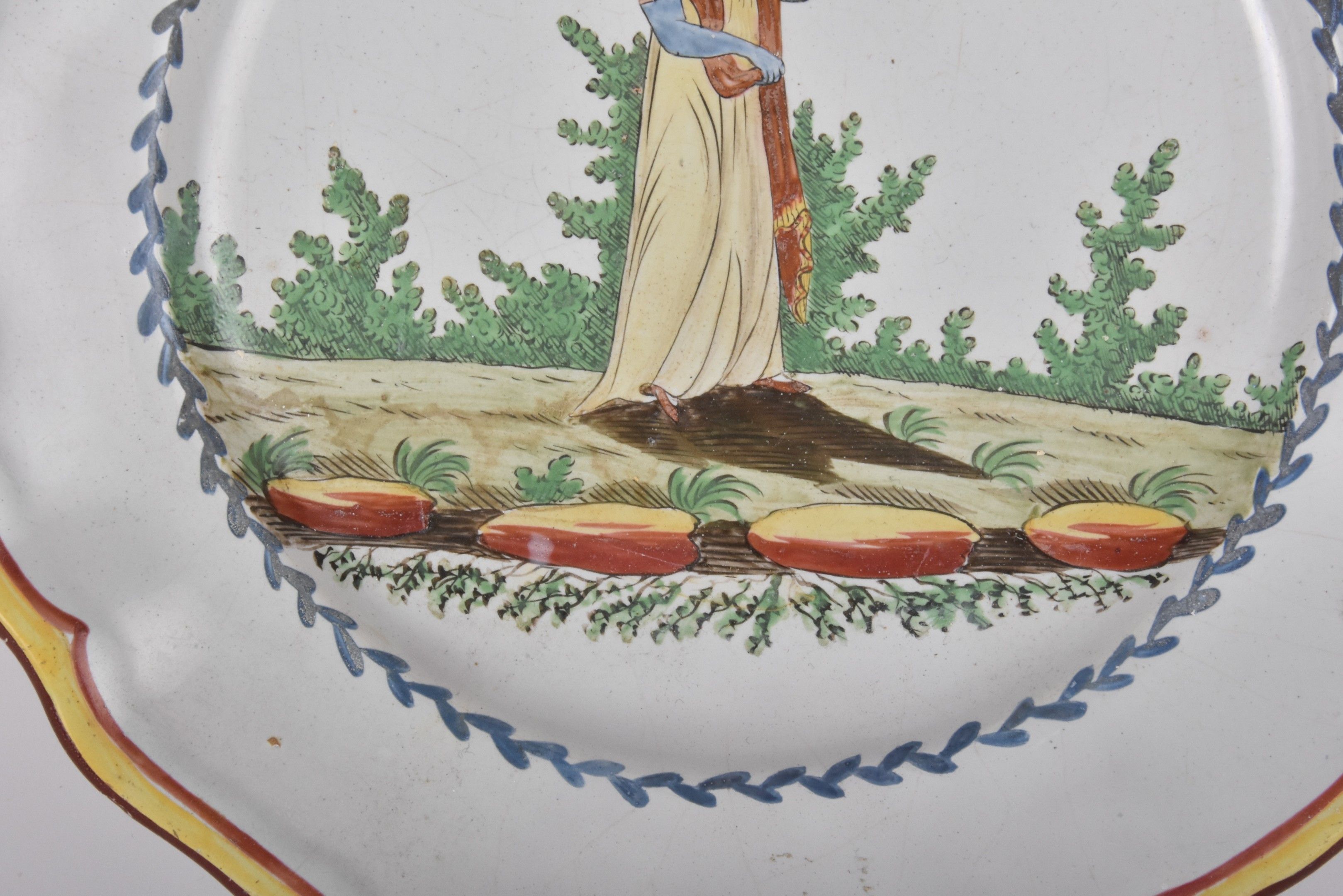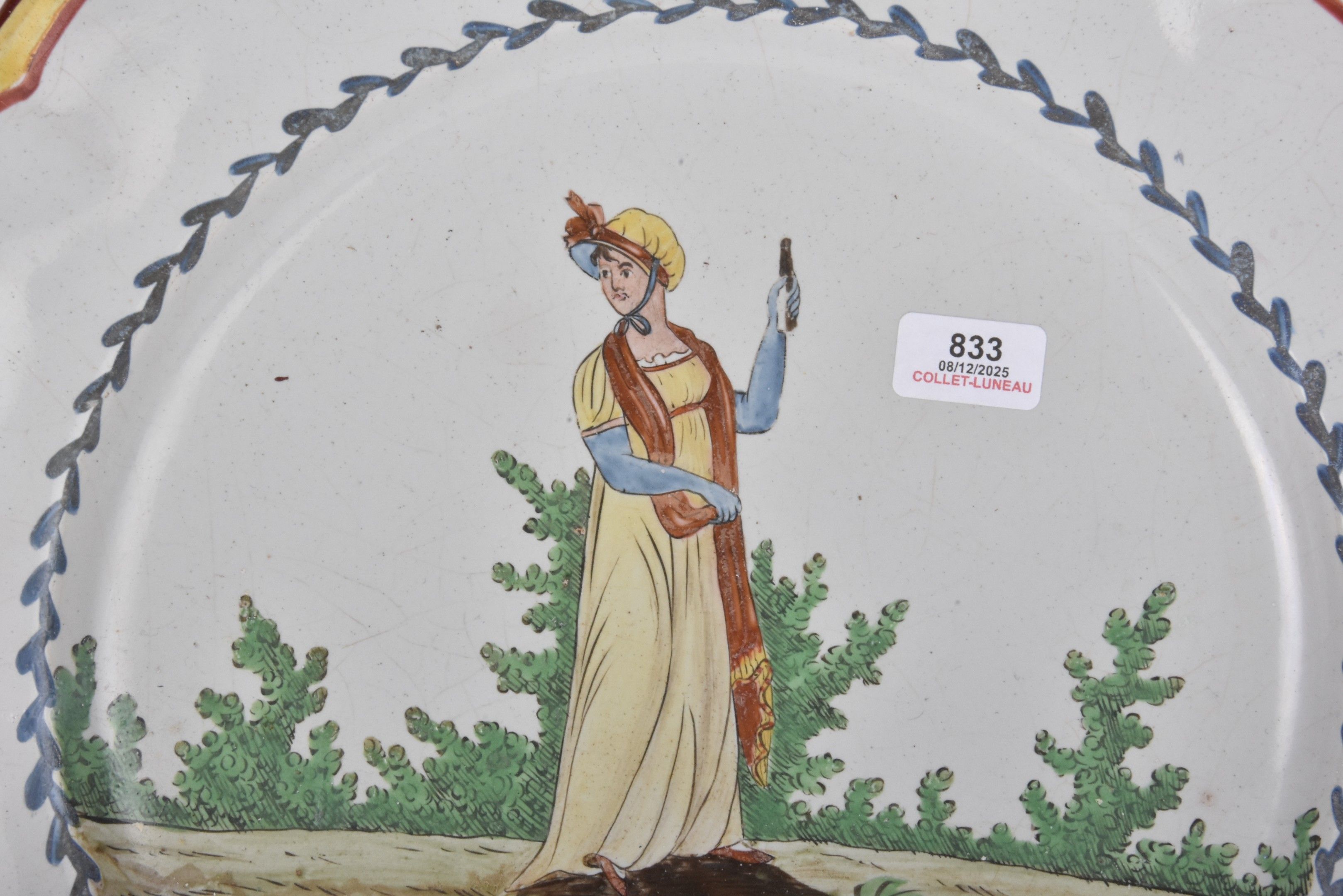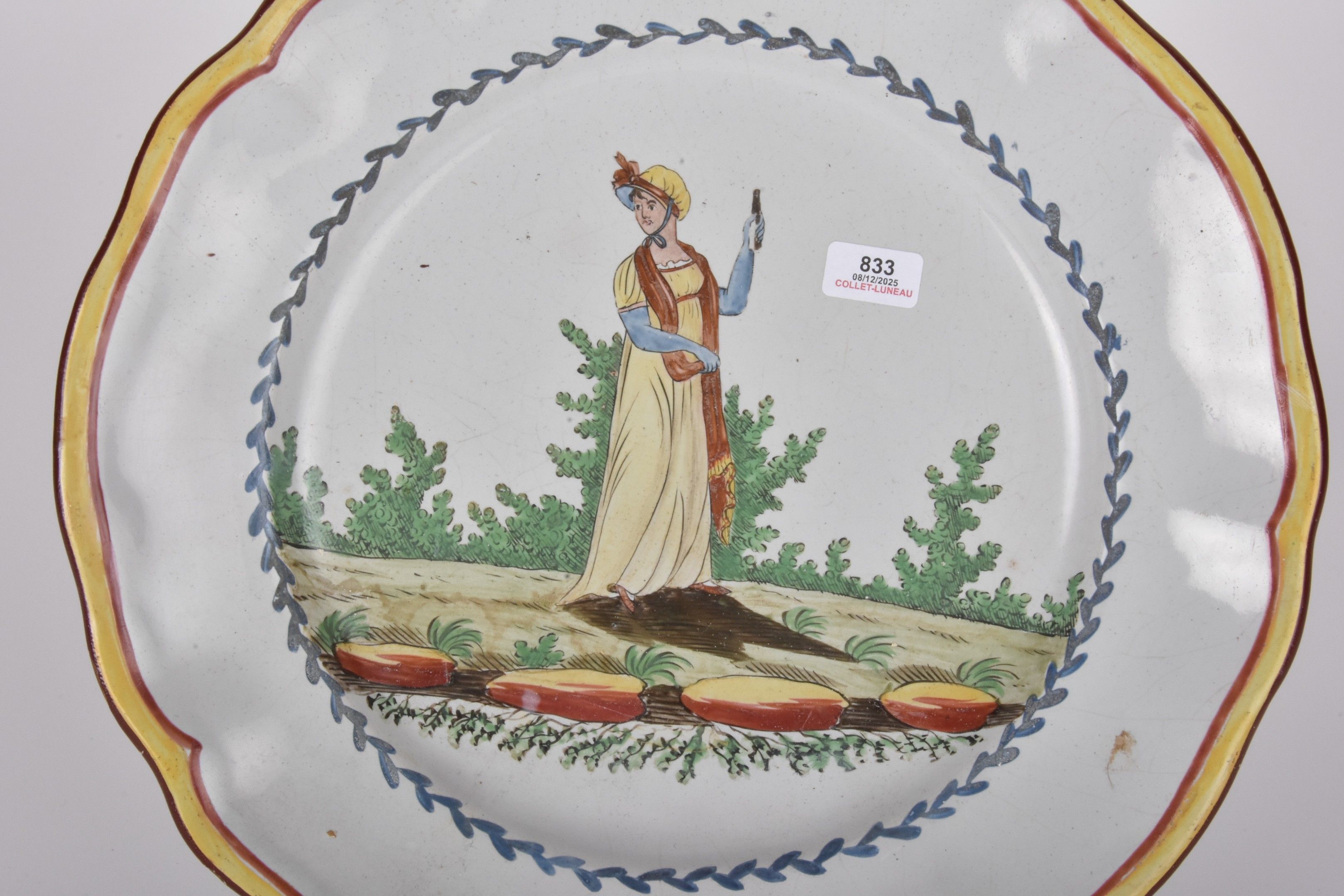 LES ISLETTES Dupré period - Small earthenware dish decorated with Madame Bernard. The side is decorated with a poly-lobed design with a yellow fillet and a blue laurel garland (completely restored) Diam. 28 cm