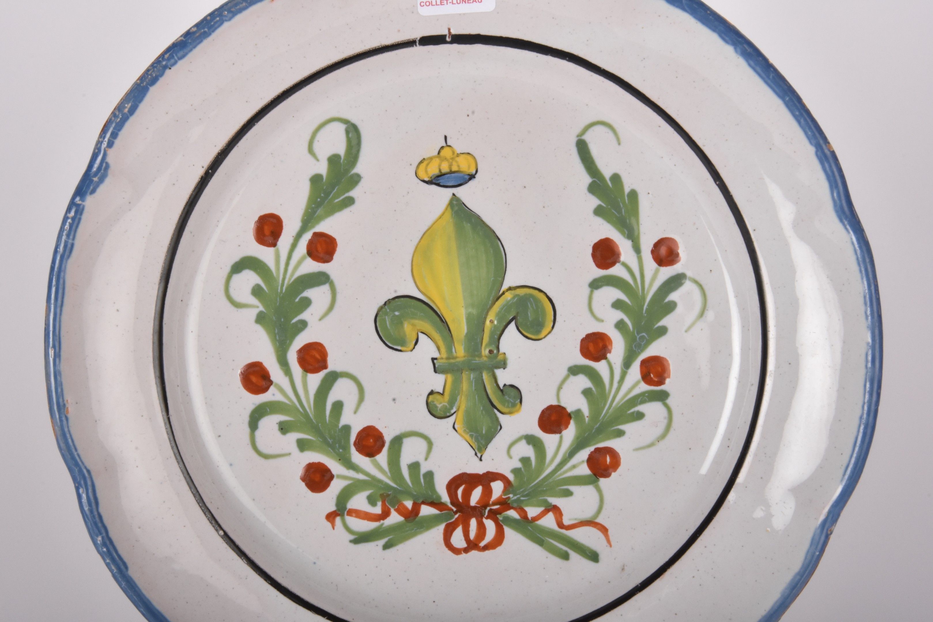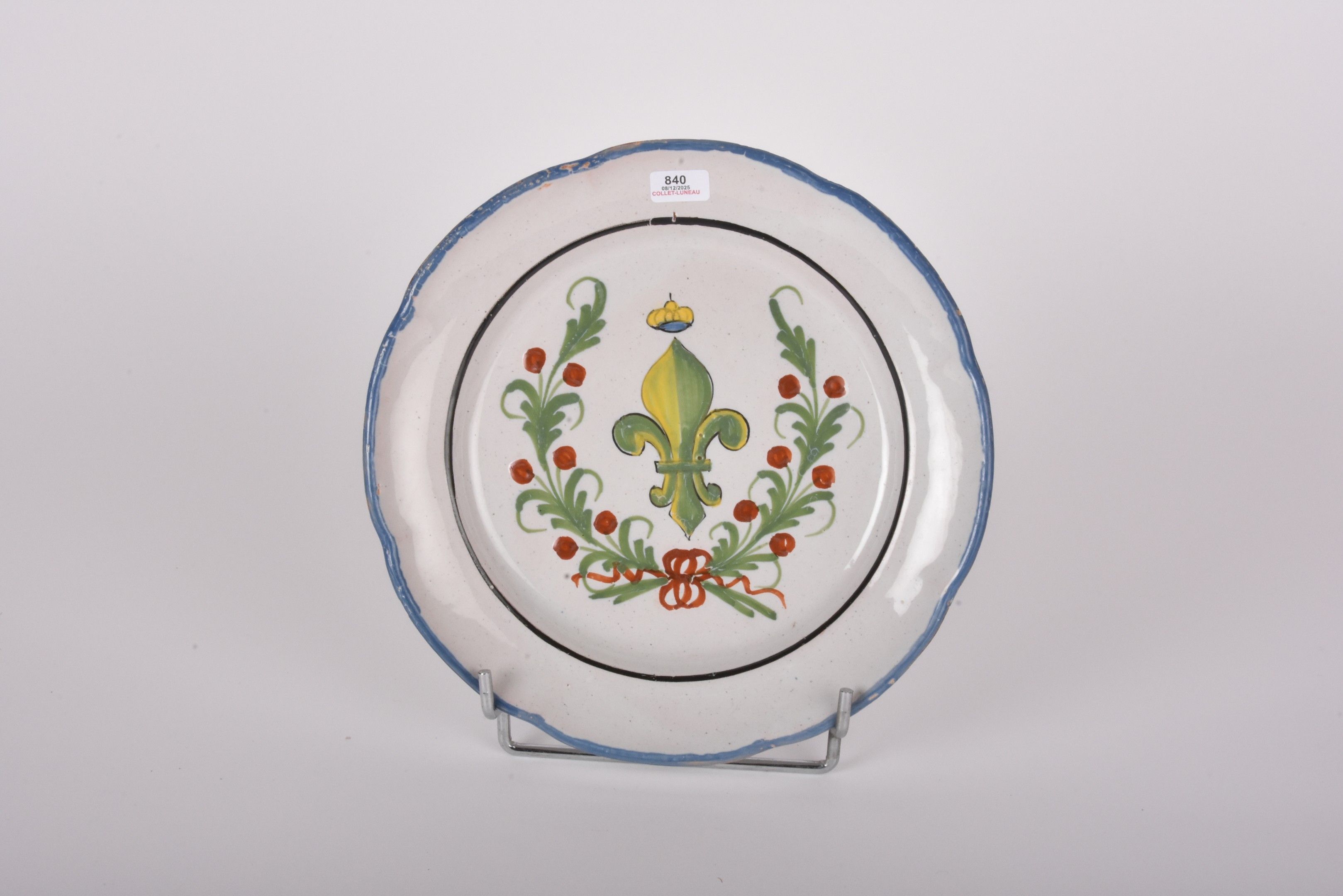 WALY - Earthenware plate with fleur-de-lys decoration, Restoration period (glaze marks around the rim) Diam 23.5 cm