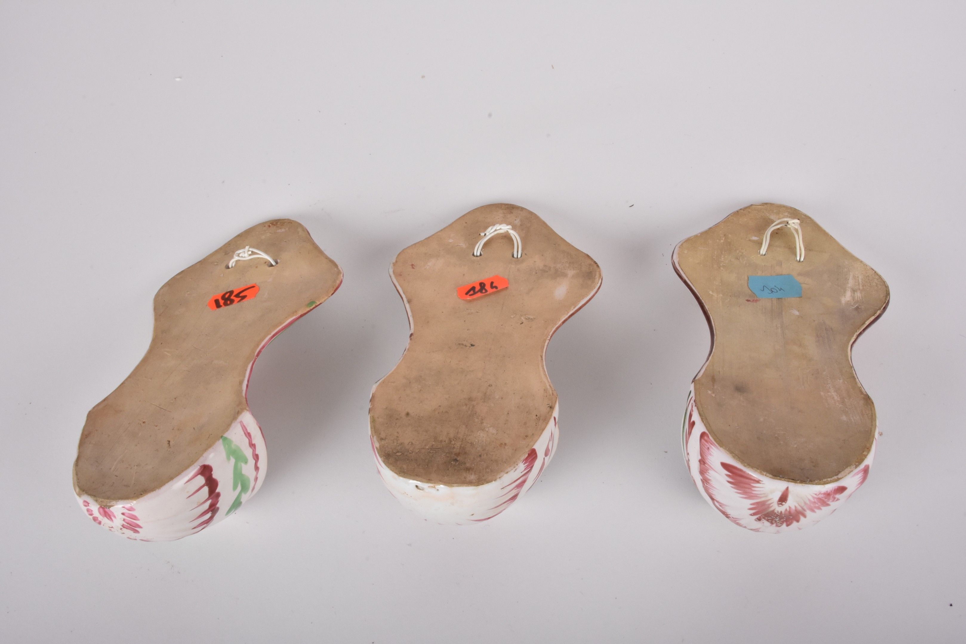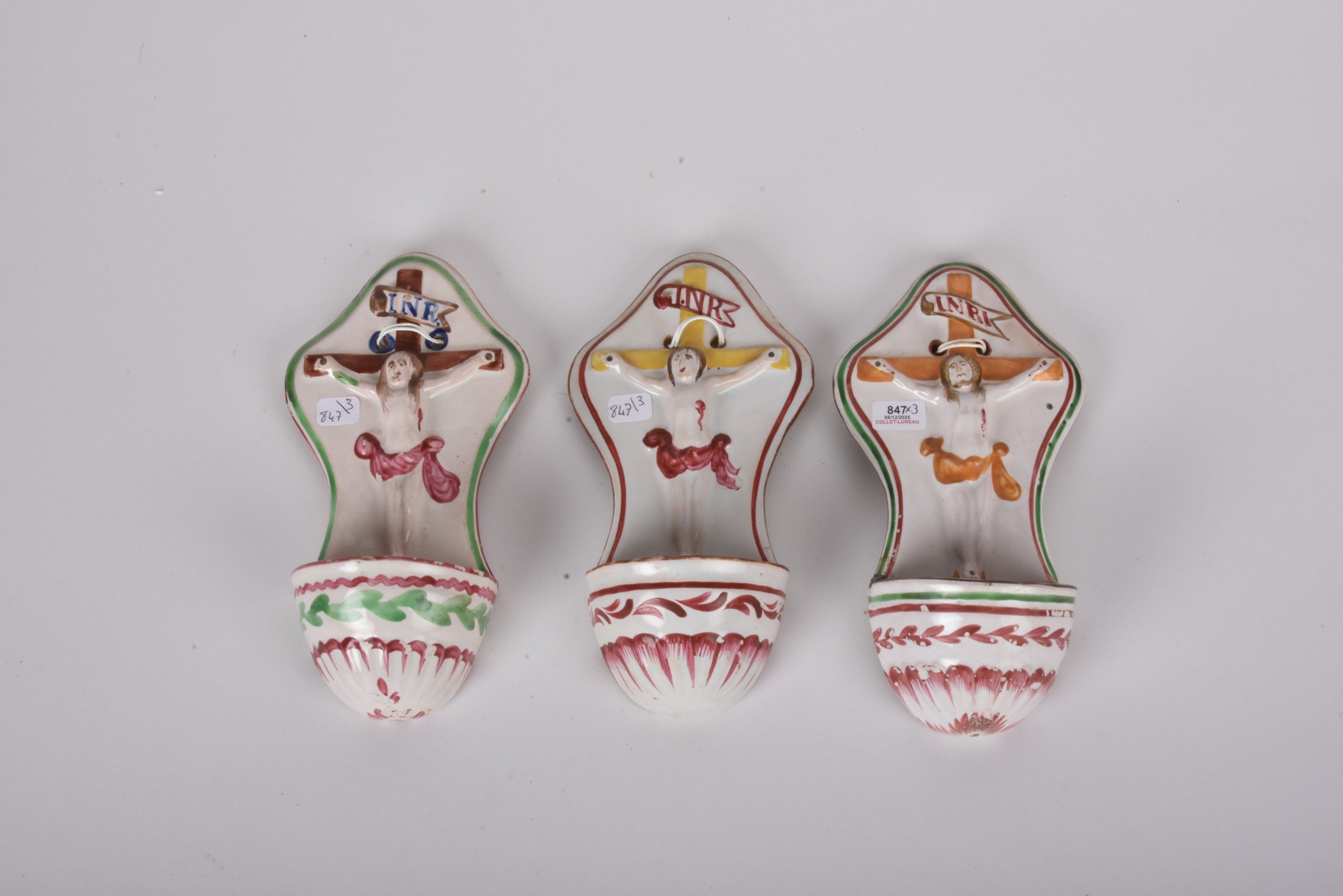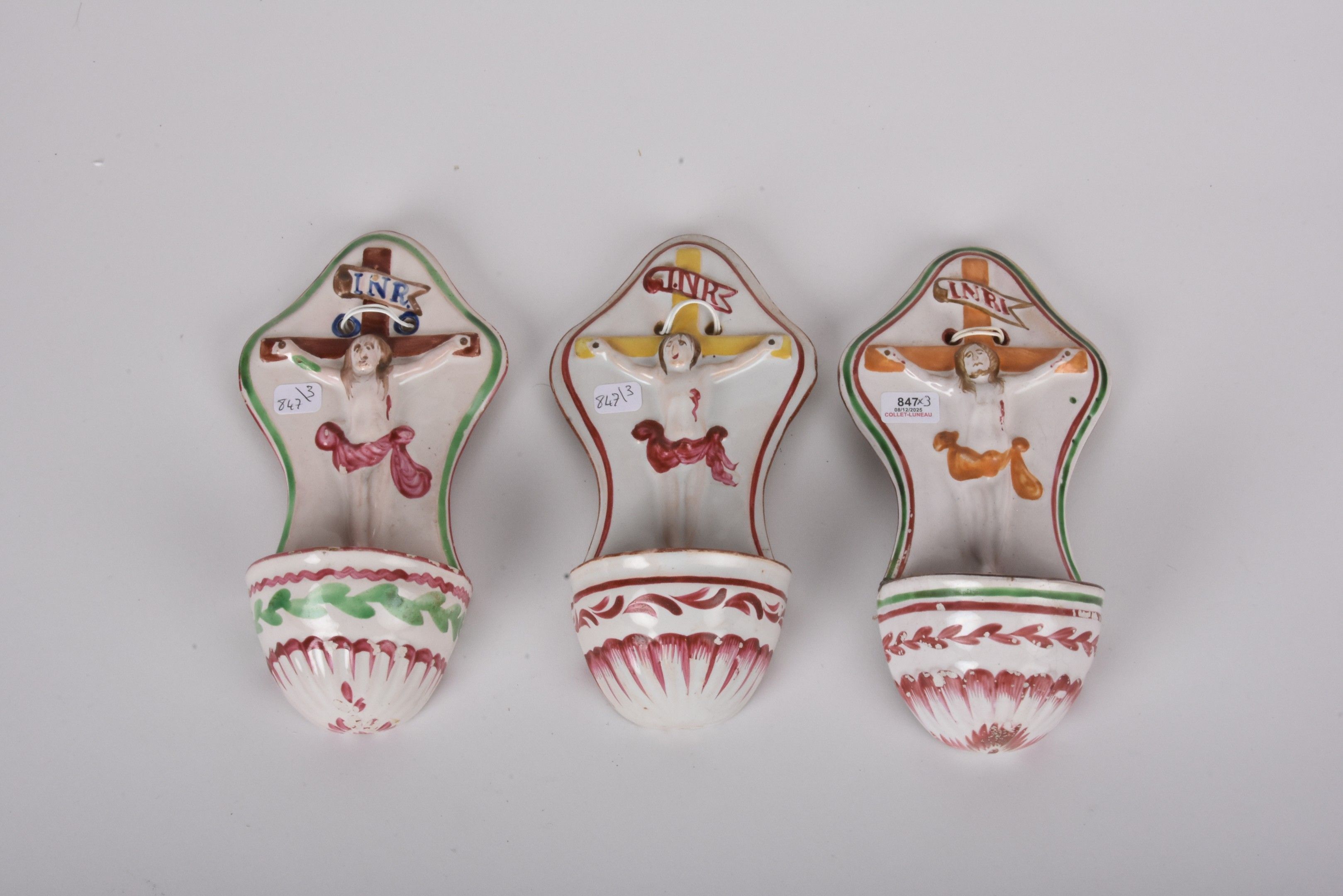 LES ISLETTES - Three earthenware fonts, late 18th century, early 19th century (paint and glaze missing). 20 cm high