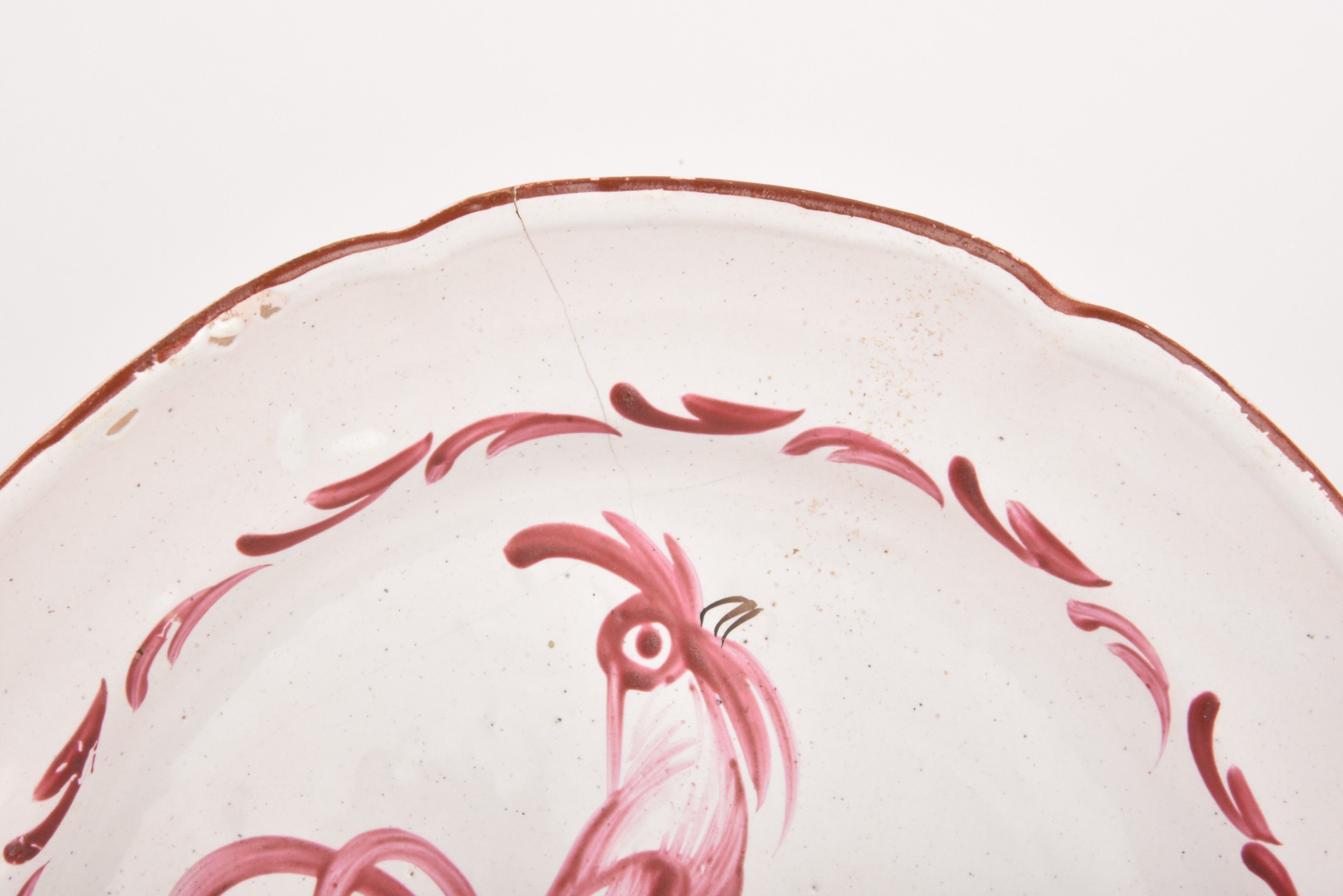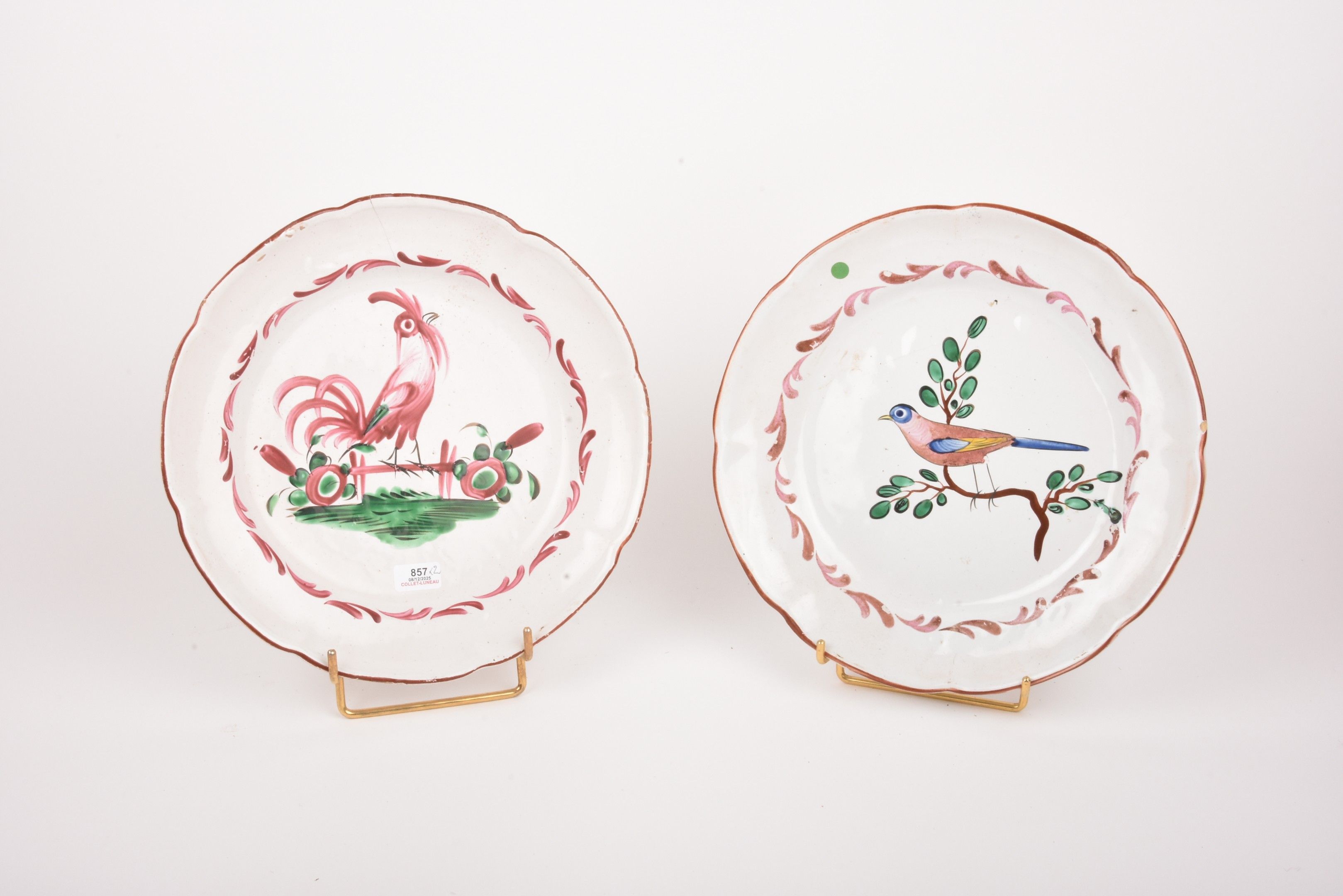 LES ISLETTES . Two earthenware plates, one decorated with a rooster (cracked), the other with a bird branch.
