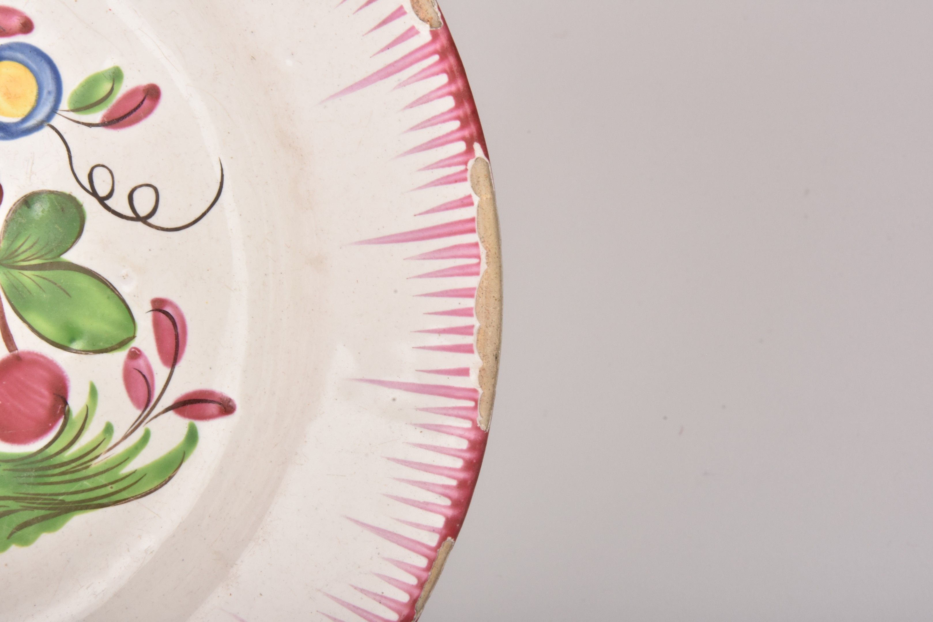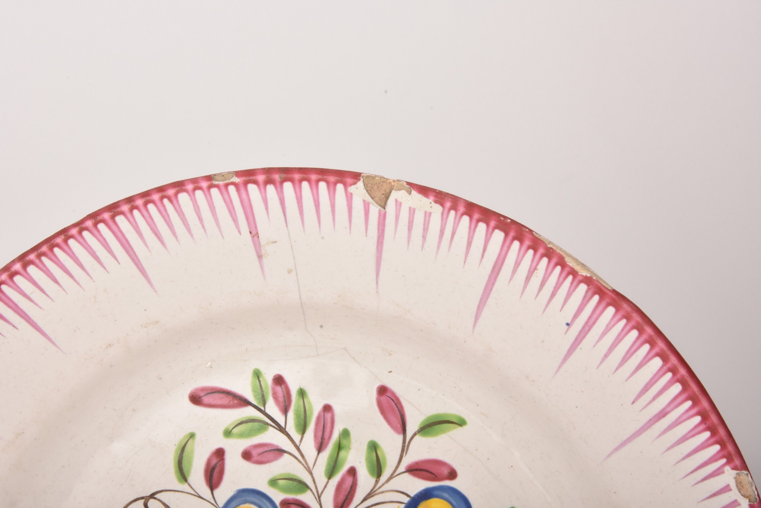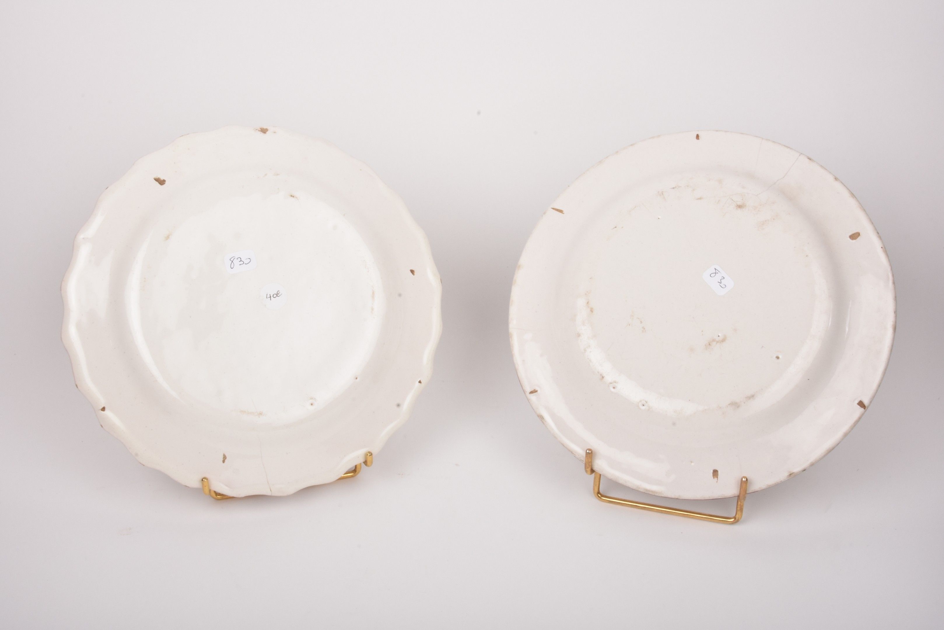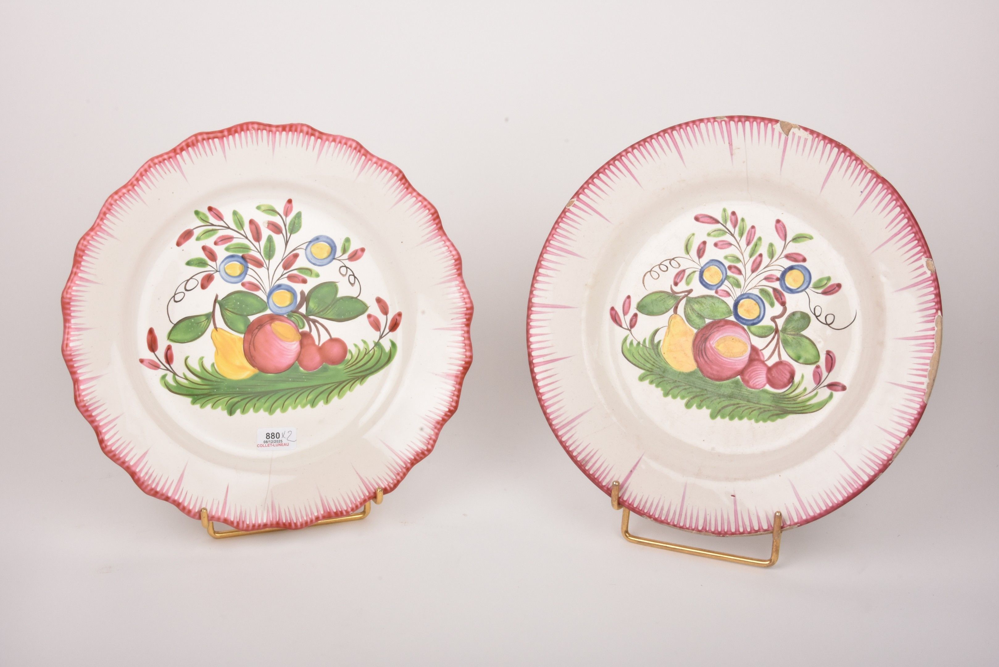 EST. Two earthenware plates decorated with fruit, one with a notched rim.