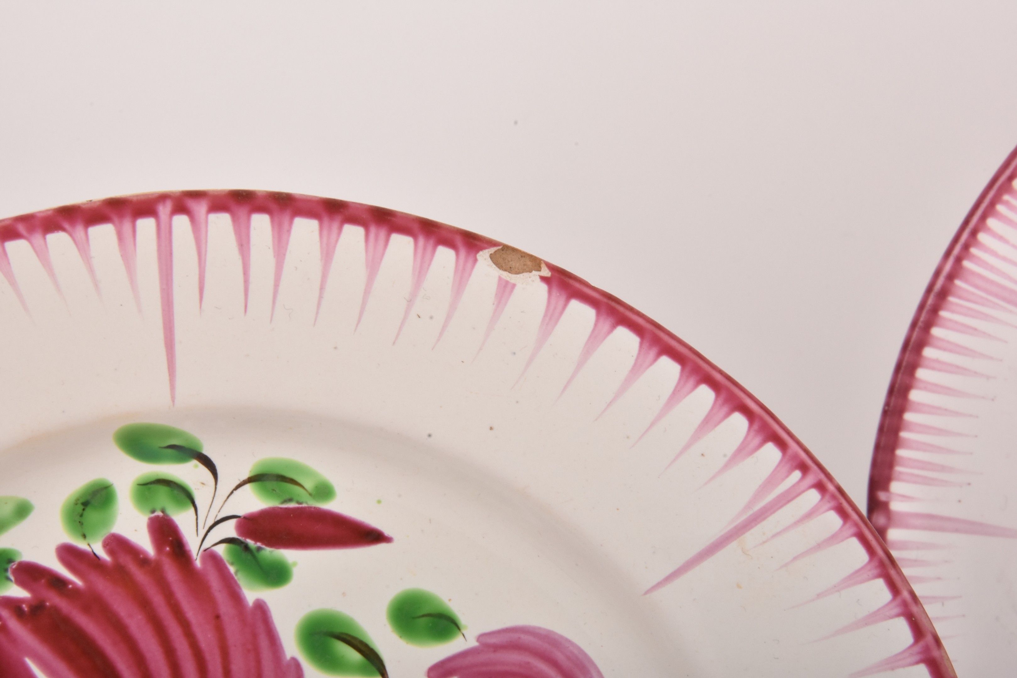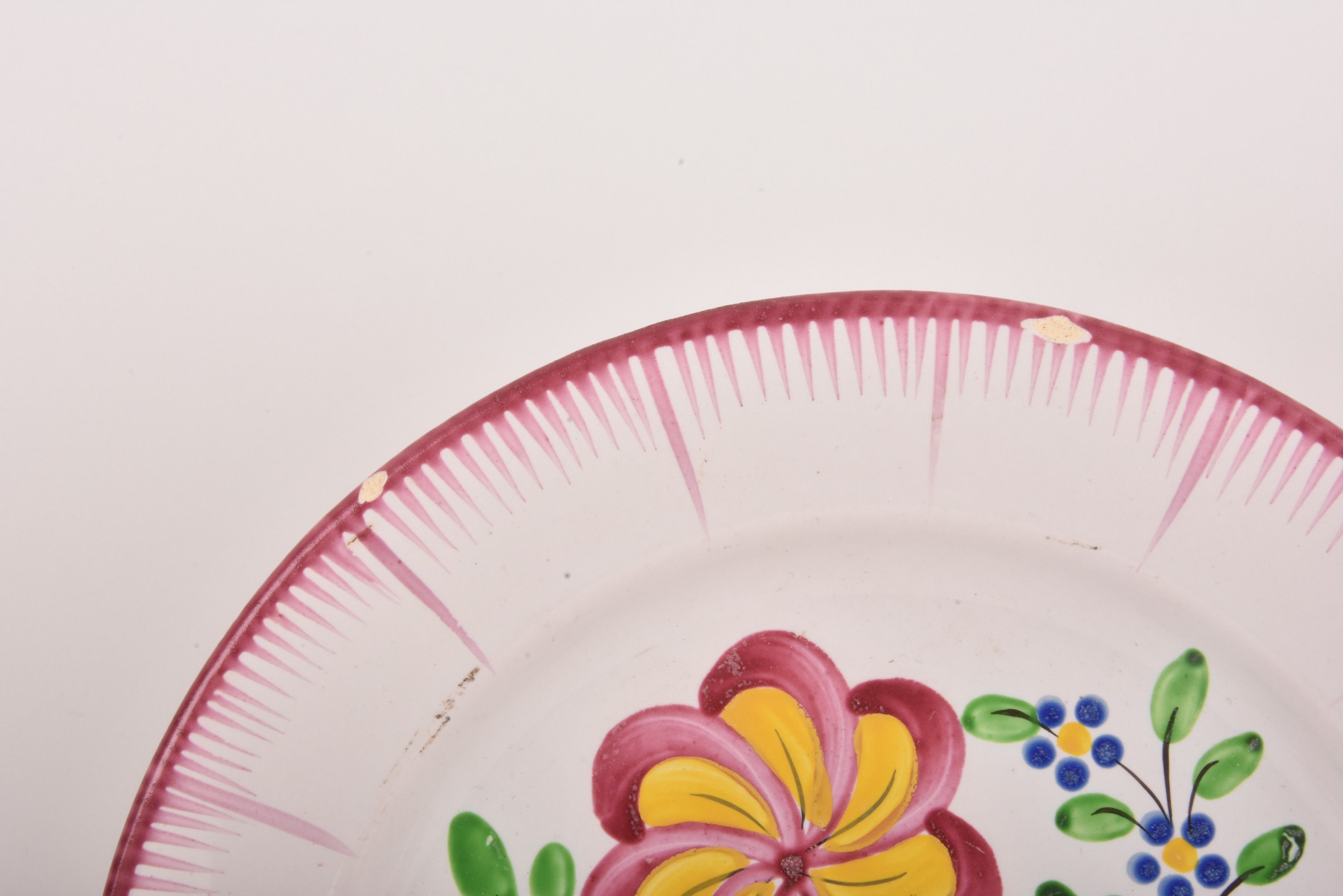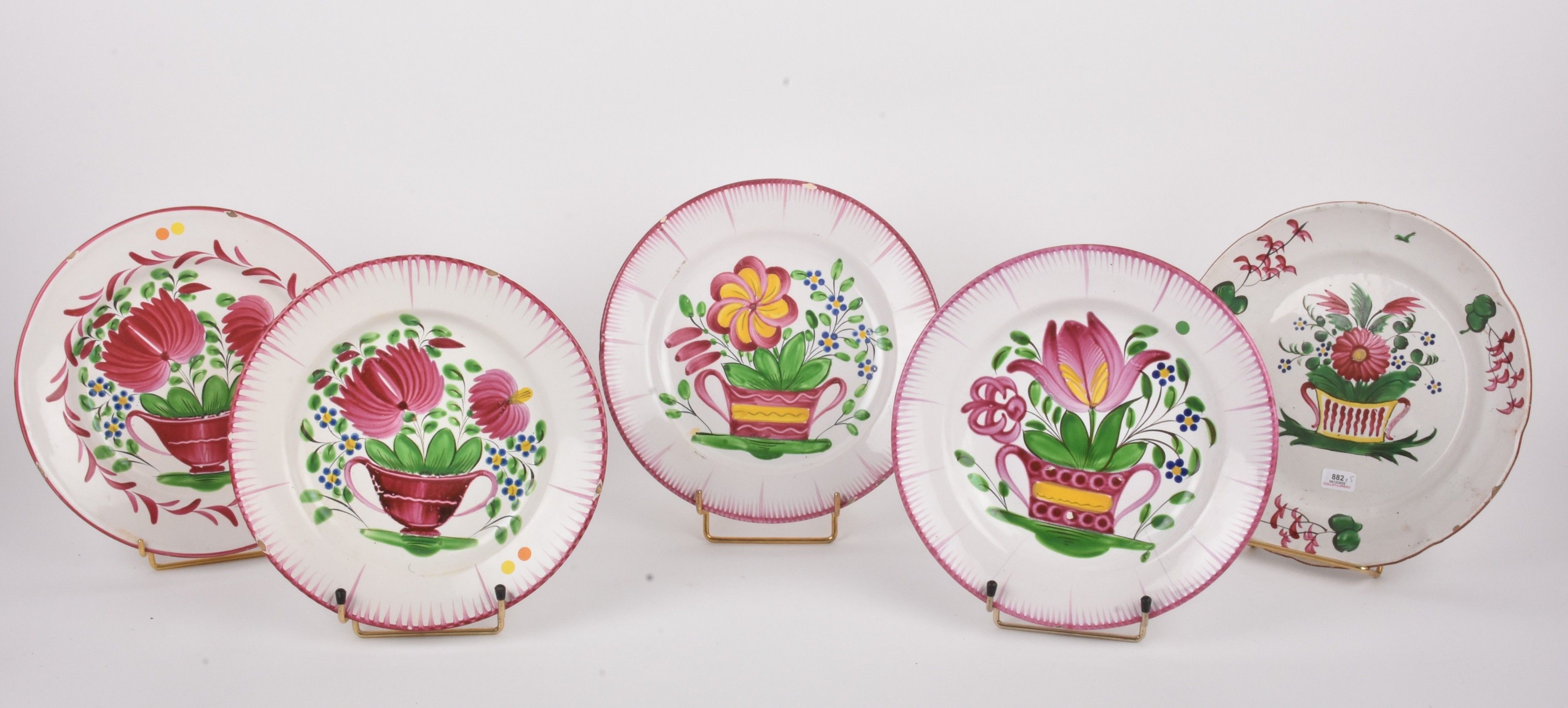 EST. Five earthenware plates decorated with flowering baskets.
