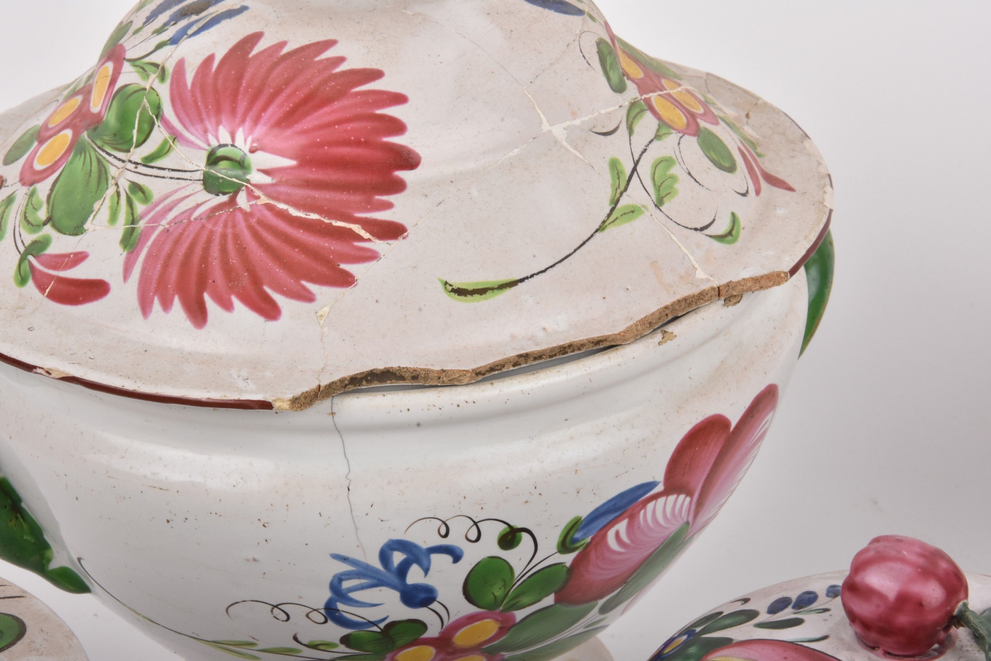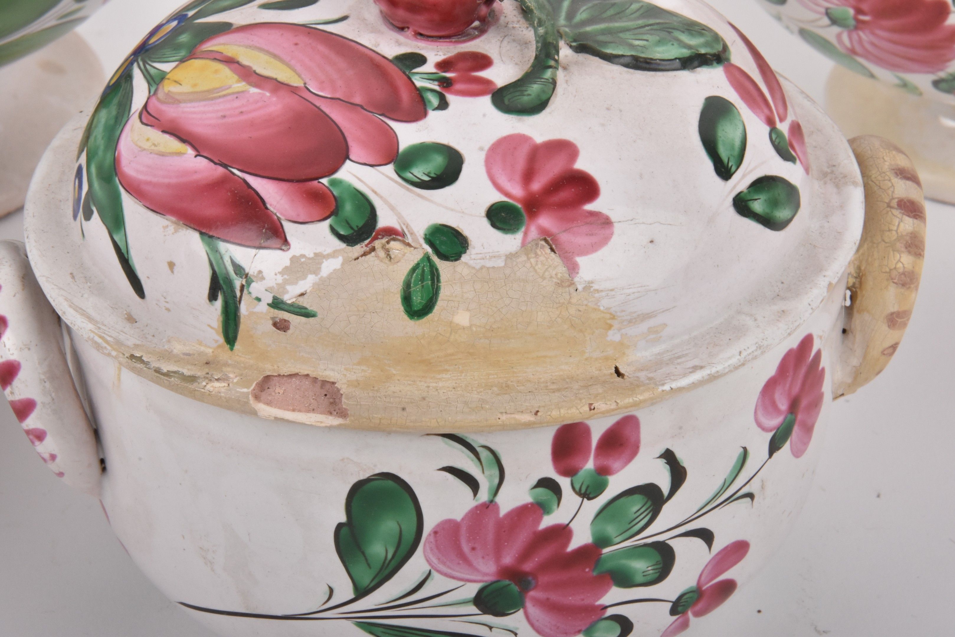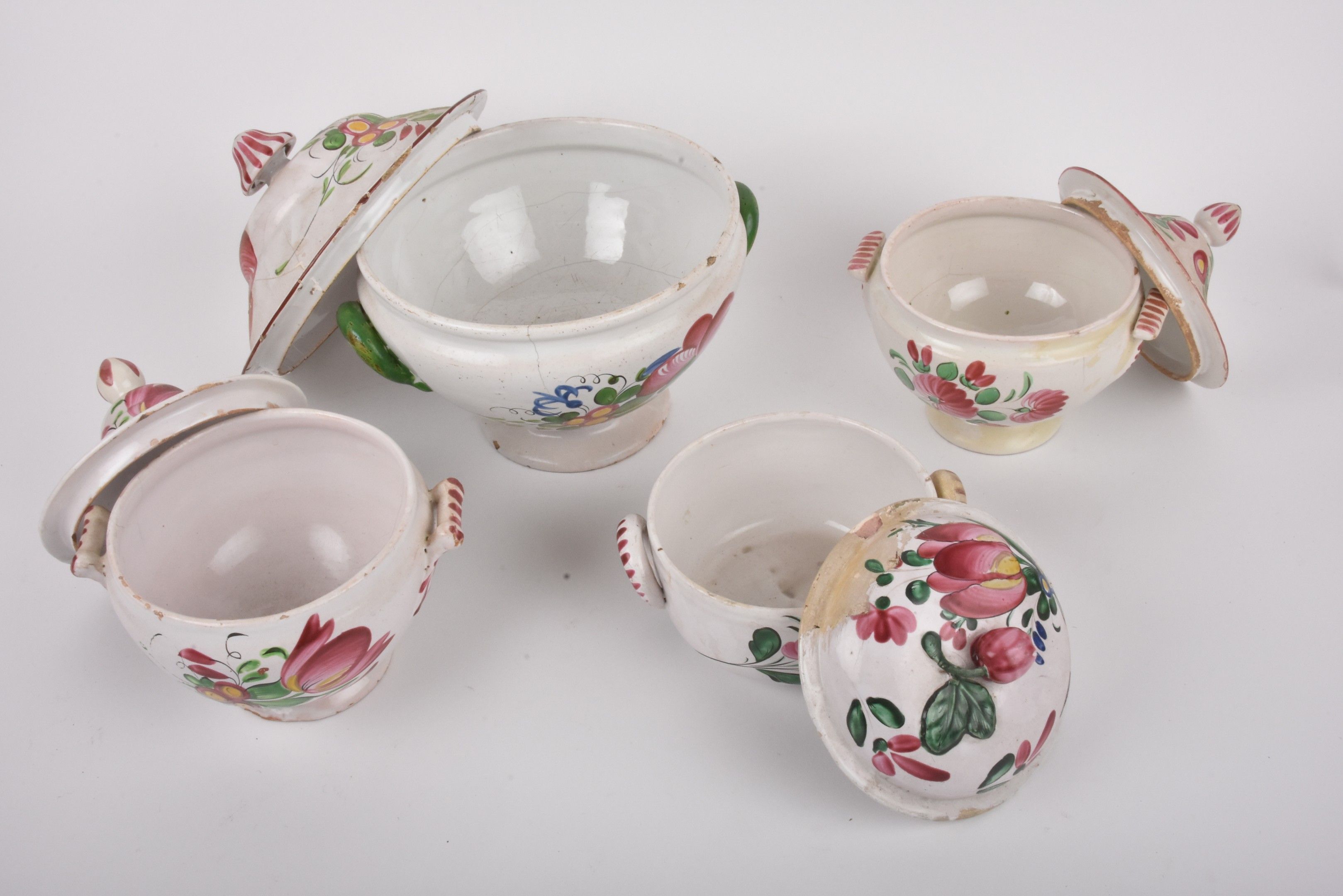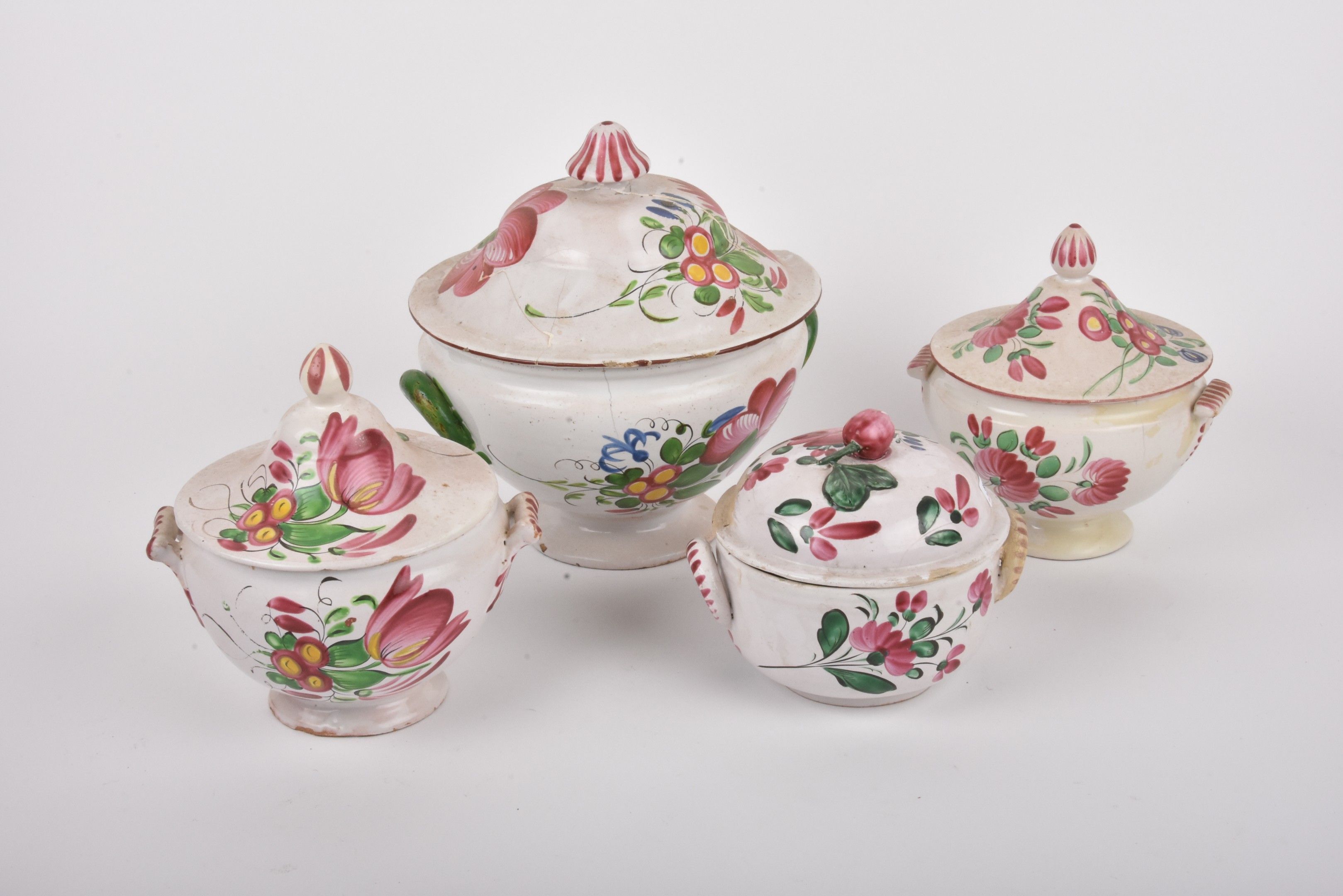 LES ISLETTES. A tureen and three covered earthenware bouillons with flower decoration.