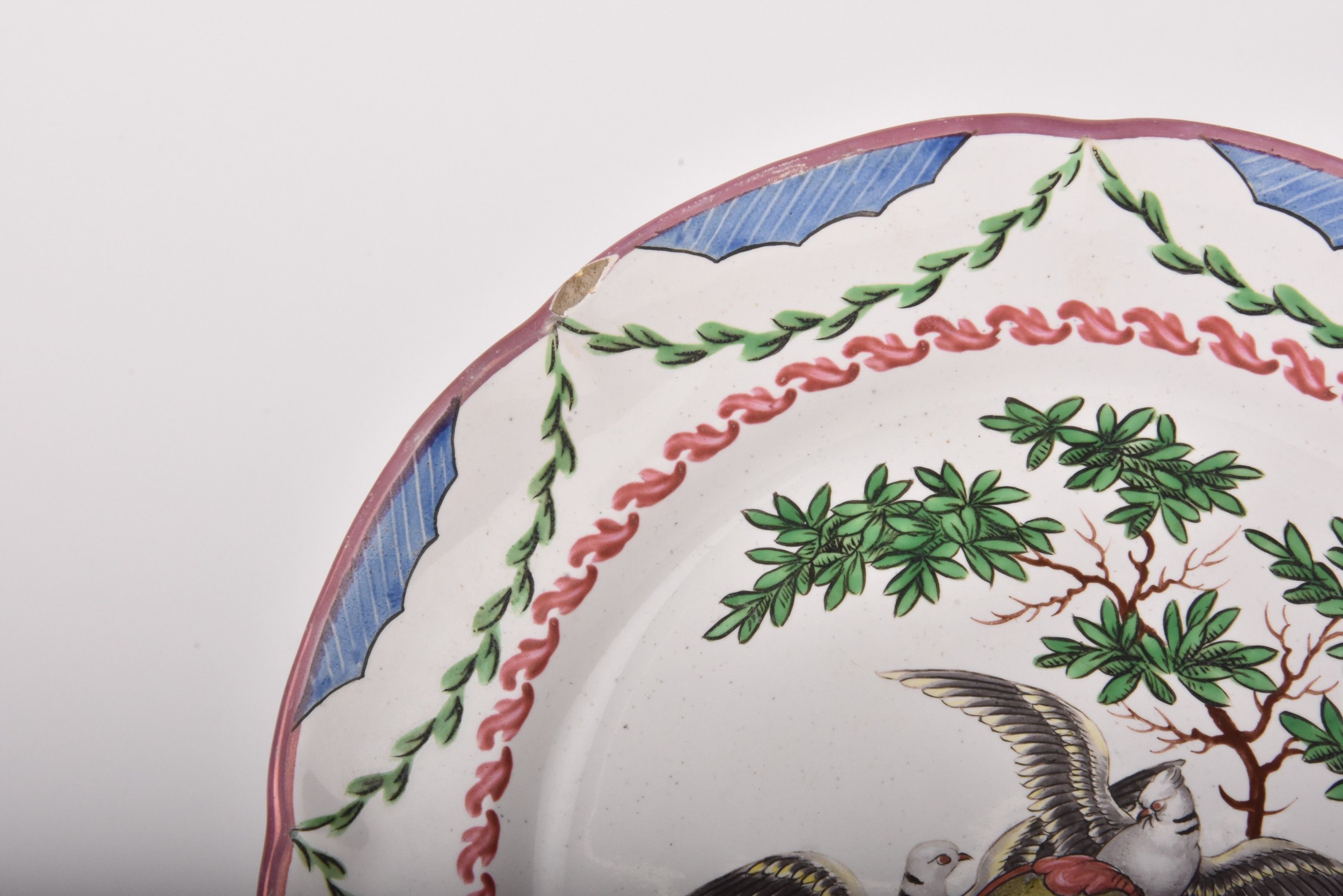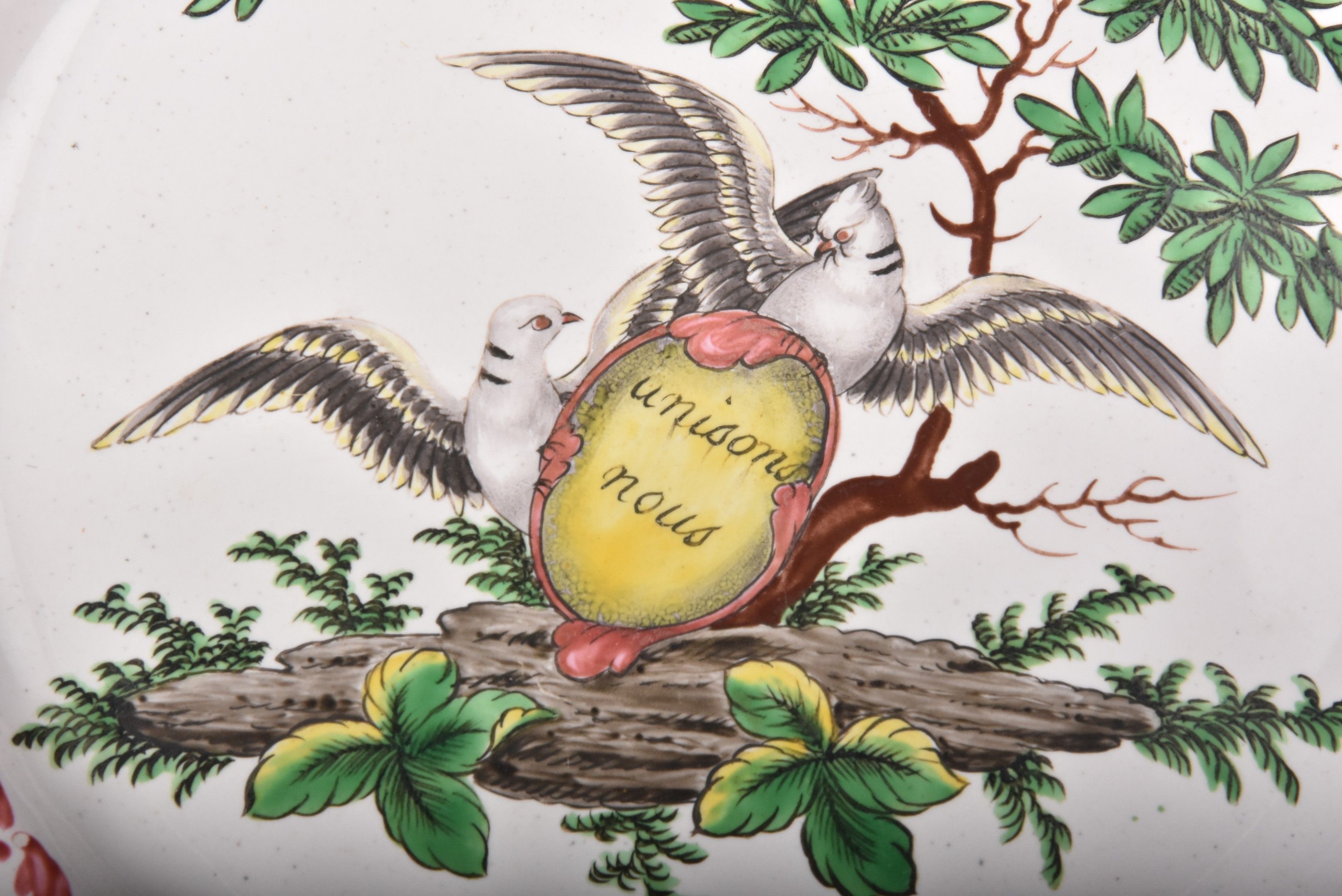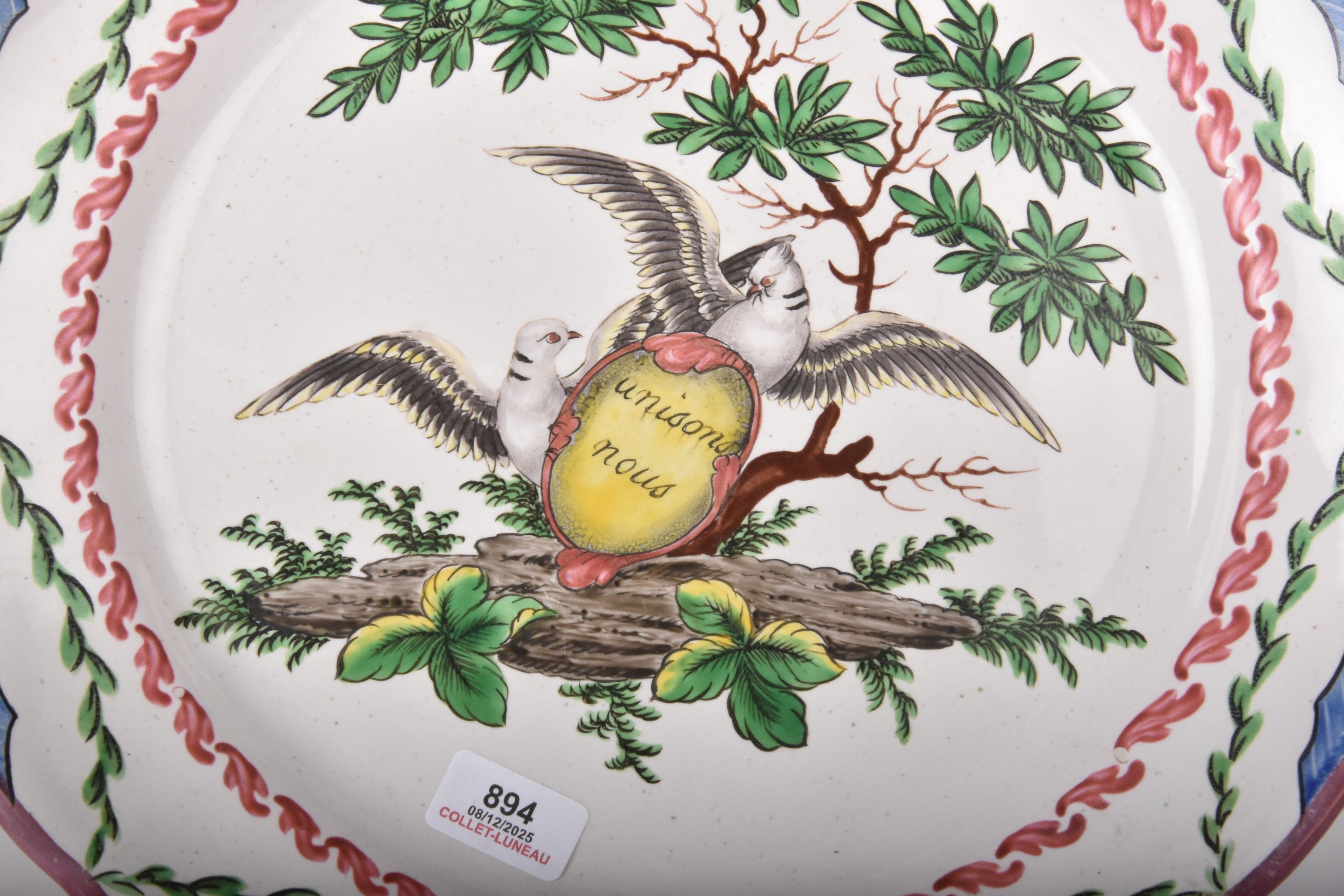 Rare earthenware wedding plate "Unisons nous", the wing richly decorated with draperies, the rim with iridescent decoration.