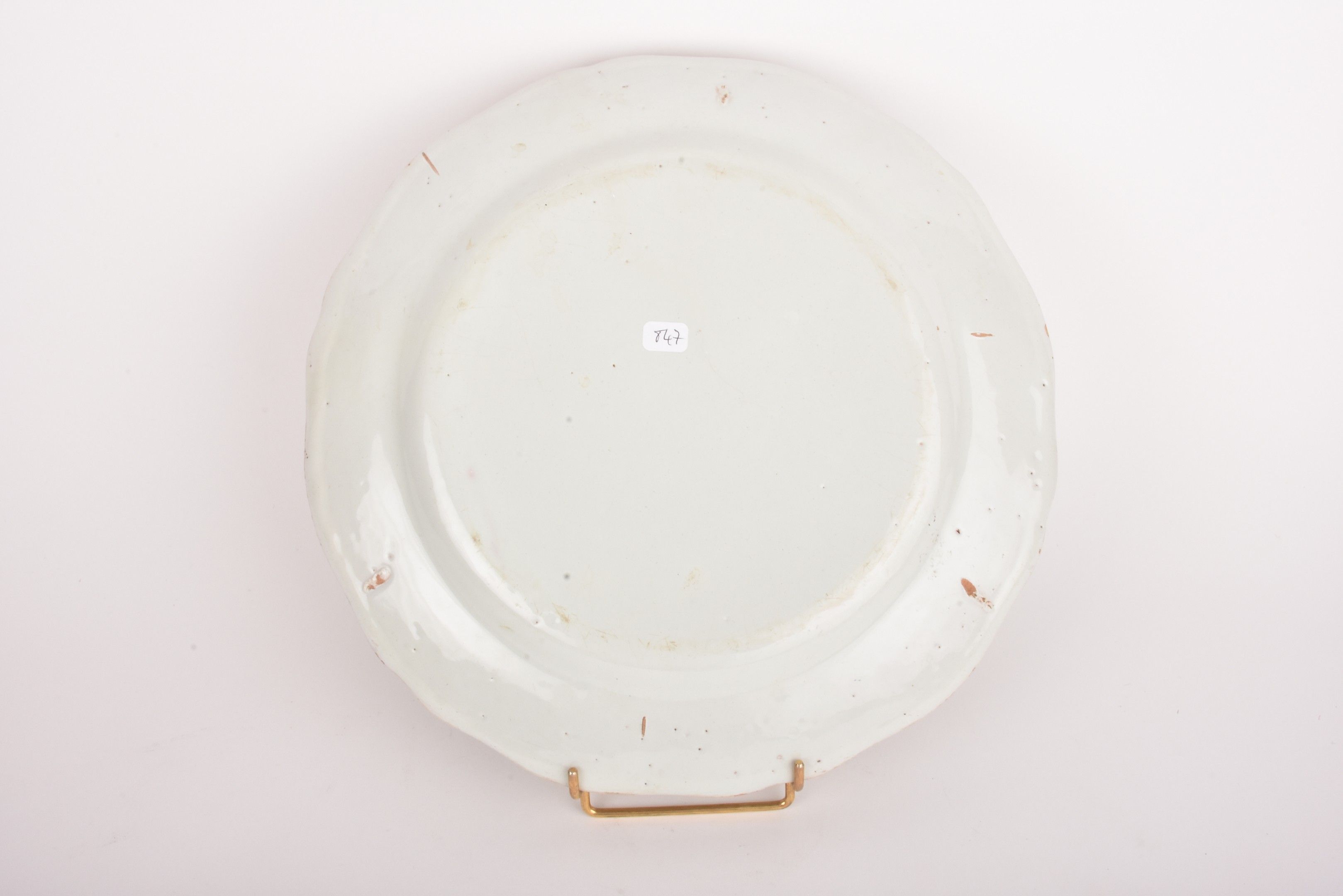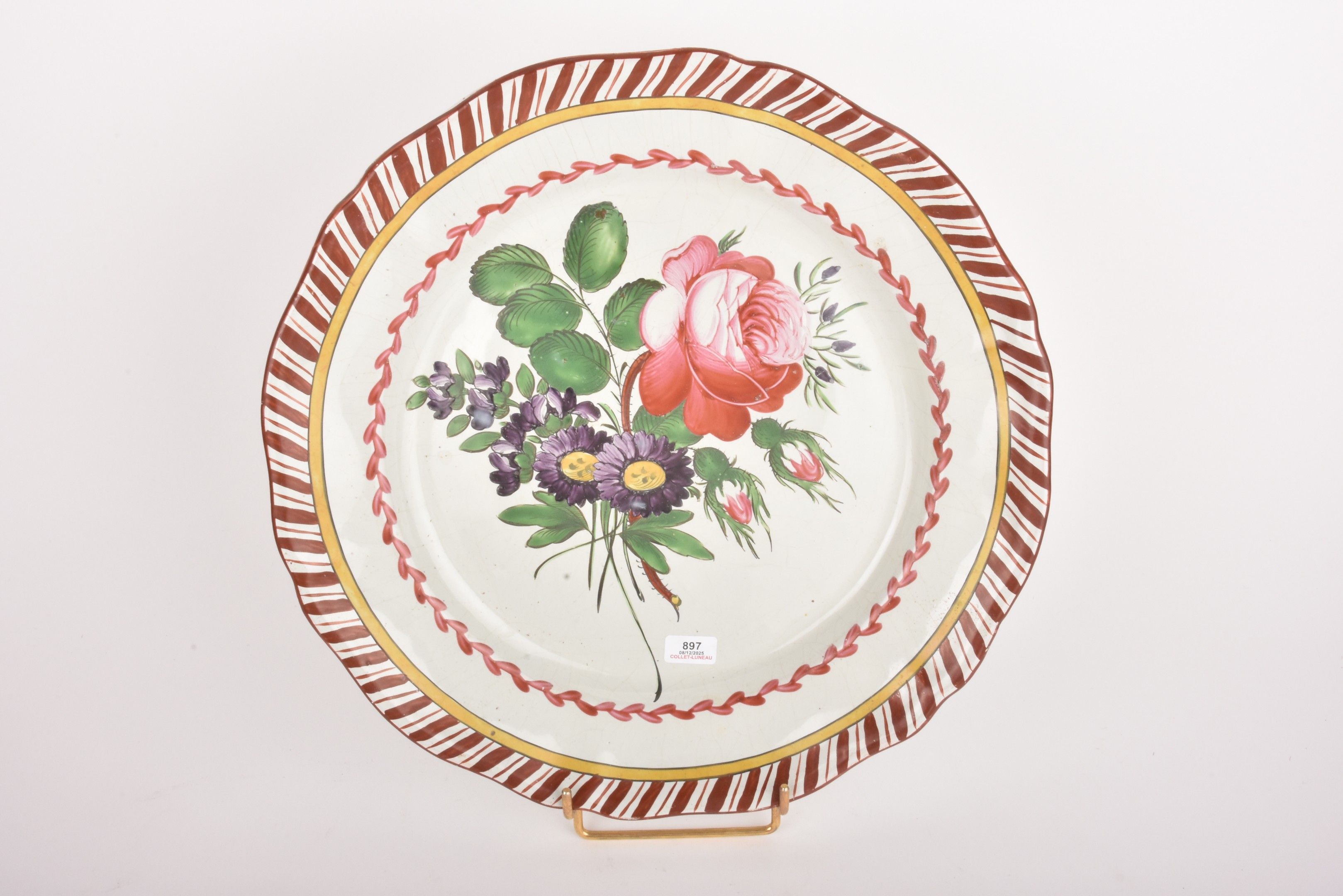 LES ISLETTES. Earthenware dish decorated with a bouquet of flowers, the wing decorated with a frieze of fillets and a frieze of stylised cat's tongues.
