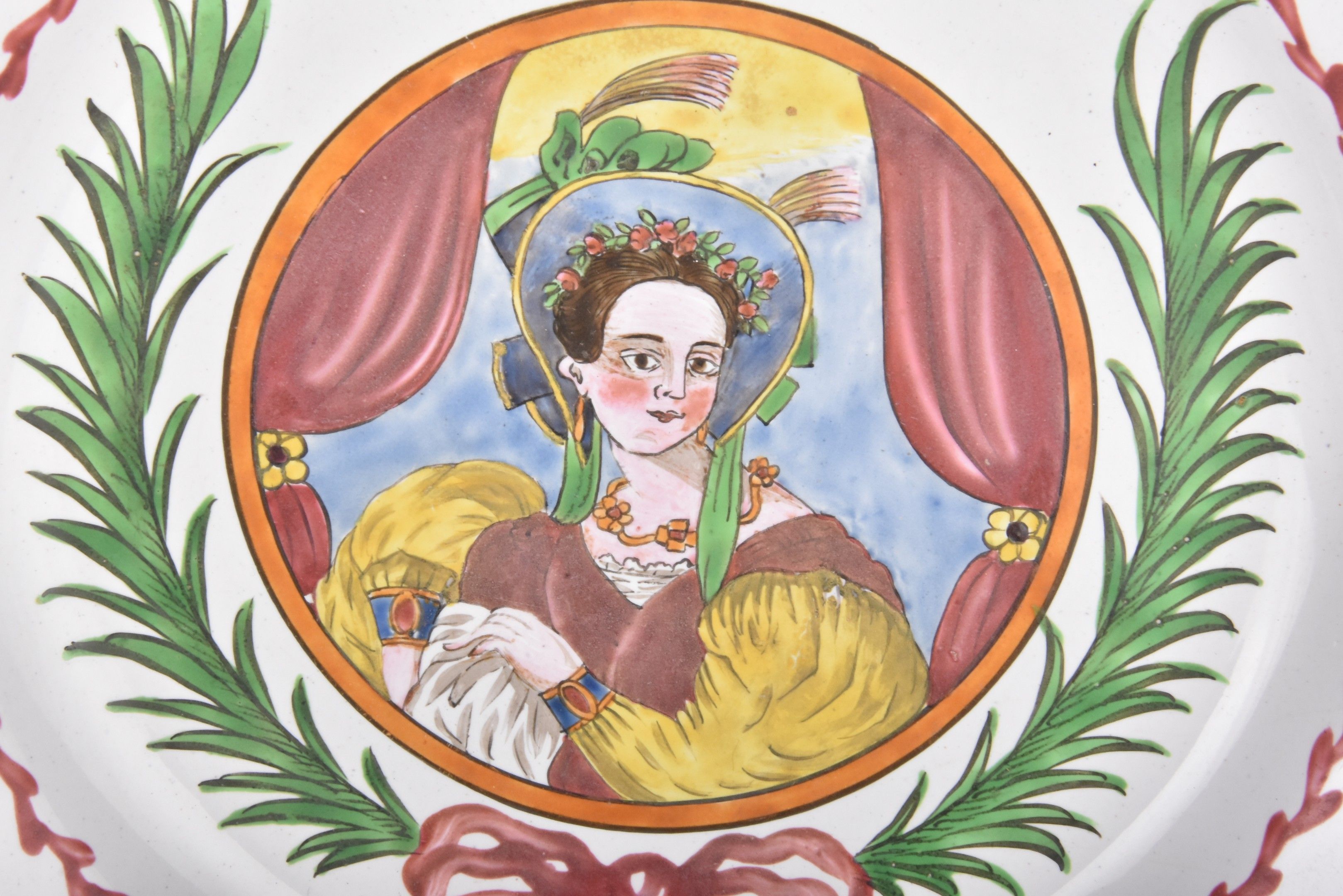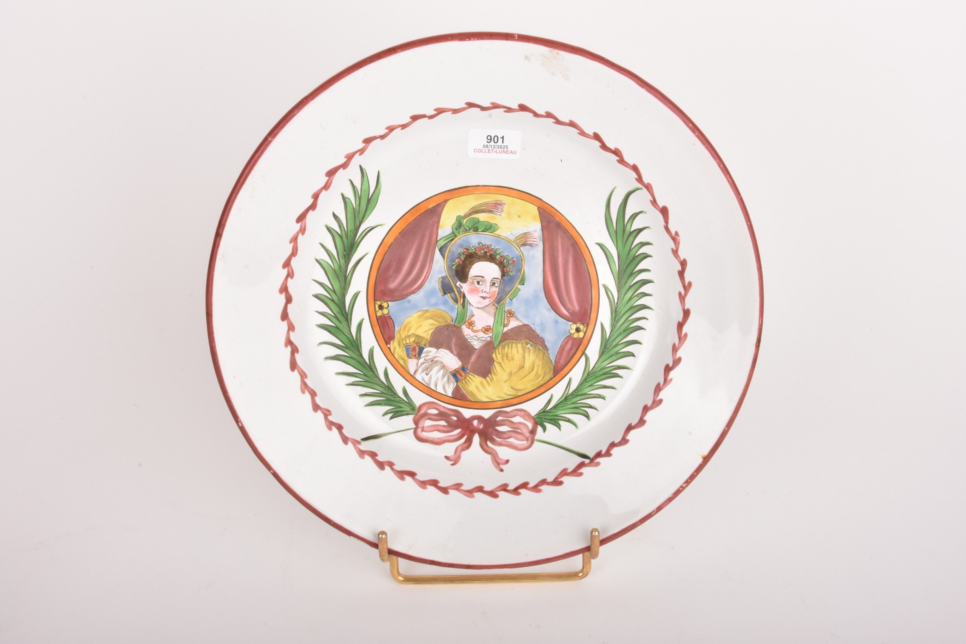 LES ISLETTES, DUPRE period. Earthenware plate decorated with a portrait of a young elegant woman (Mme Bernard?).