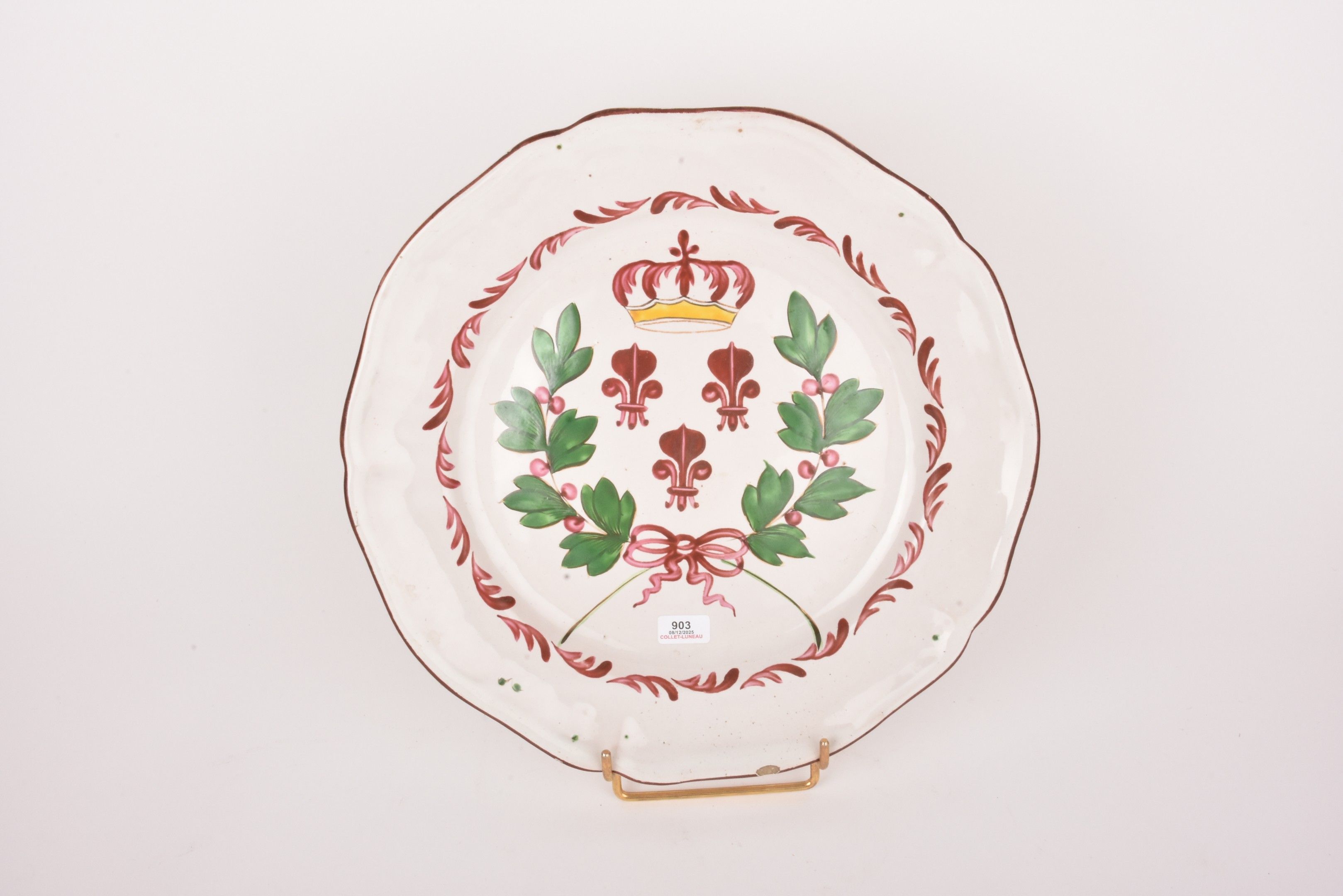 LES ISLETTES. Earthenware dish decorated with three fleurs-de-lys surmounted by a crown.