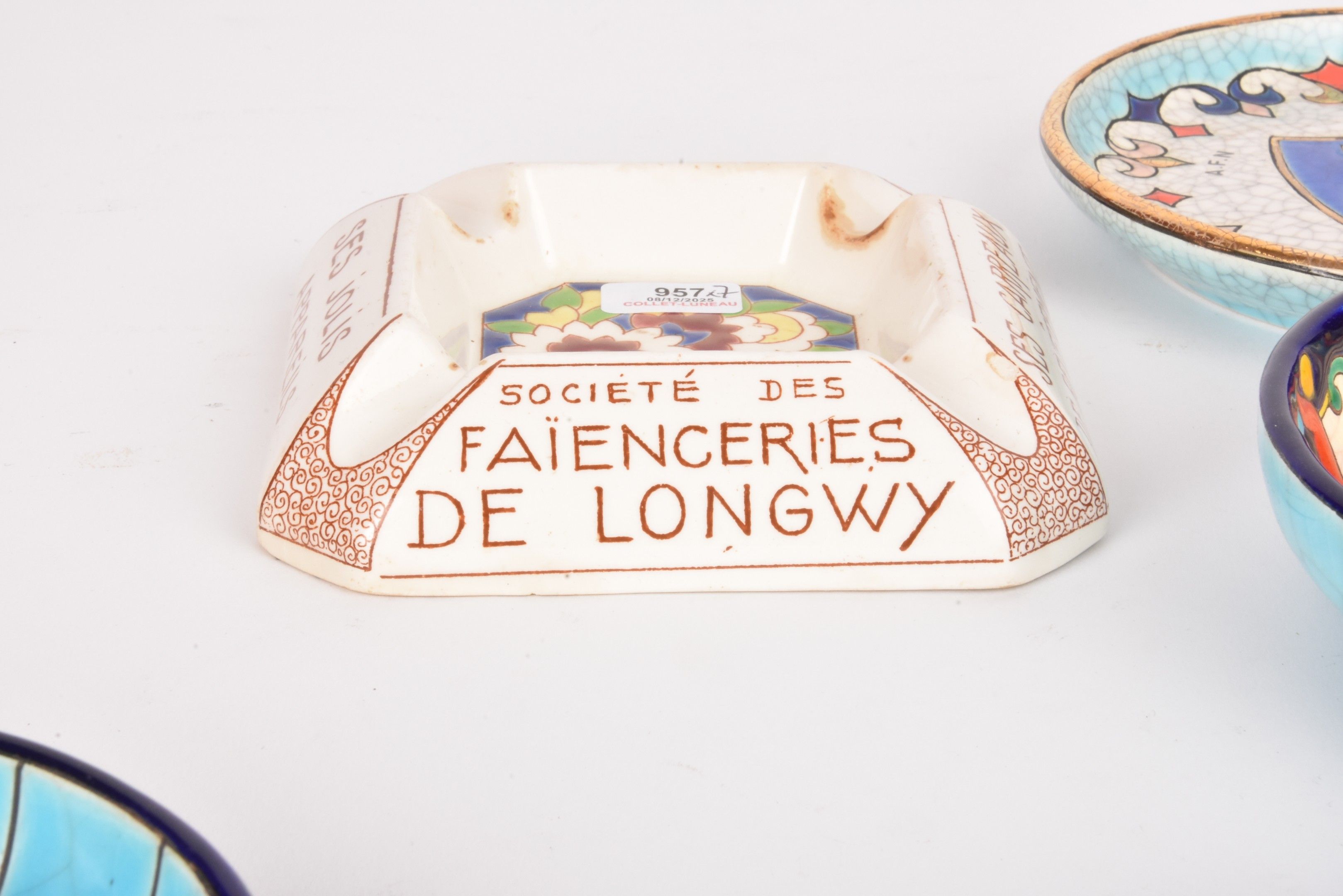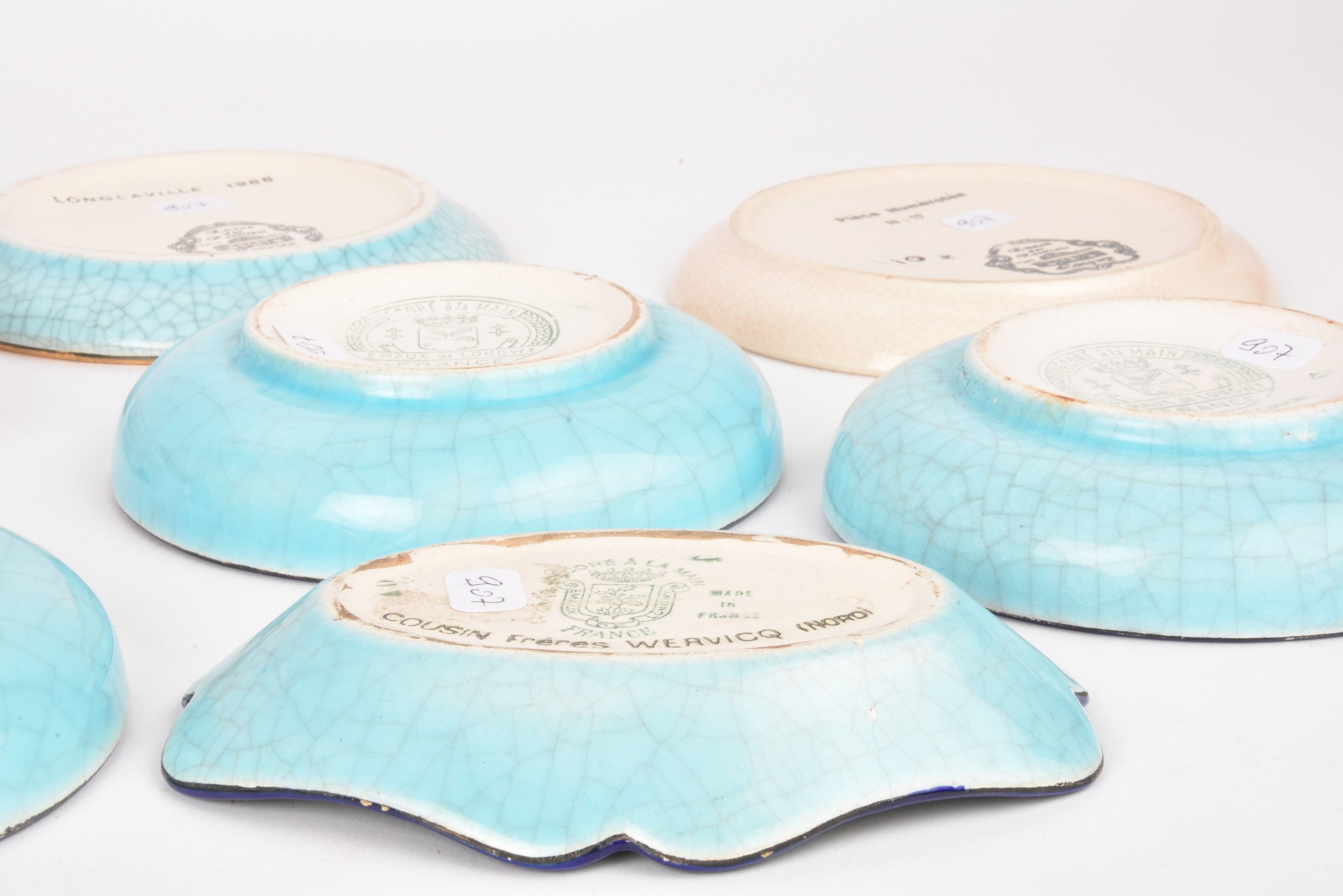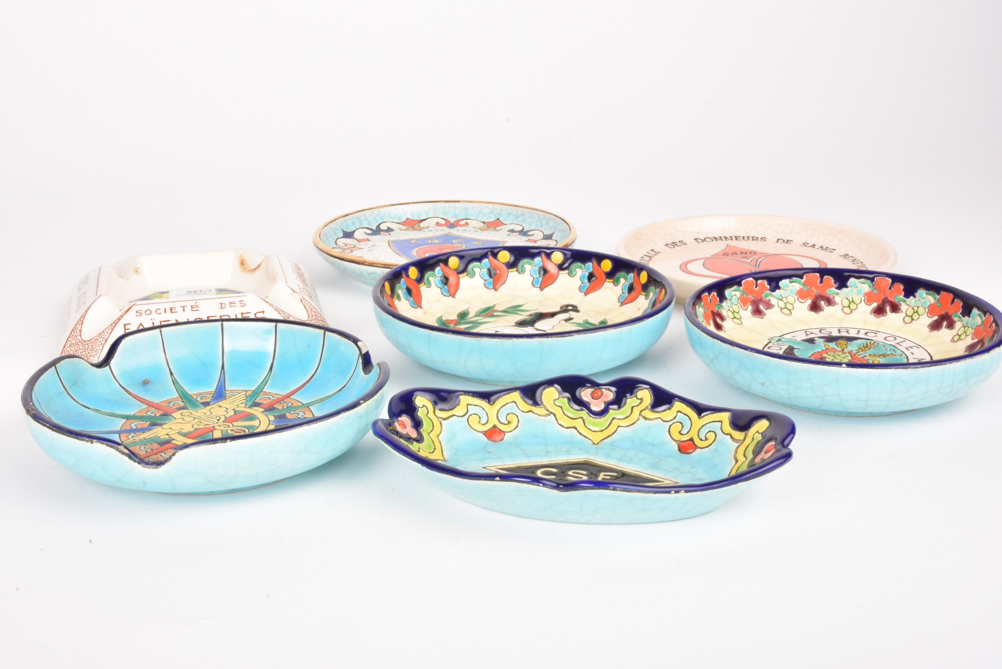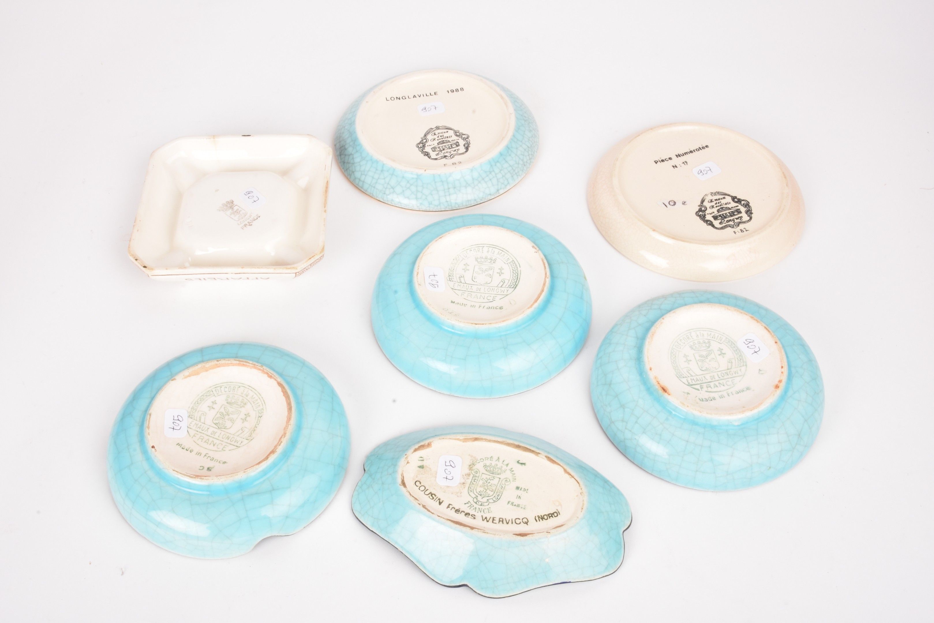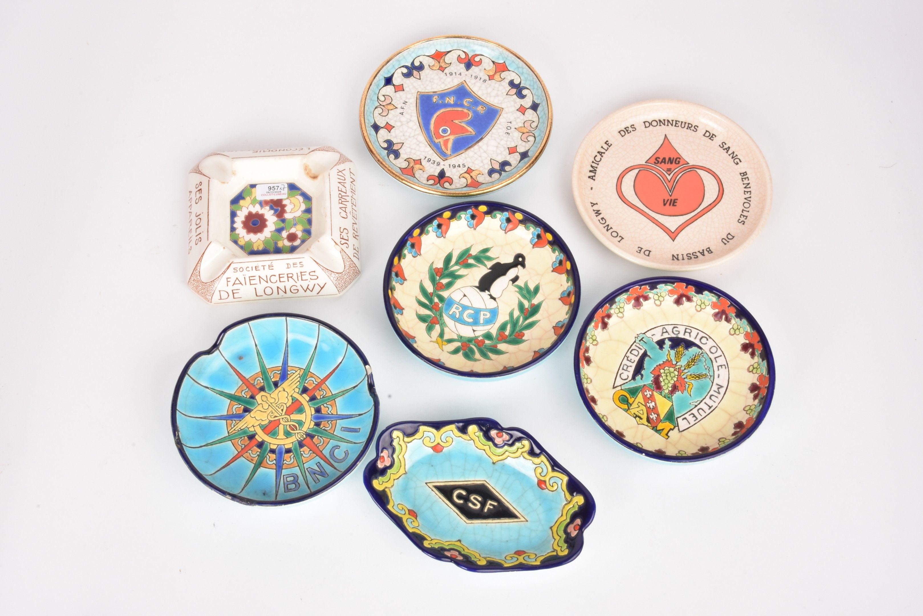 LONGWY. Set of 7 glazed earthenware advertising ashtrays. One glued back.