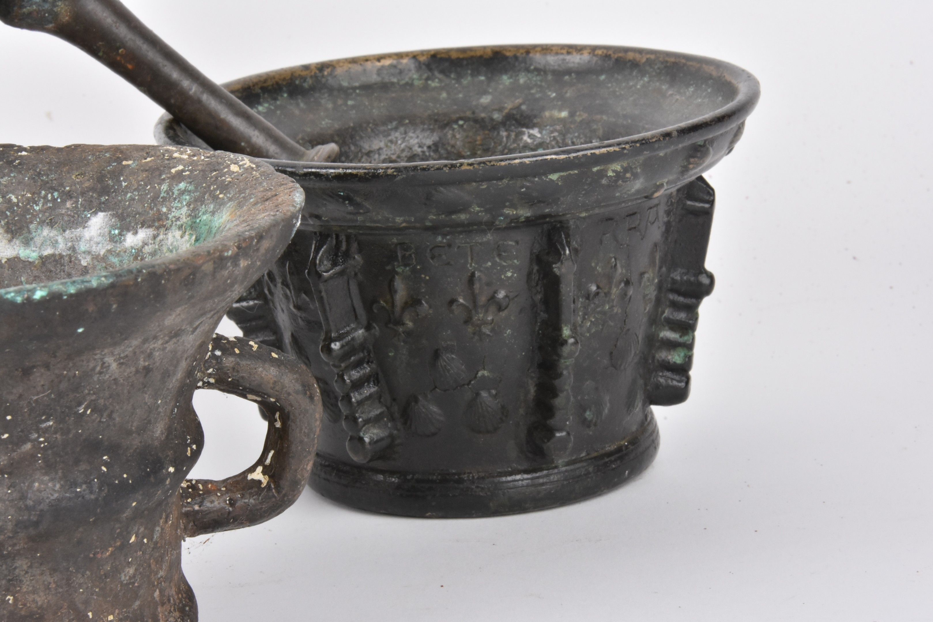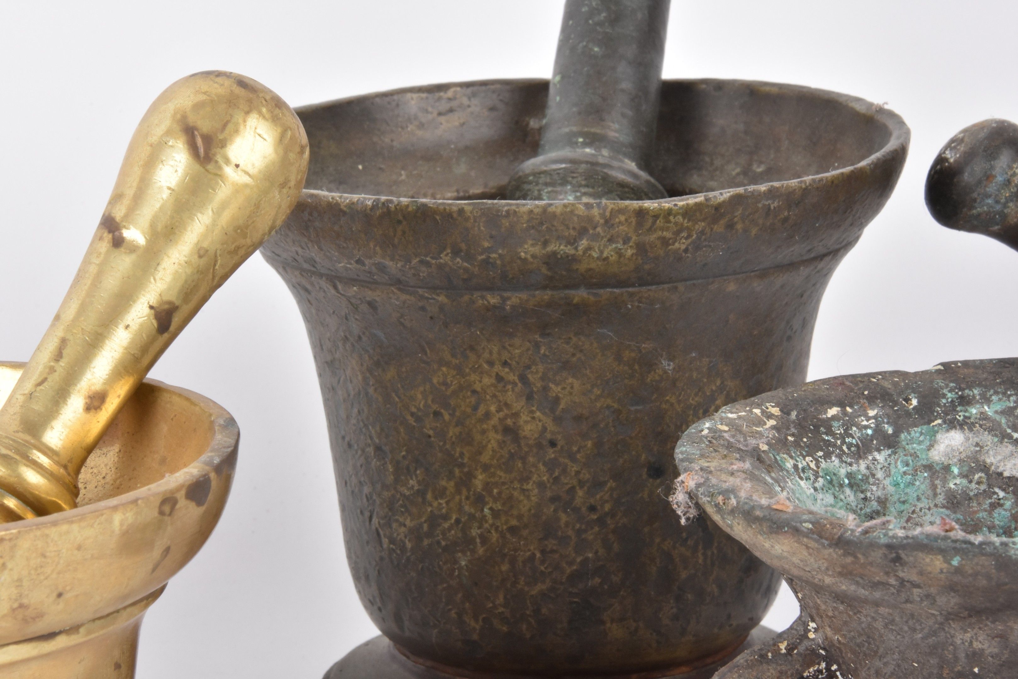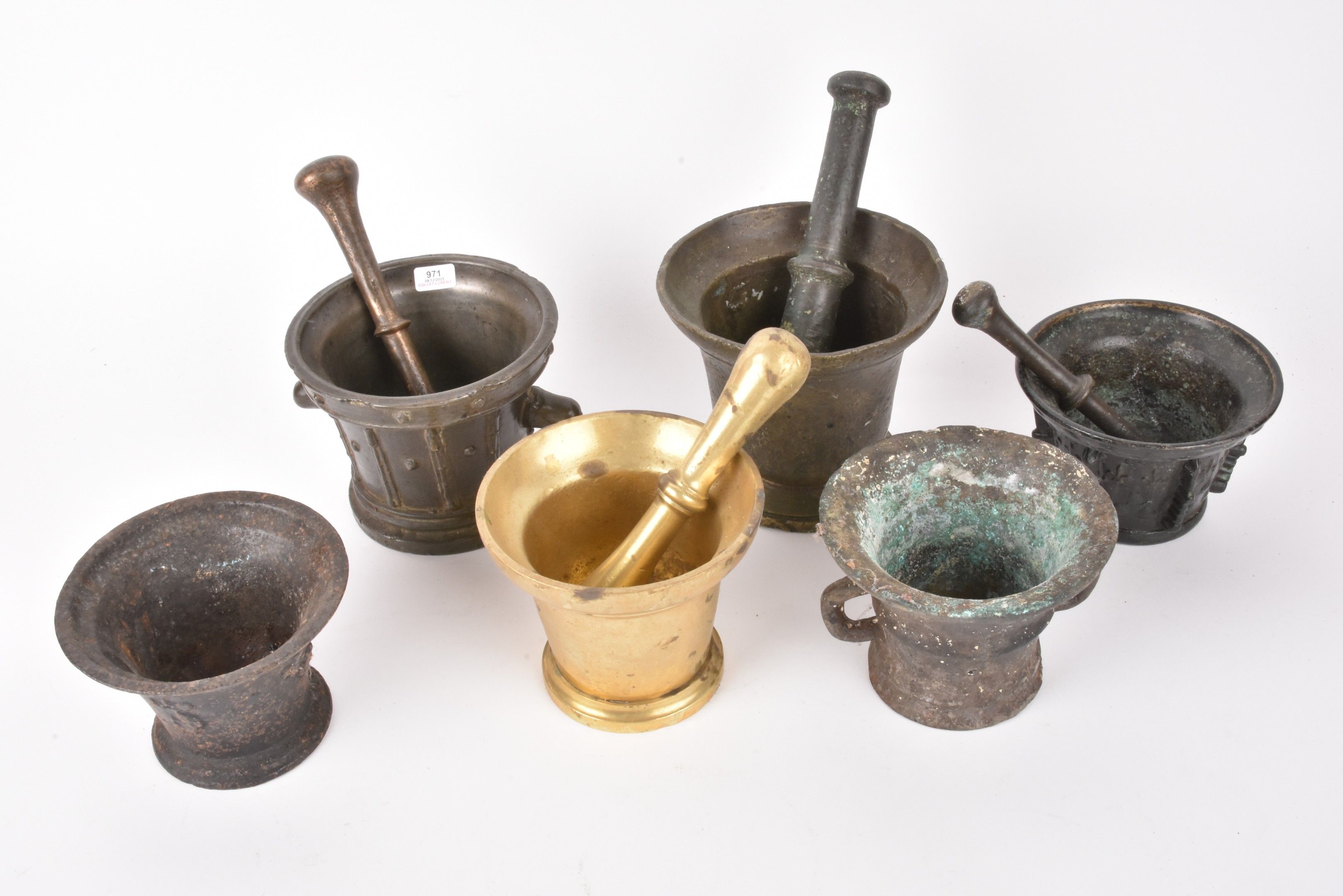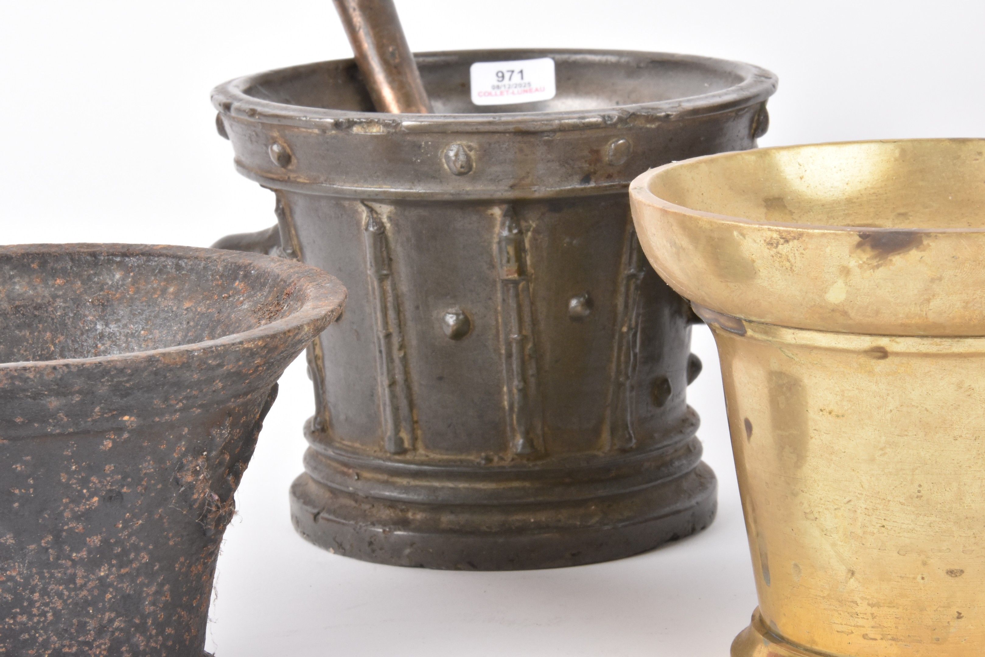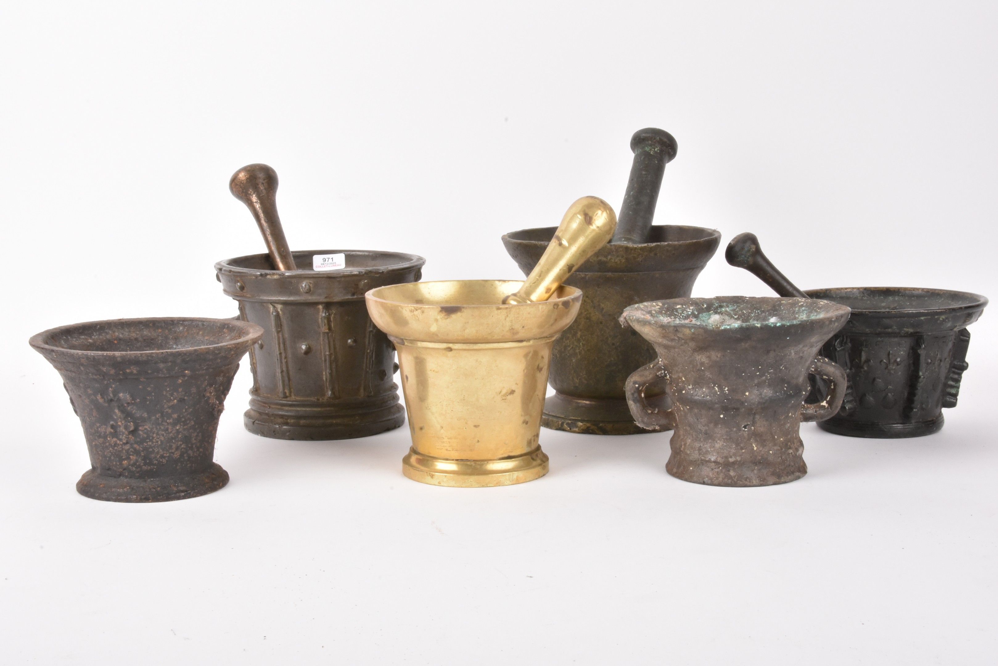 Set of four bronze mortars in the Haute Epoque style and two cast-iron mortars (one pierced) H. 9 to 12.5 cm