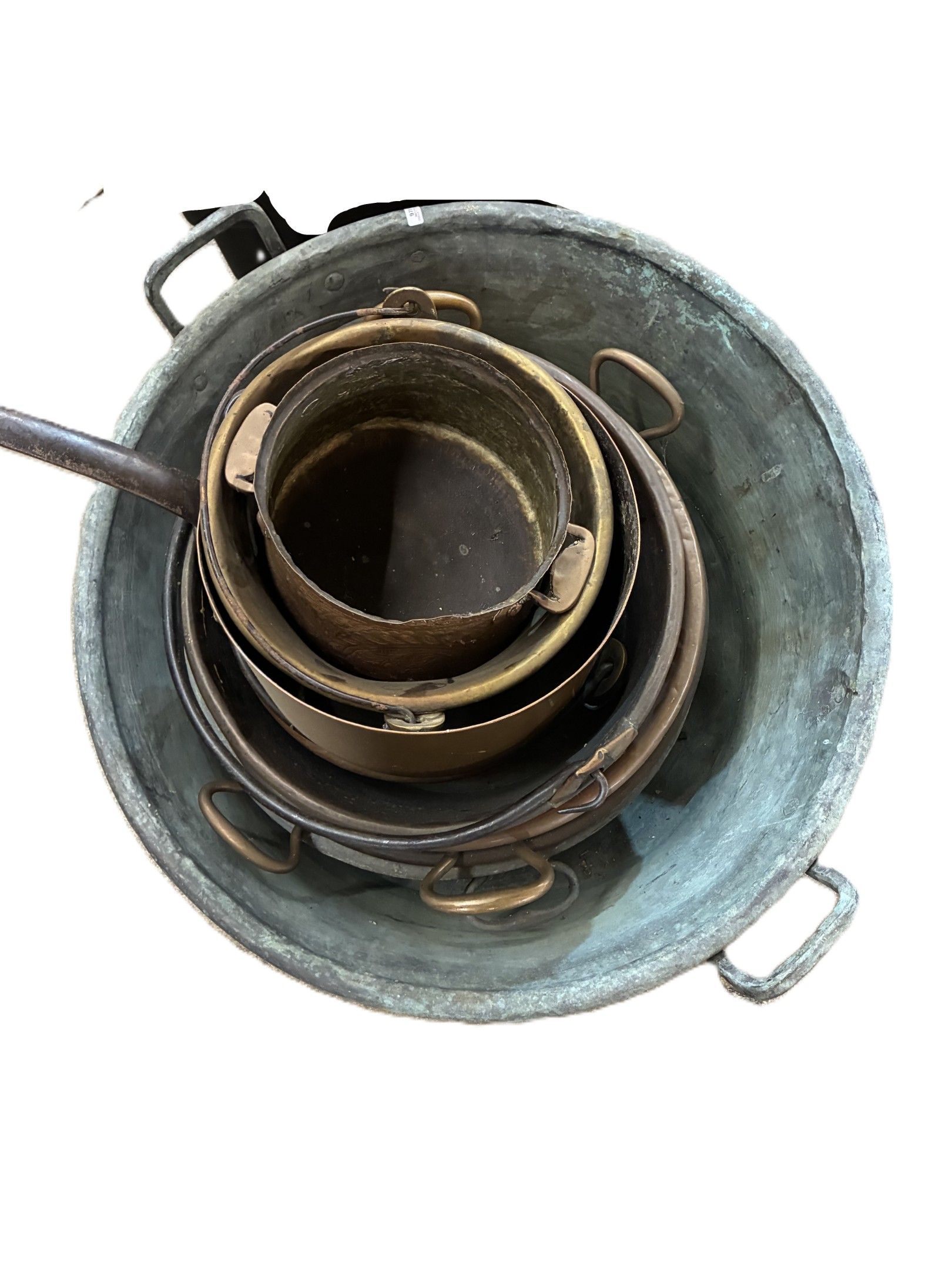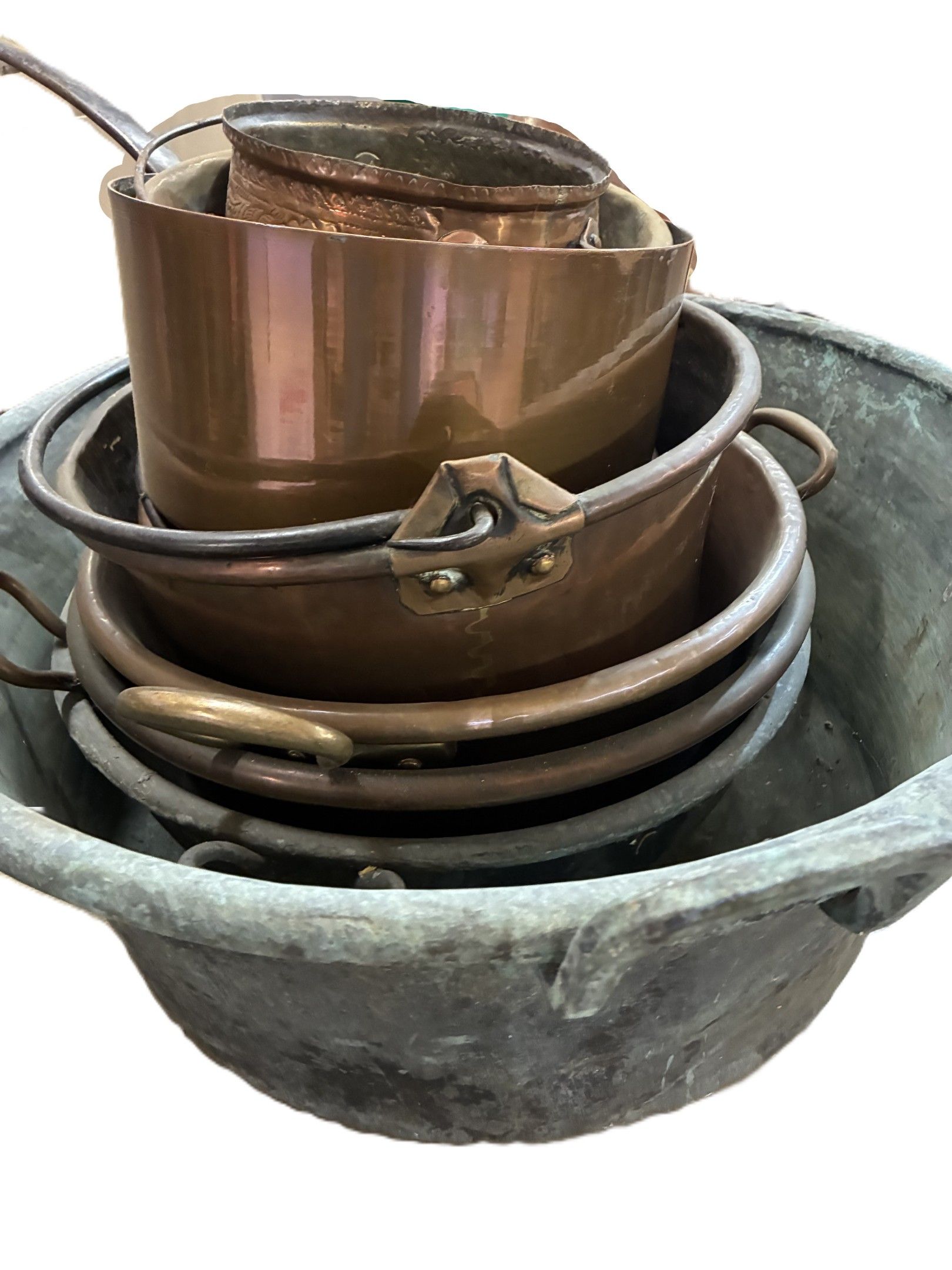 Important set of copperware, cauldrons, jam pans, fish kettles and saucepans ....