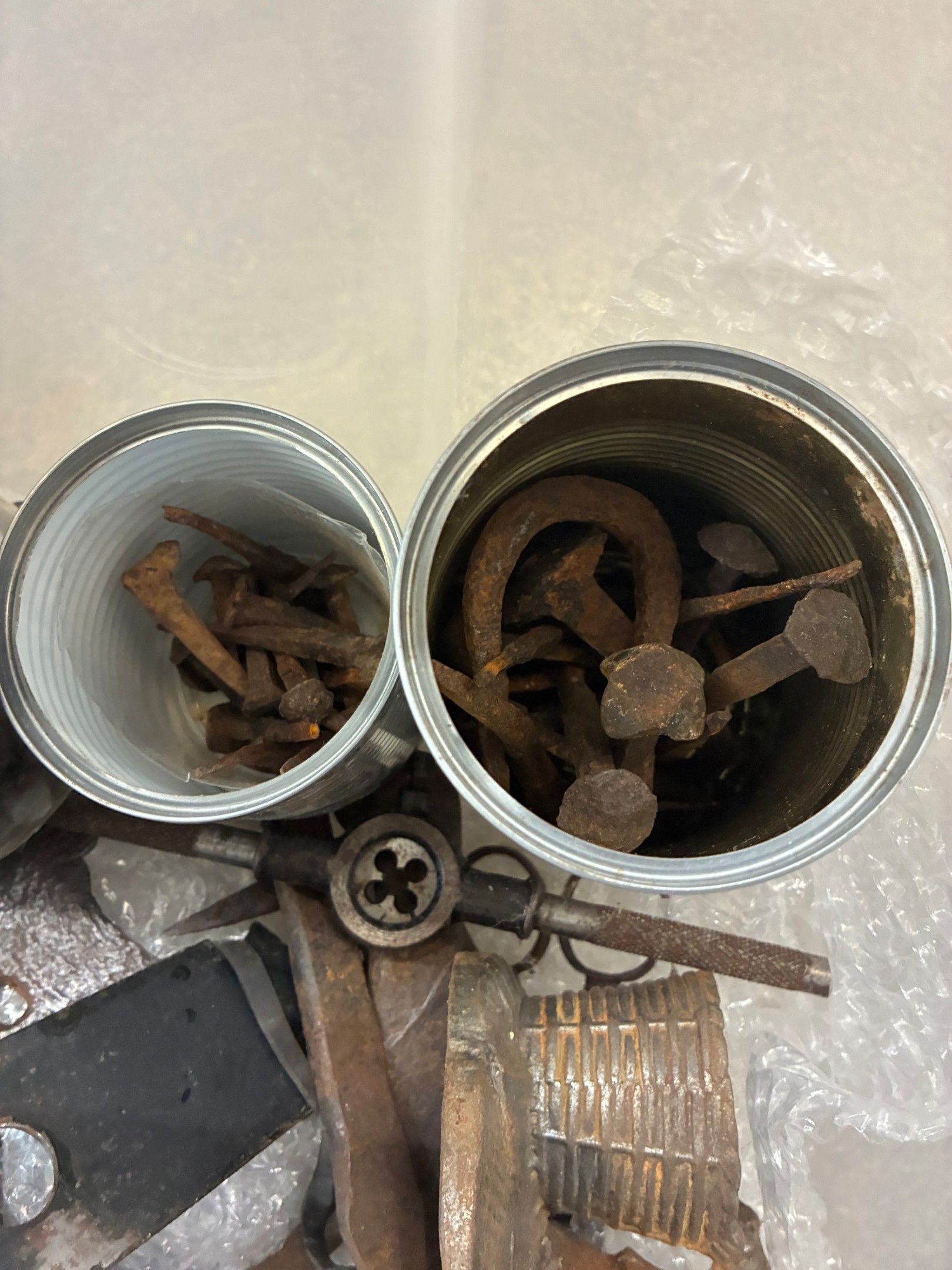 Miscellaneous lot including waffle irons, folk art tools, antique nails and other items