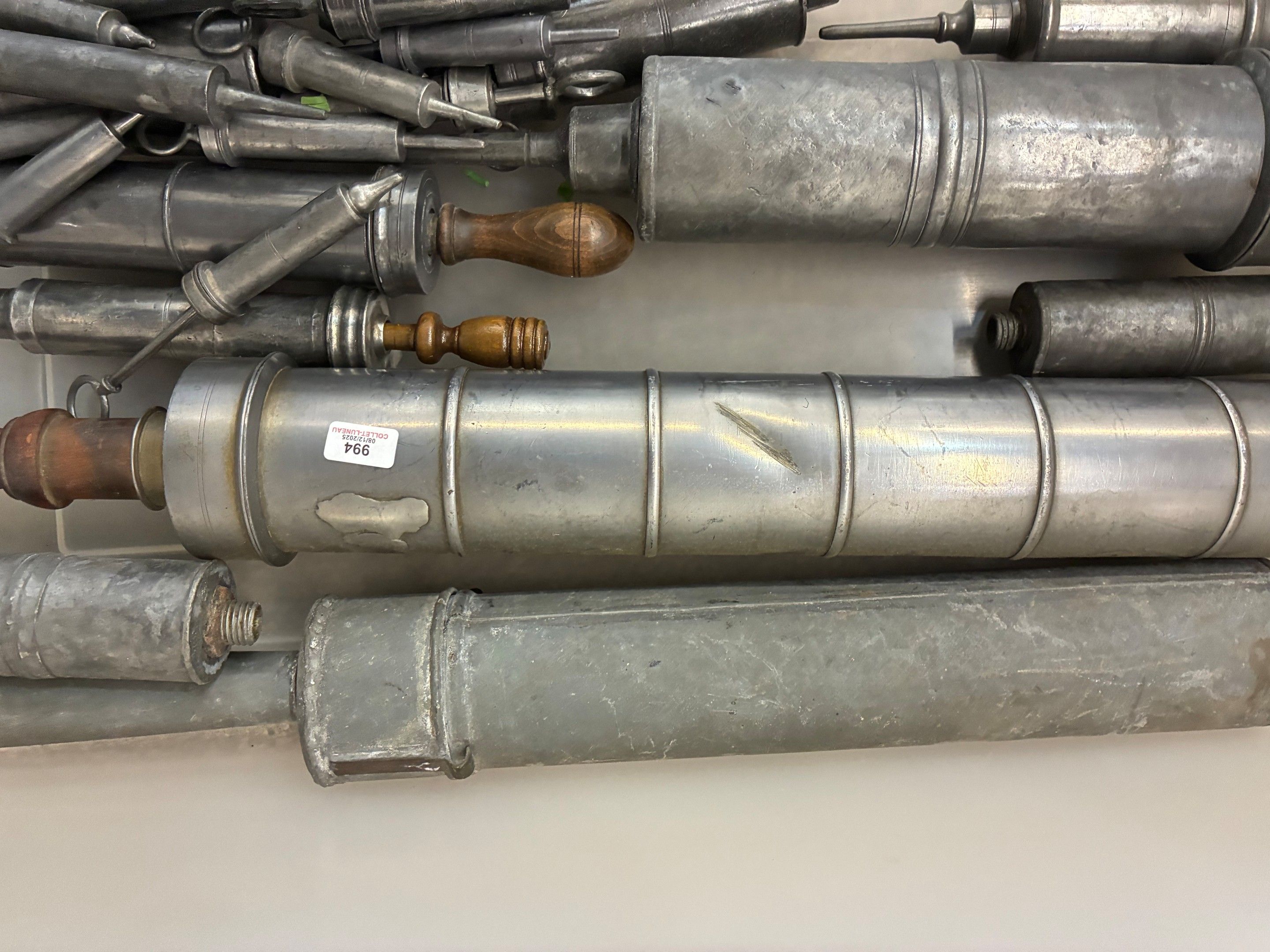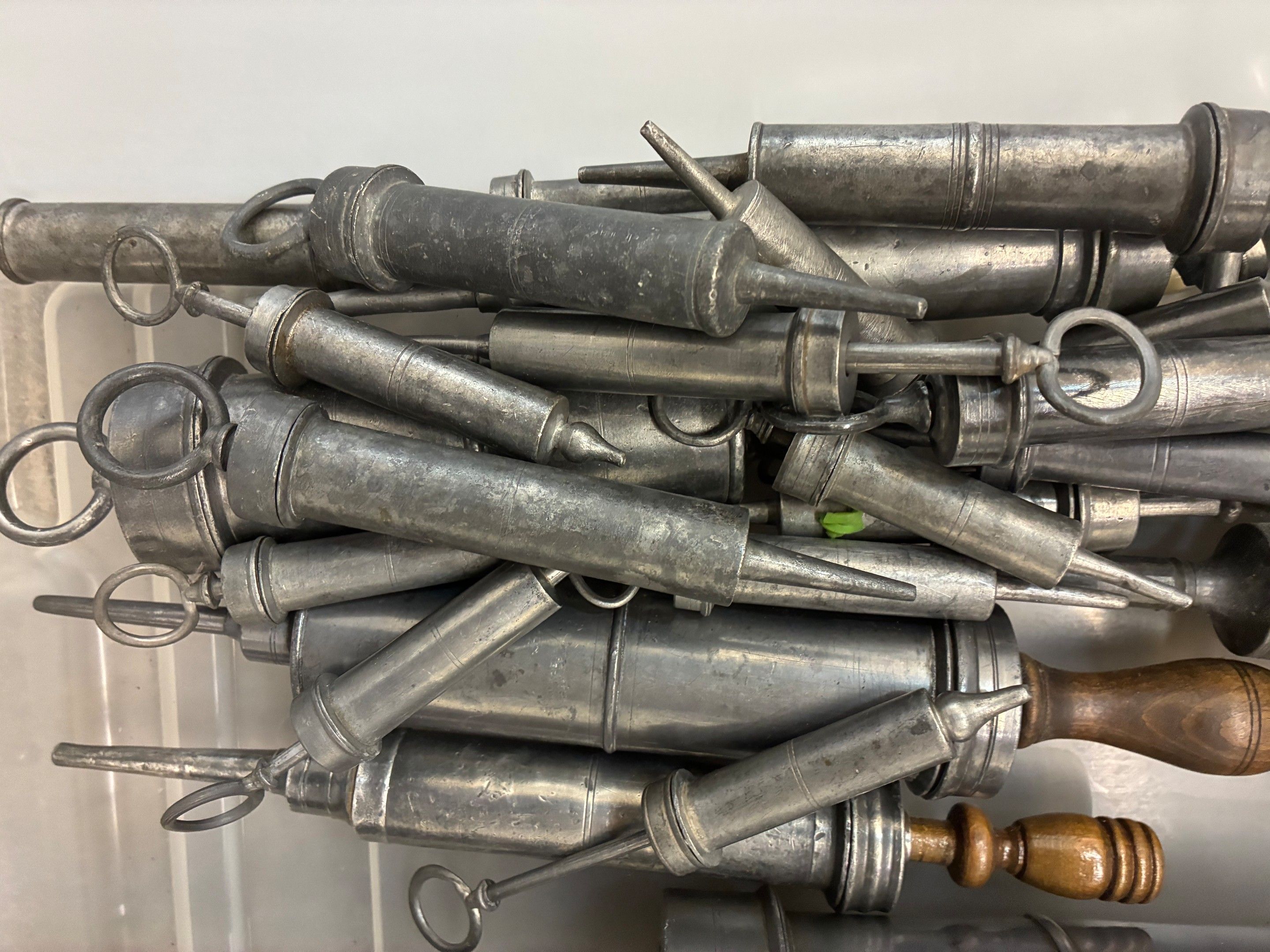 Set of 31 small and large pewter clyster syringes, 19th century