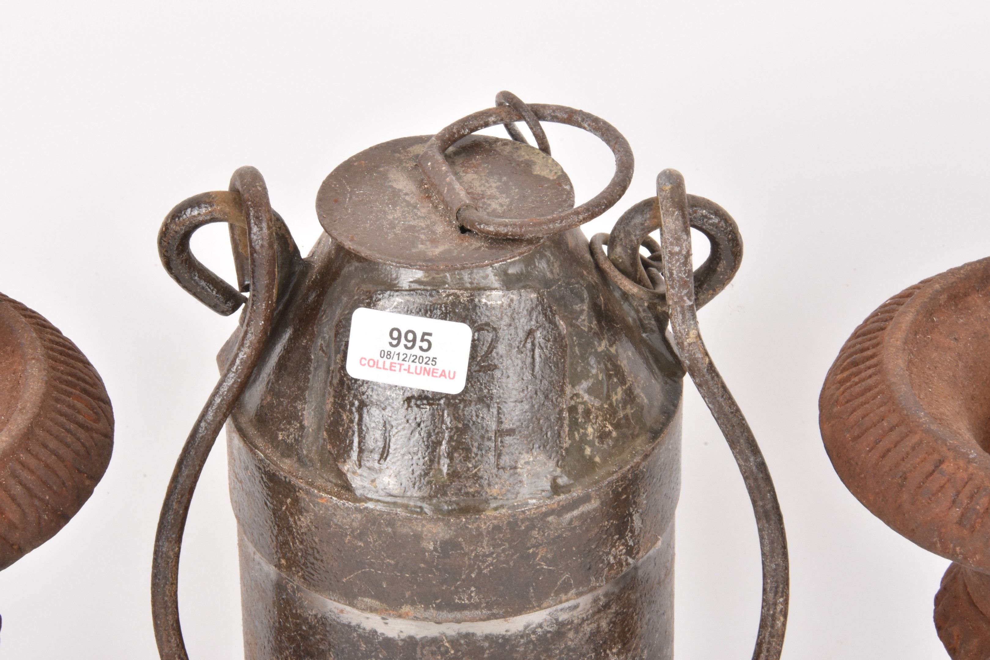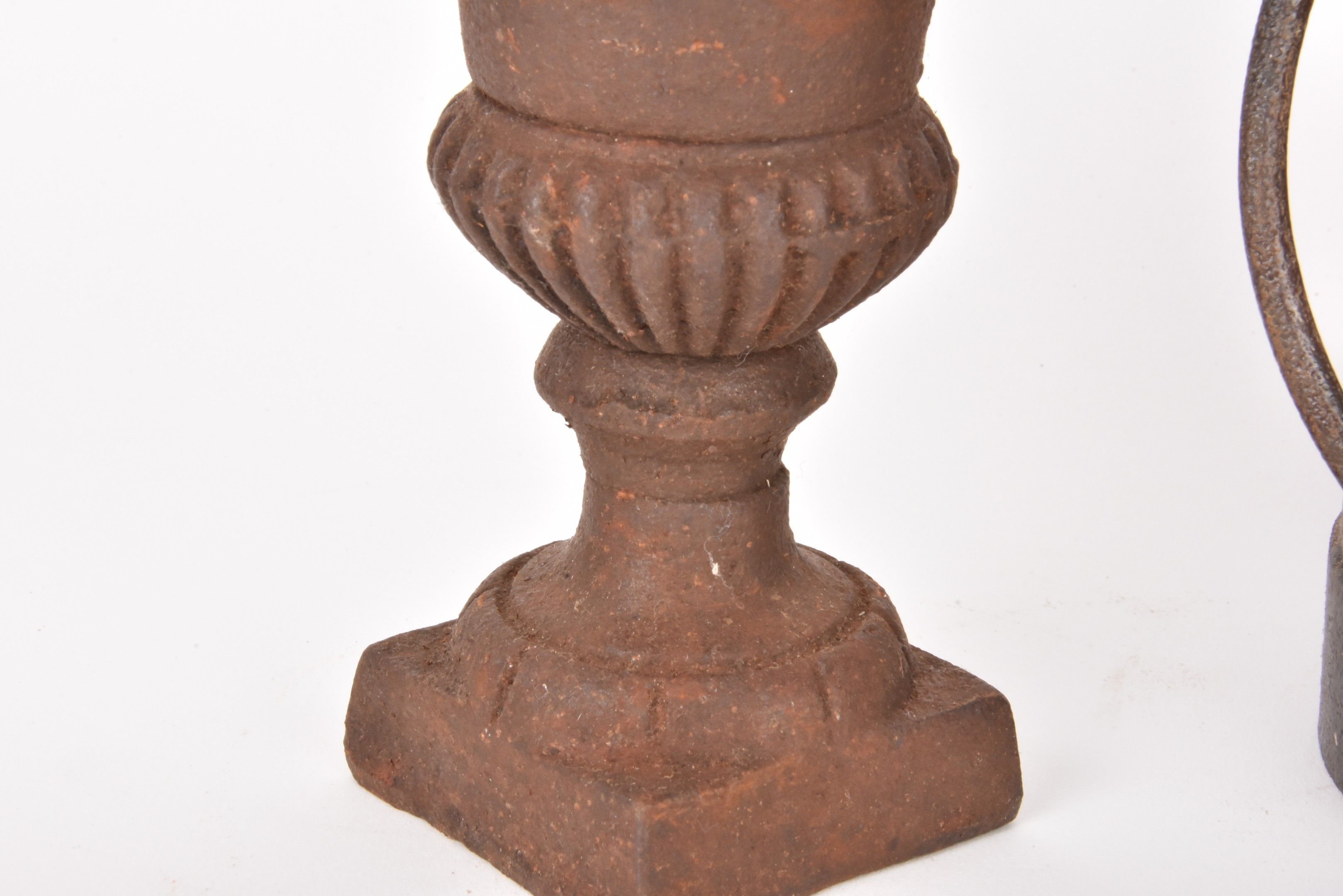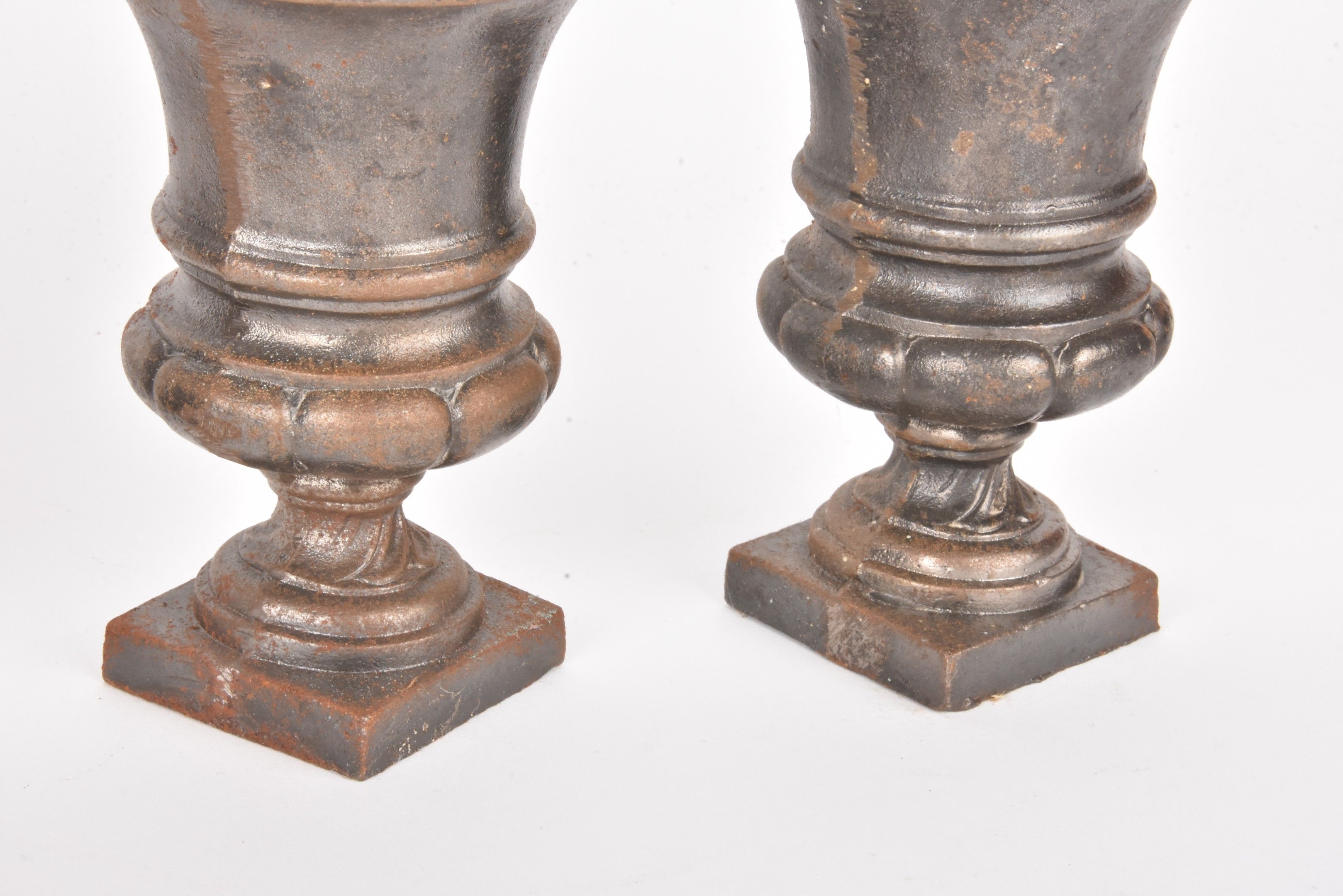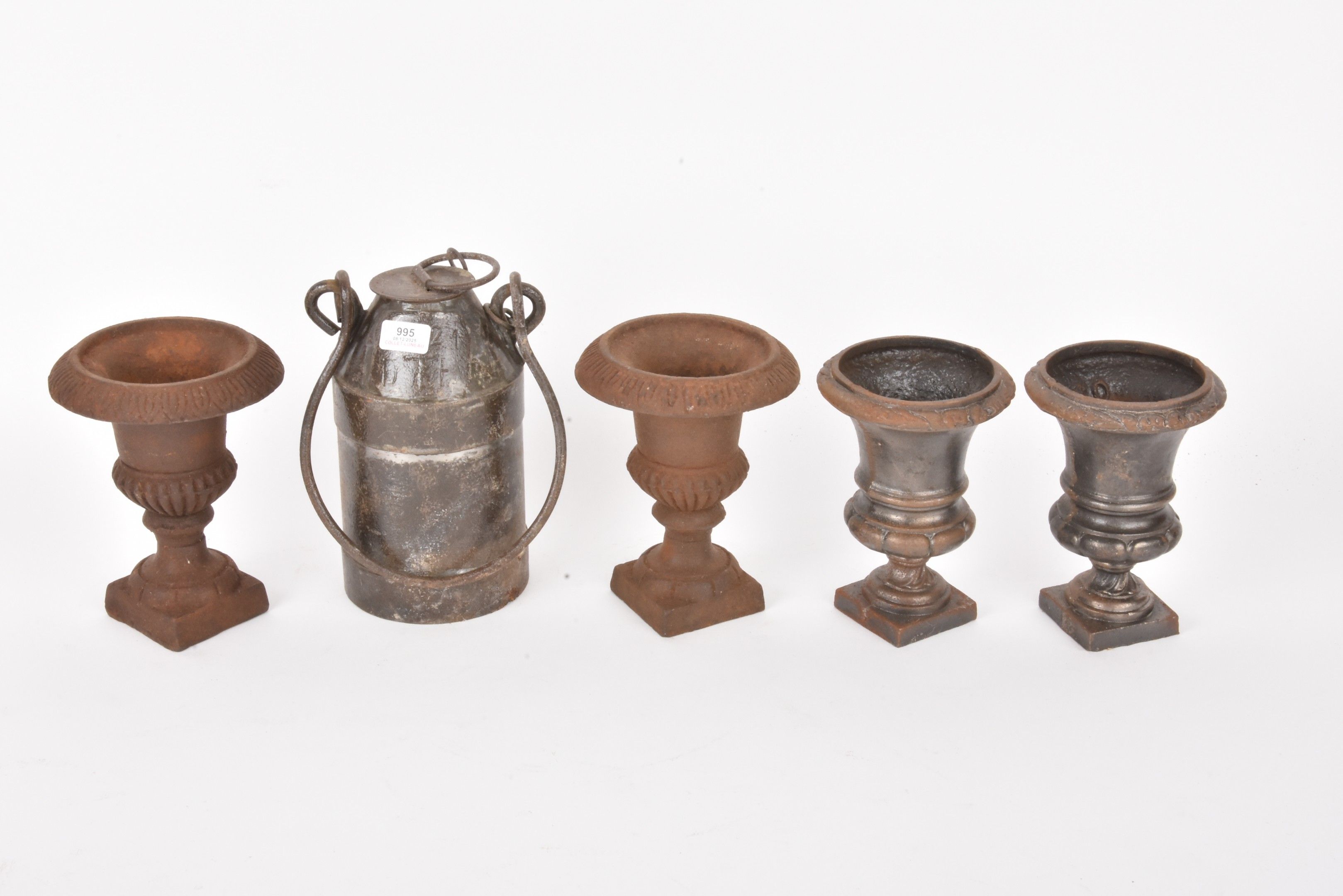 2 pairs of small cast-iron Medici vases H: 12.5cm and H: 13cm. A miniature metal canister is included.