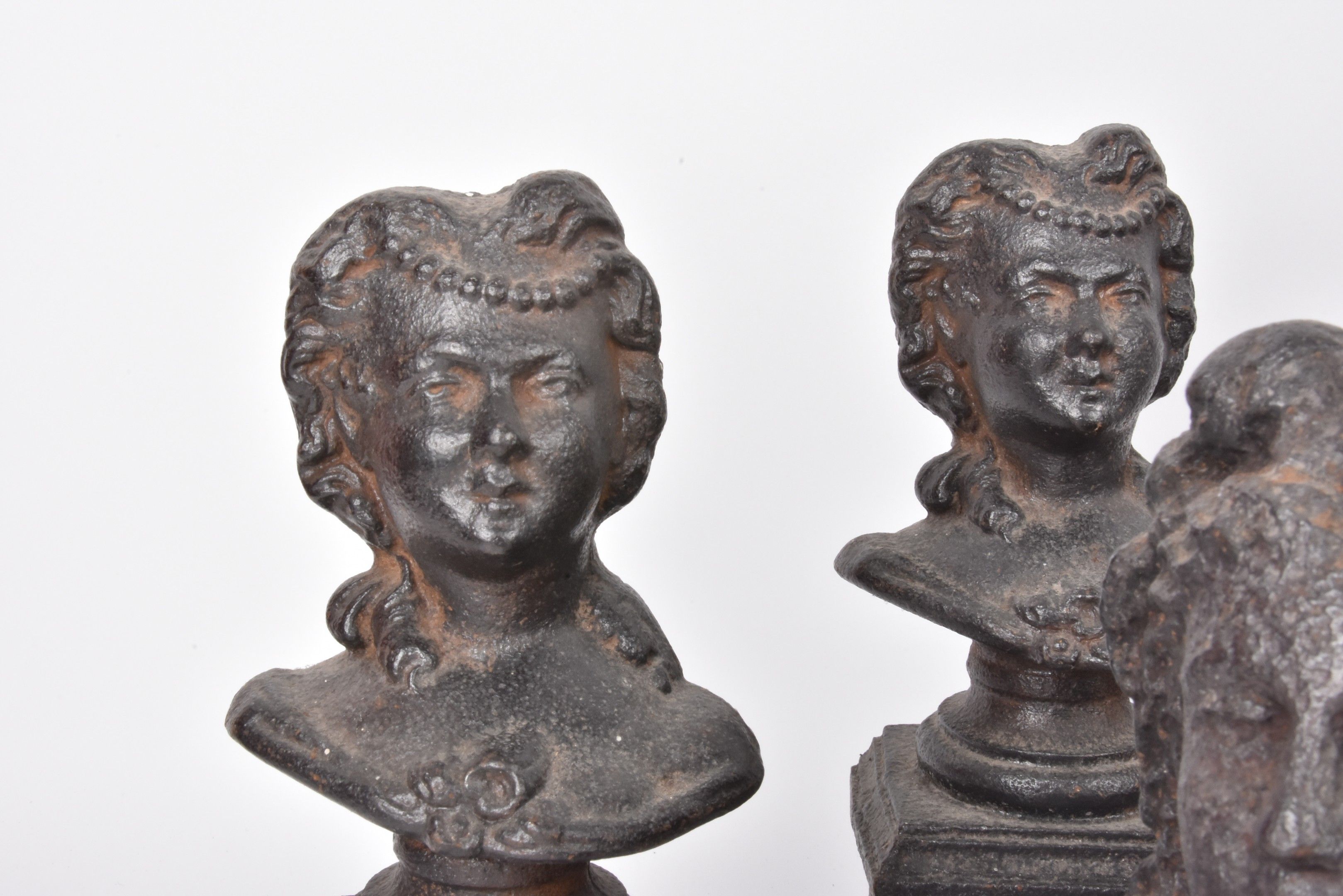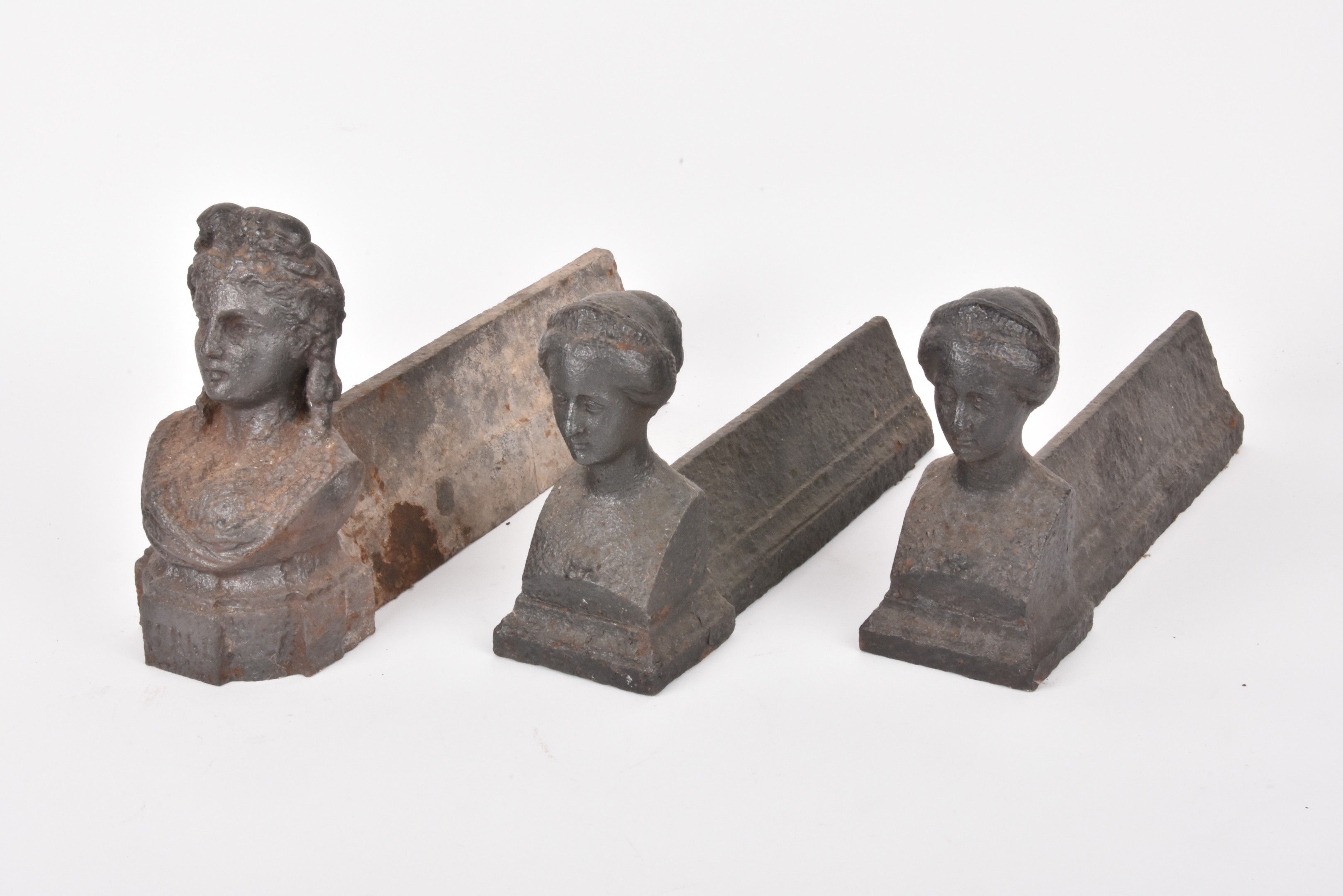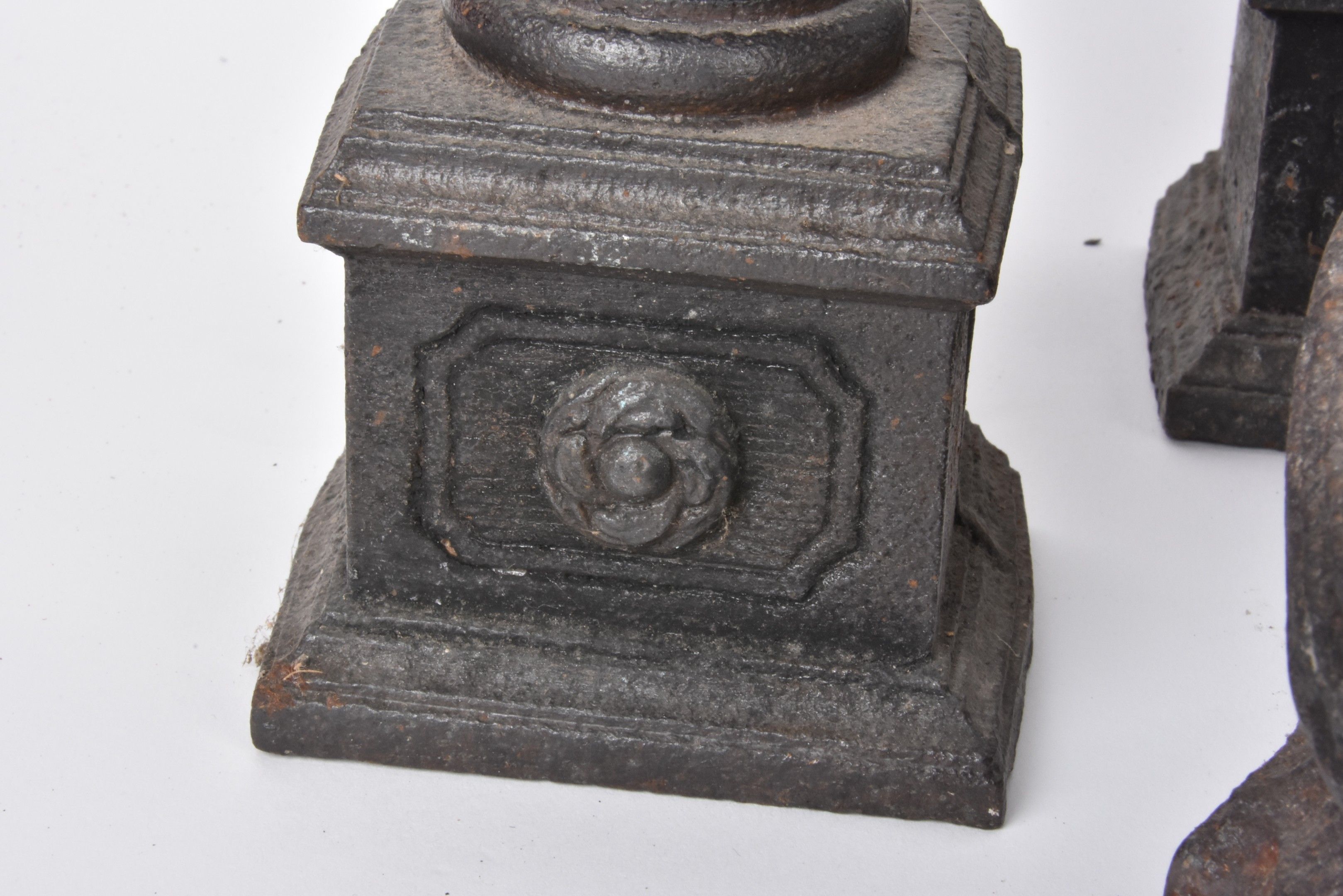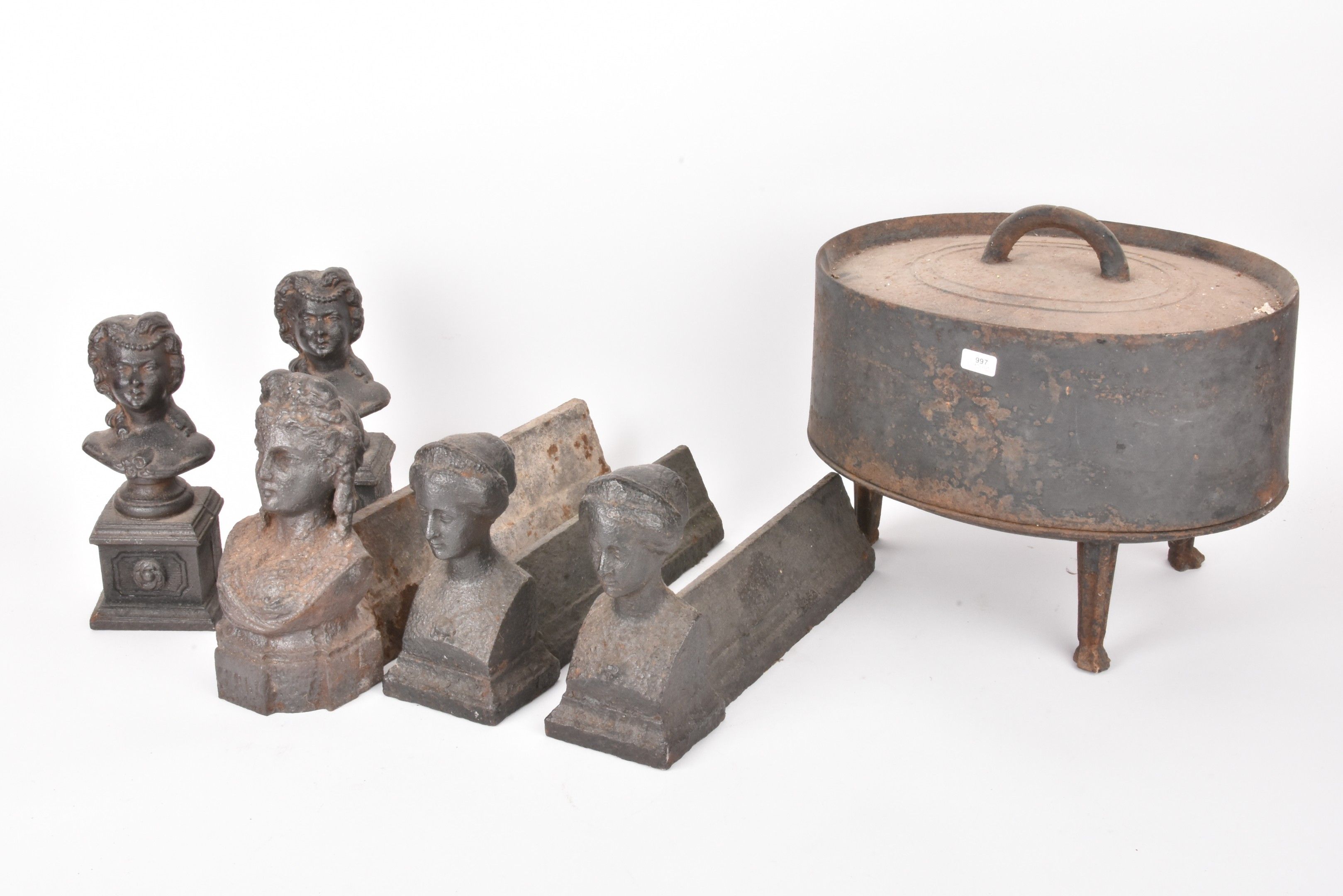 Batch of cast iron objects including a covered casserole dish, a pair of andirons, a pair of andirons and an andiron.
