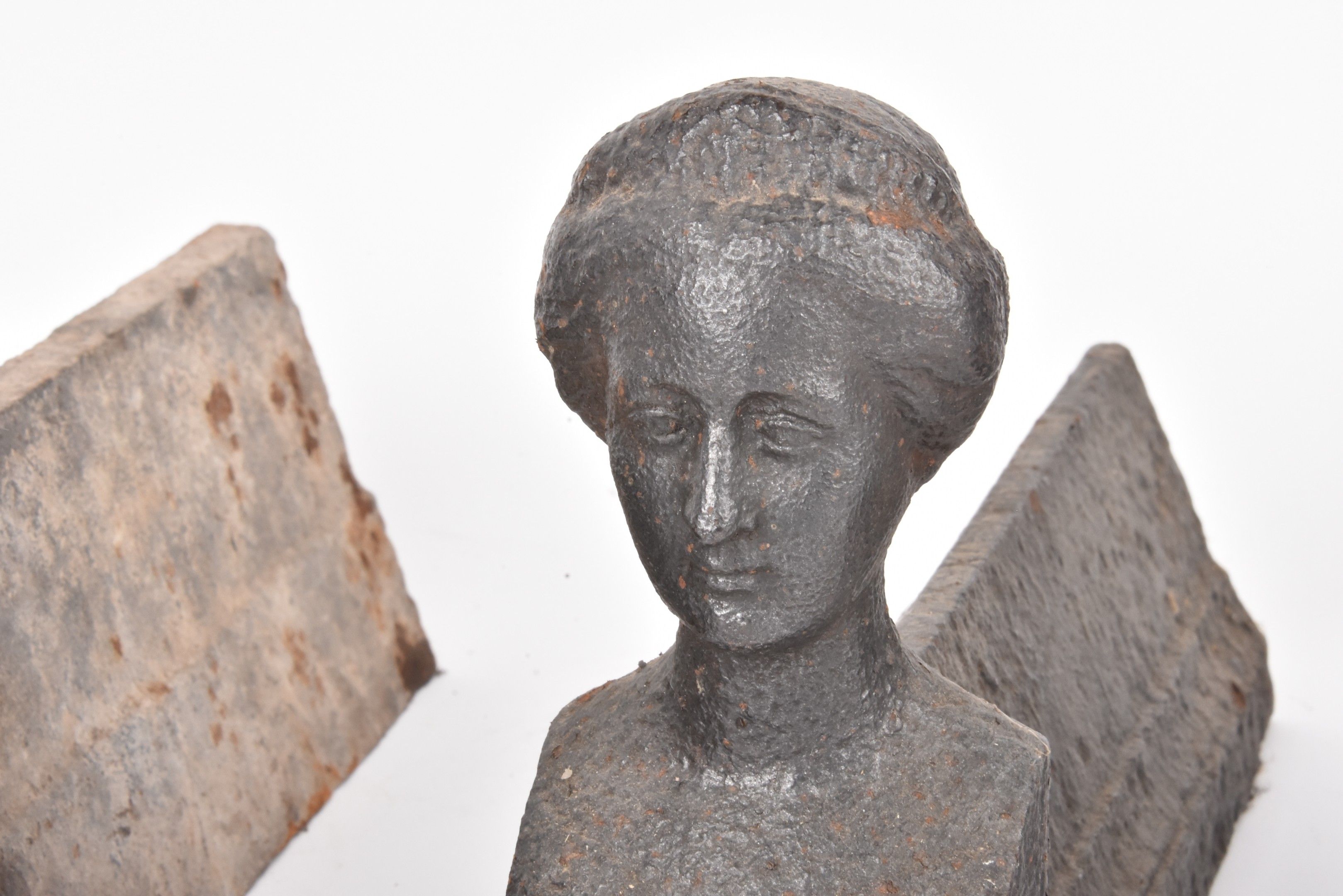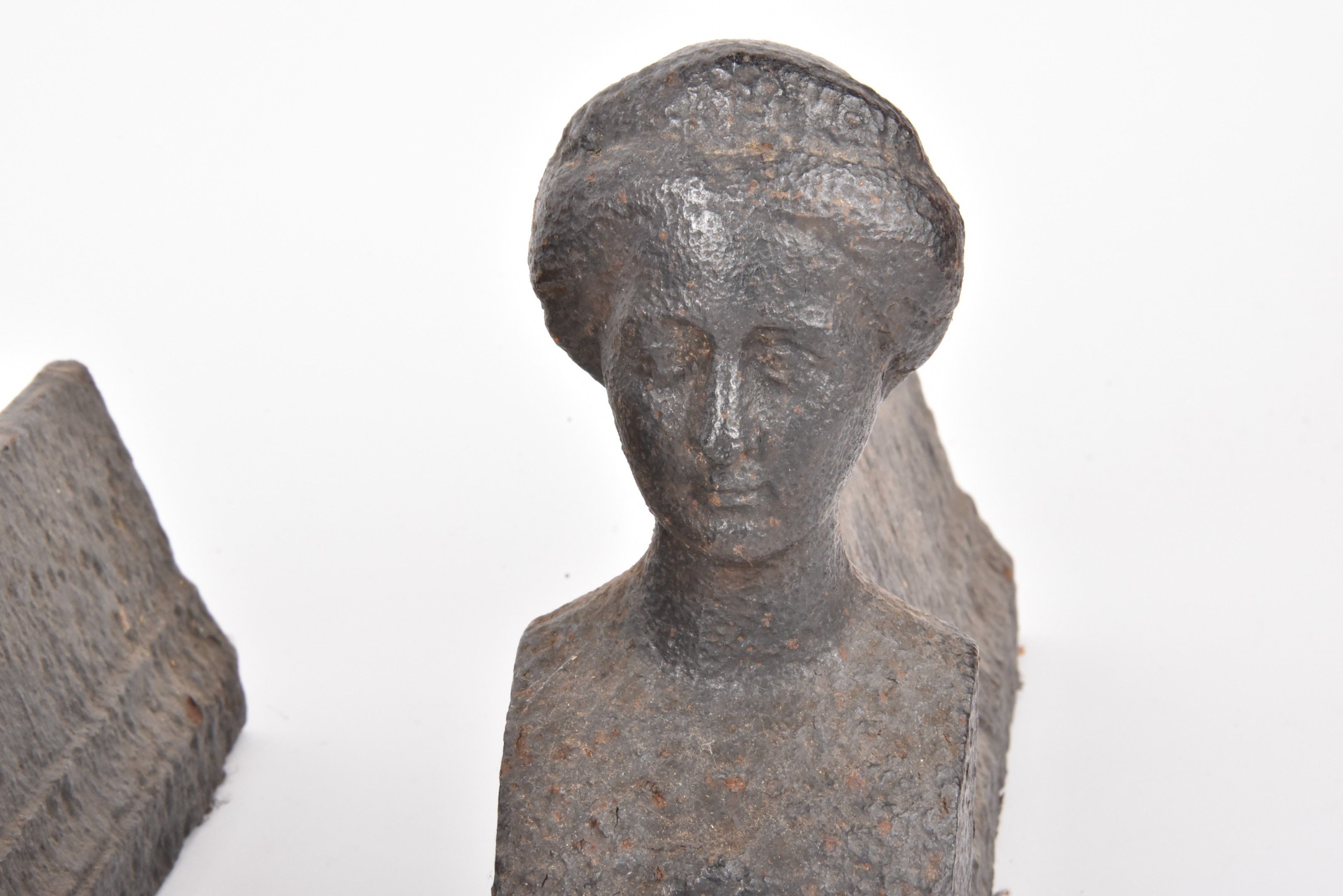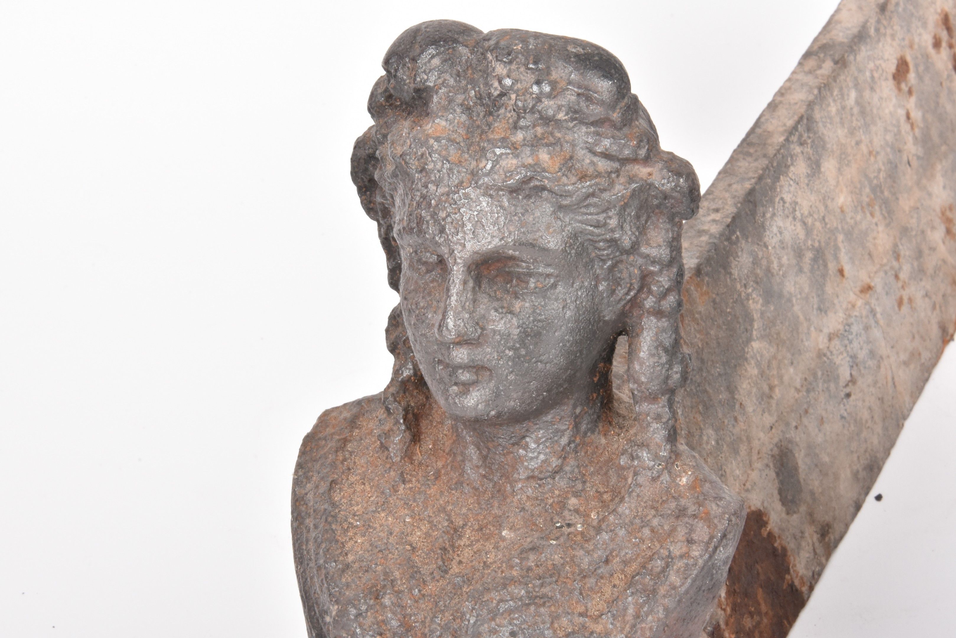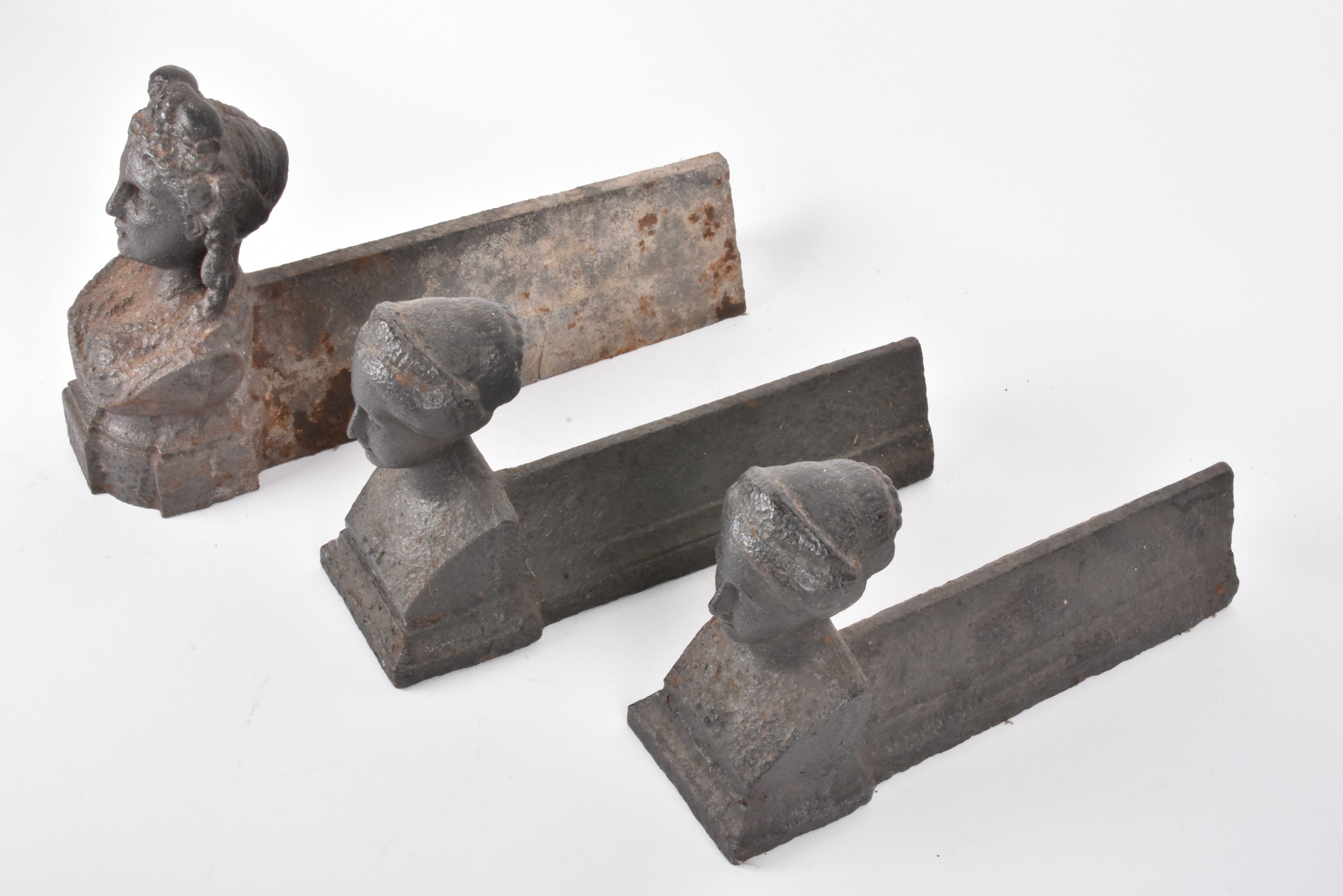 Batch of cast iron objects including a covered casserole dish, a pair of andirons, a pair of andirons and an andiron.