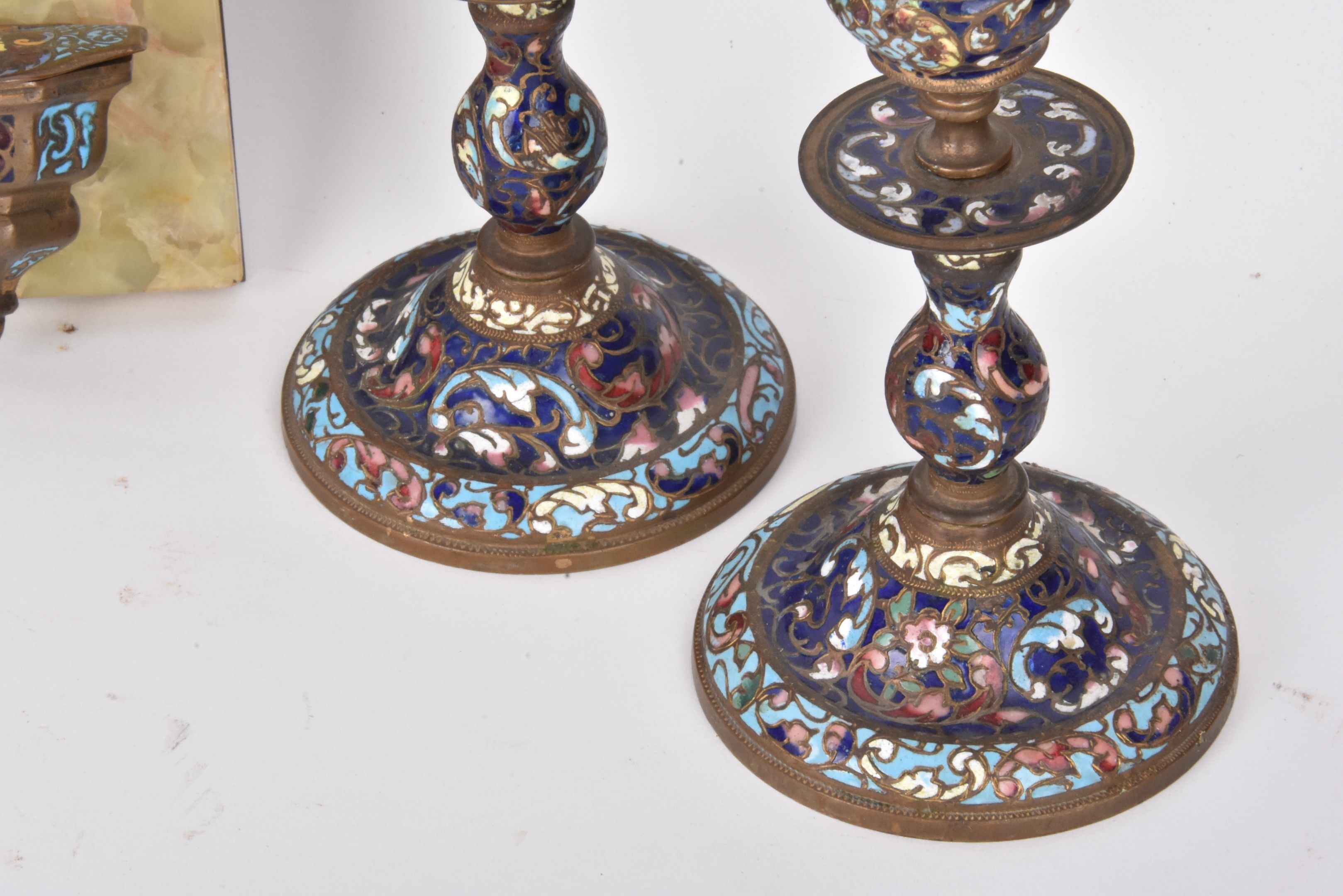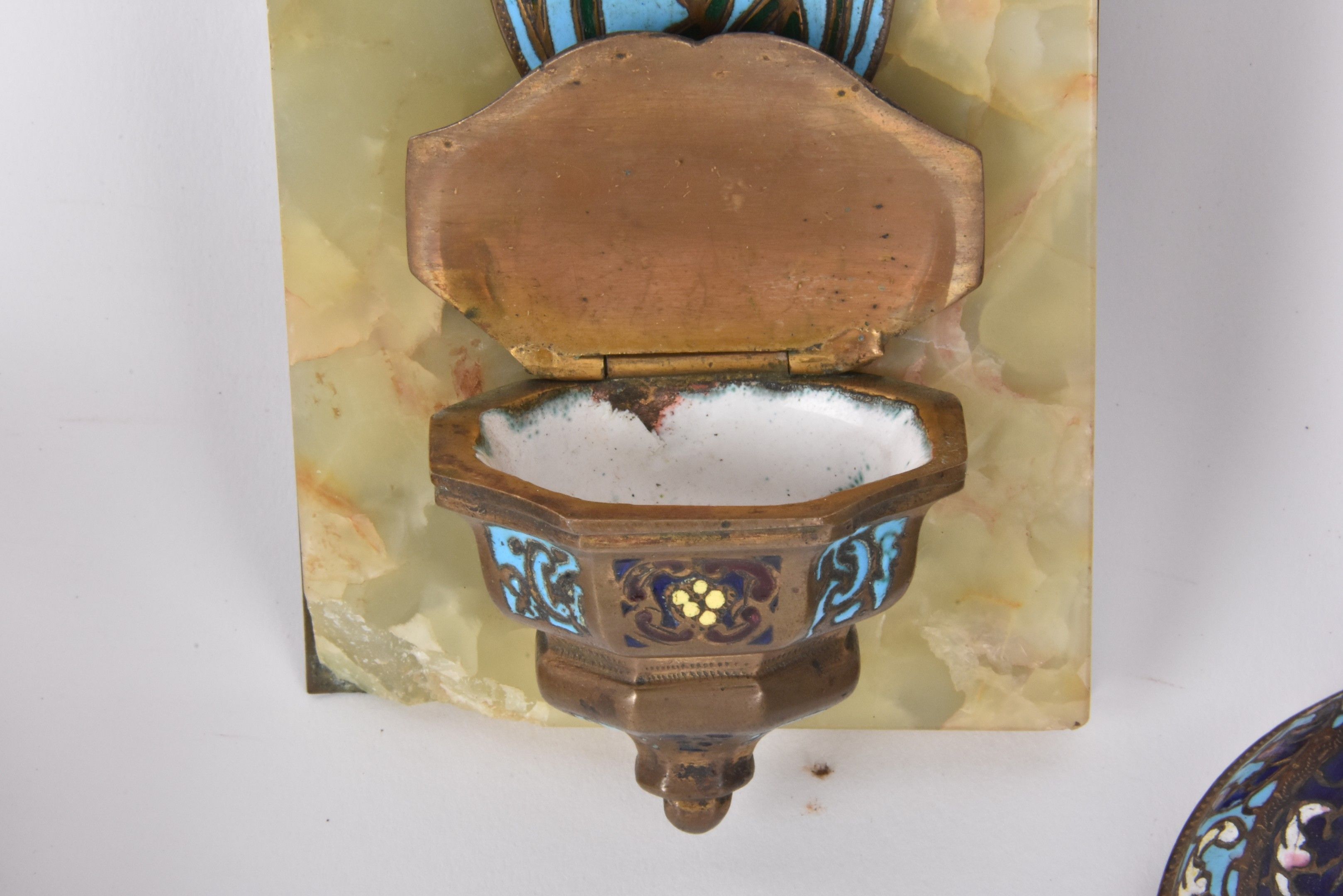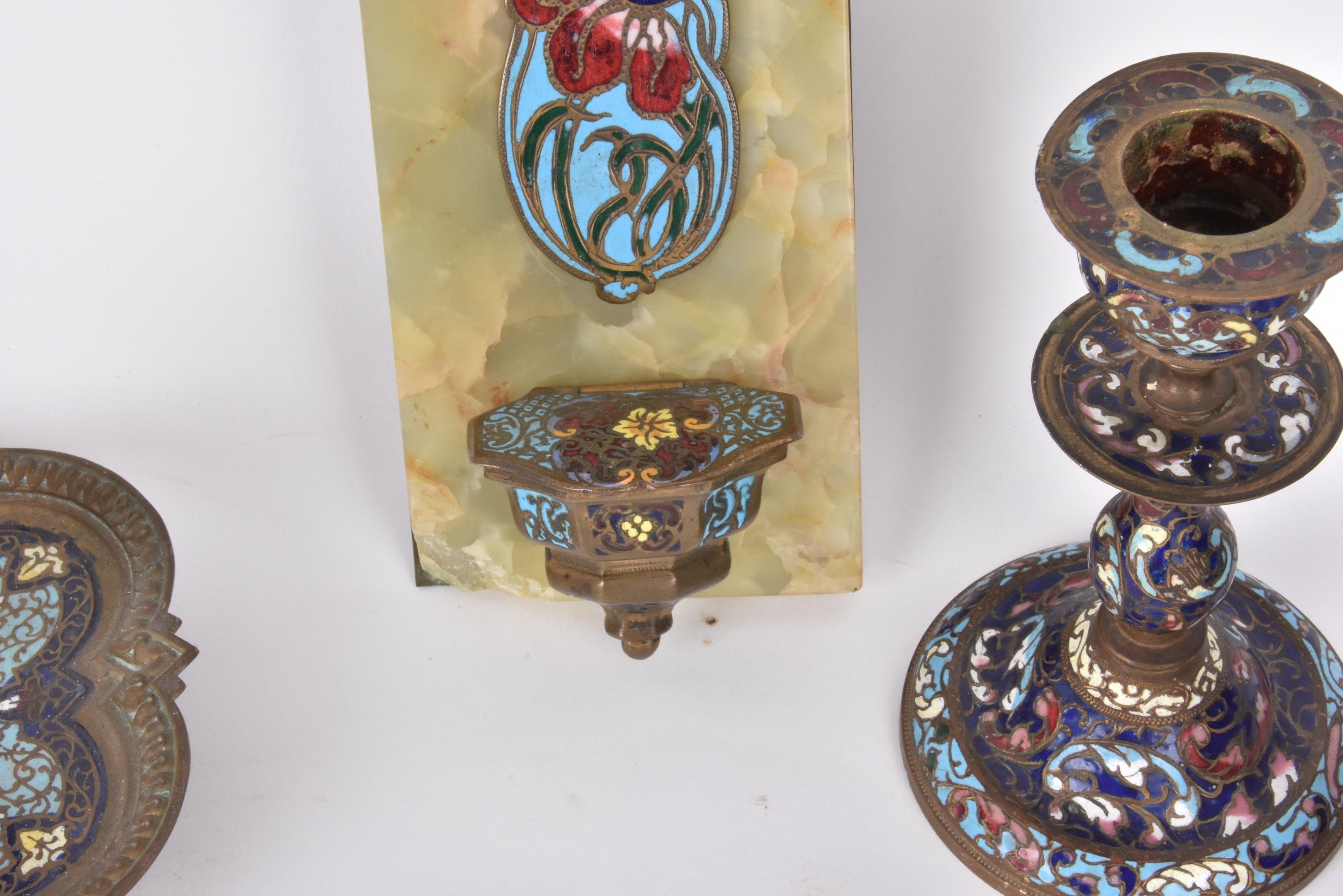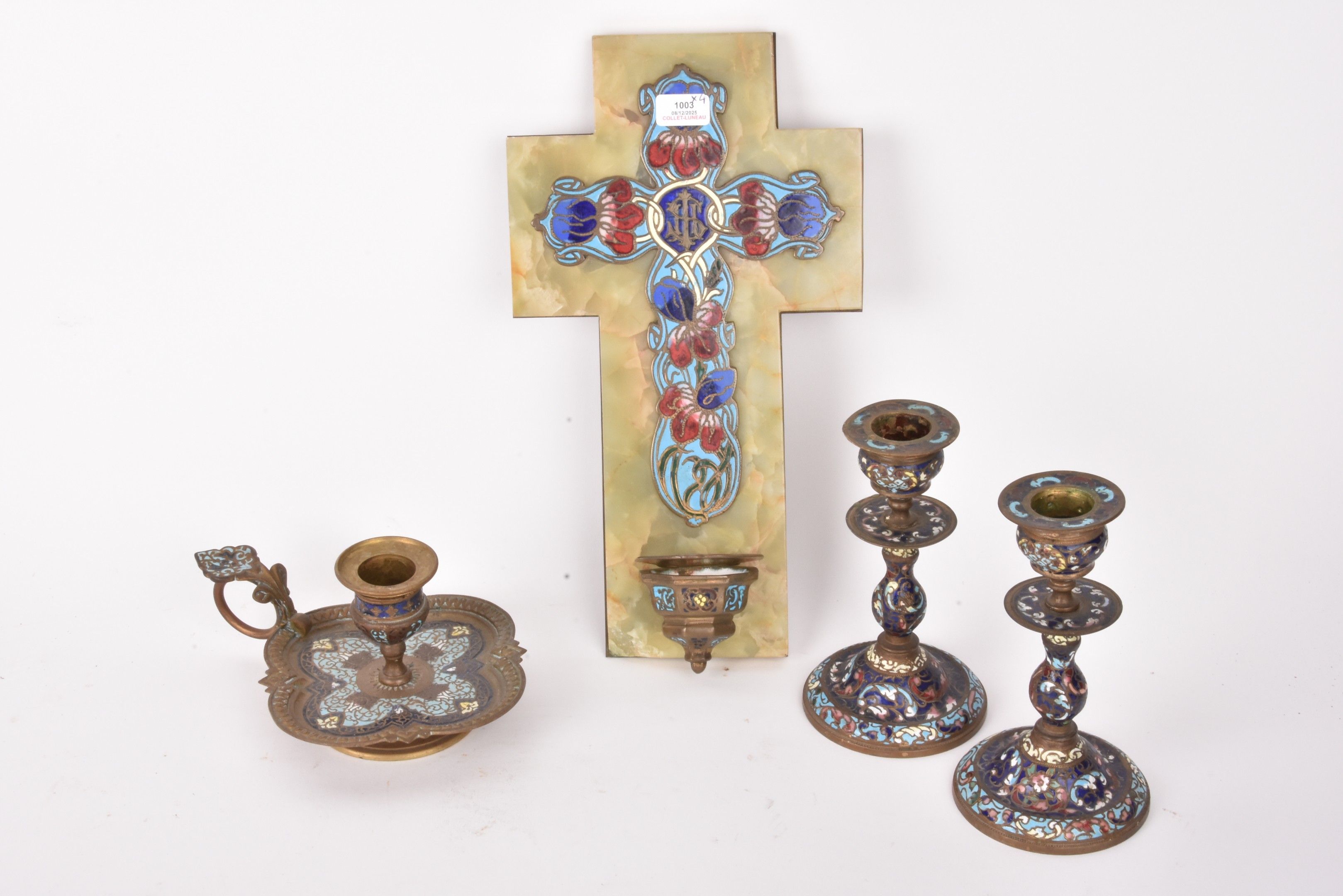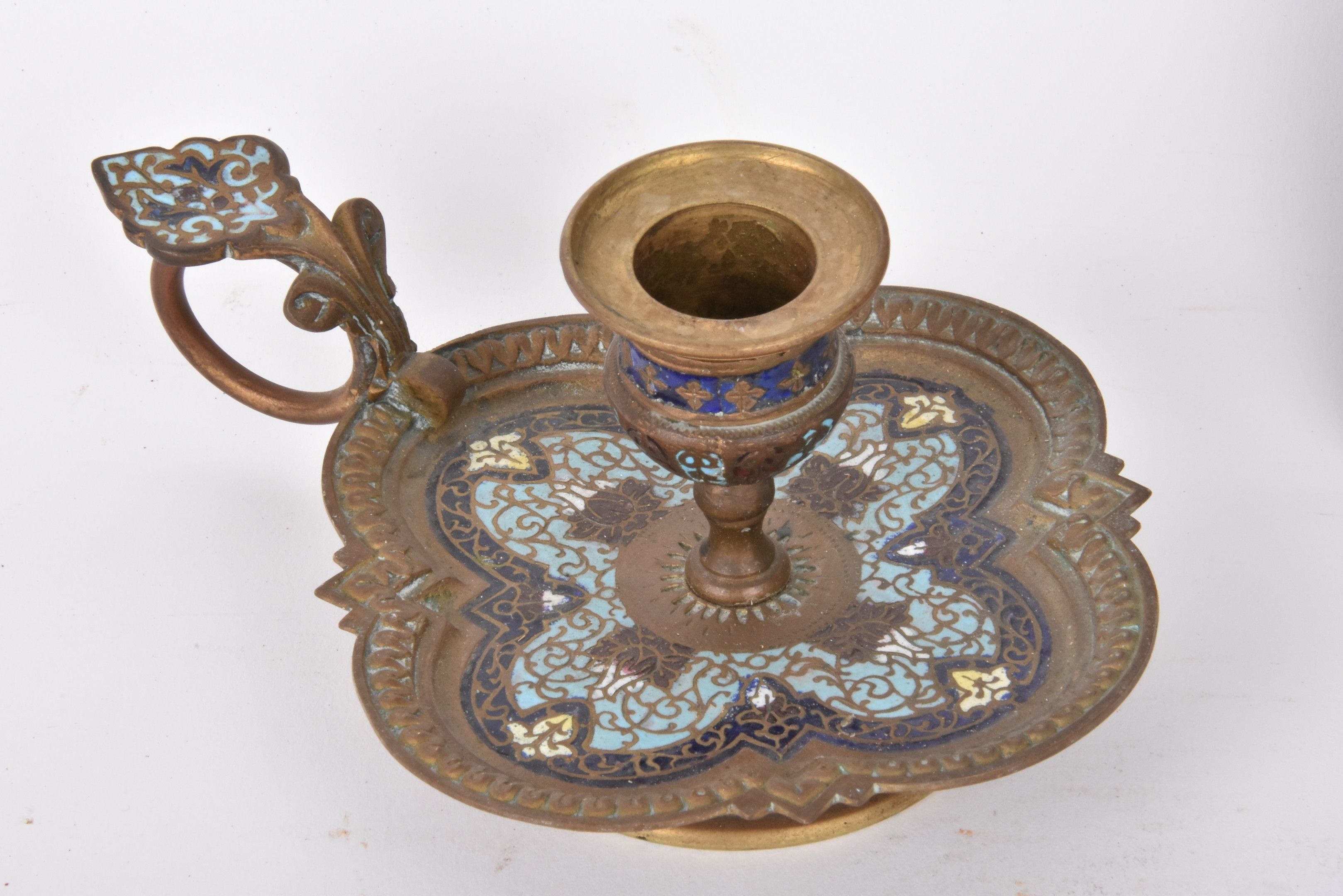 Set of cloisonné and bronze objects including a pair of small torches (H. 13 cm), a hand candlestick and a holy water font, Late 19th century (accidents).