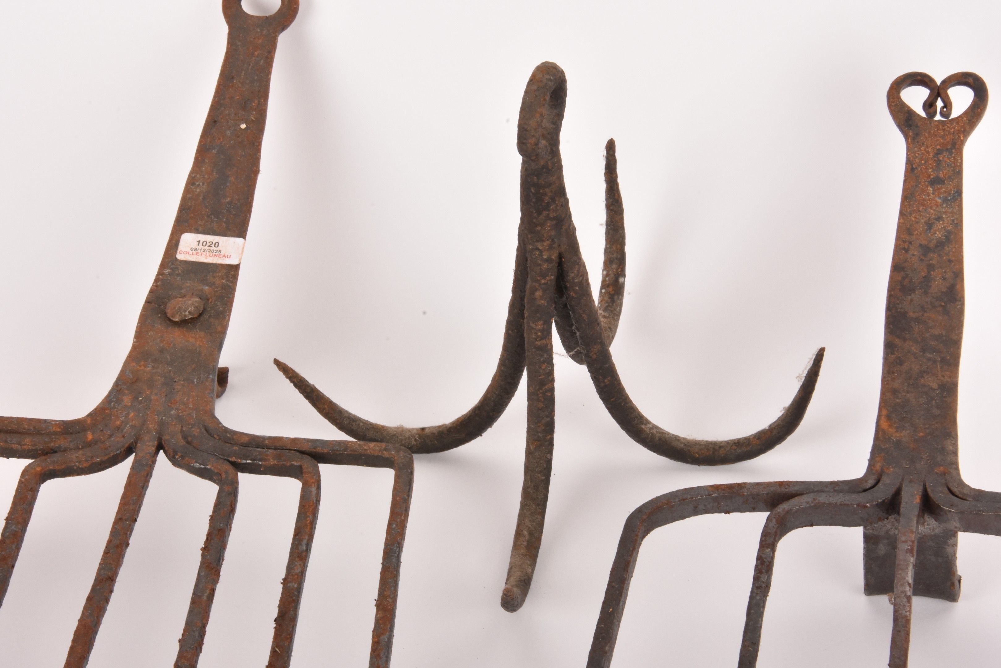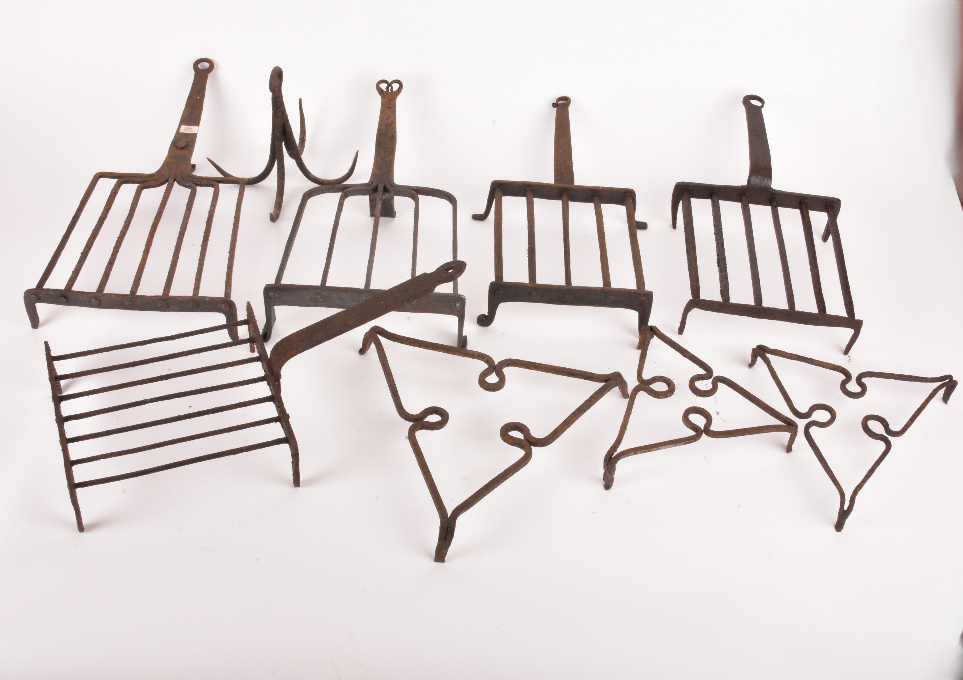 Set of 5 fire grates, 3 wrought iron trivets and a hook, 18th and 19th century