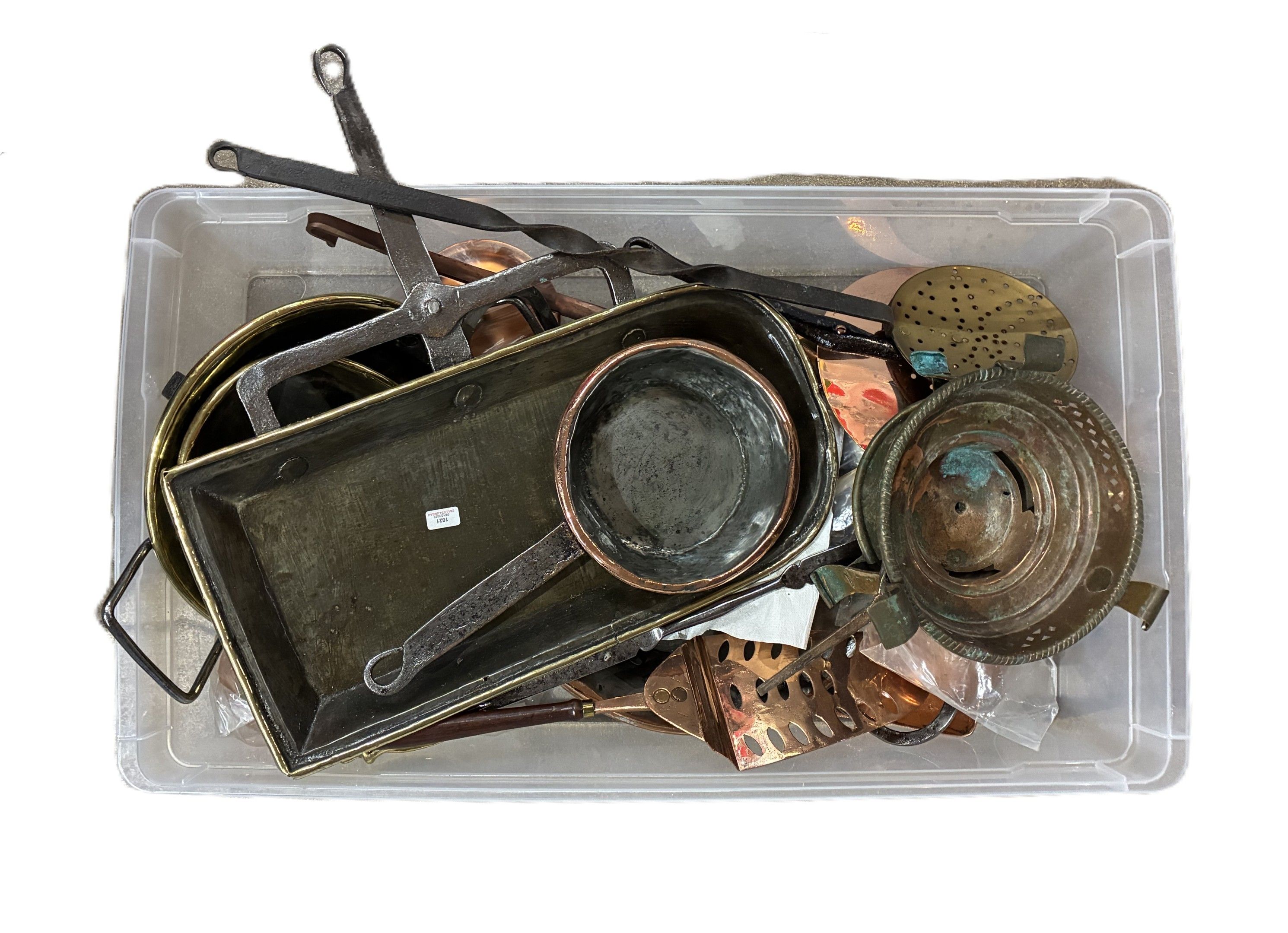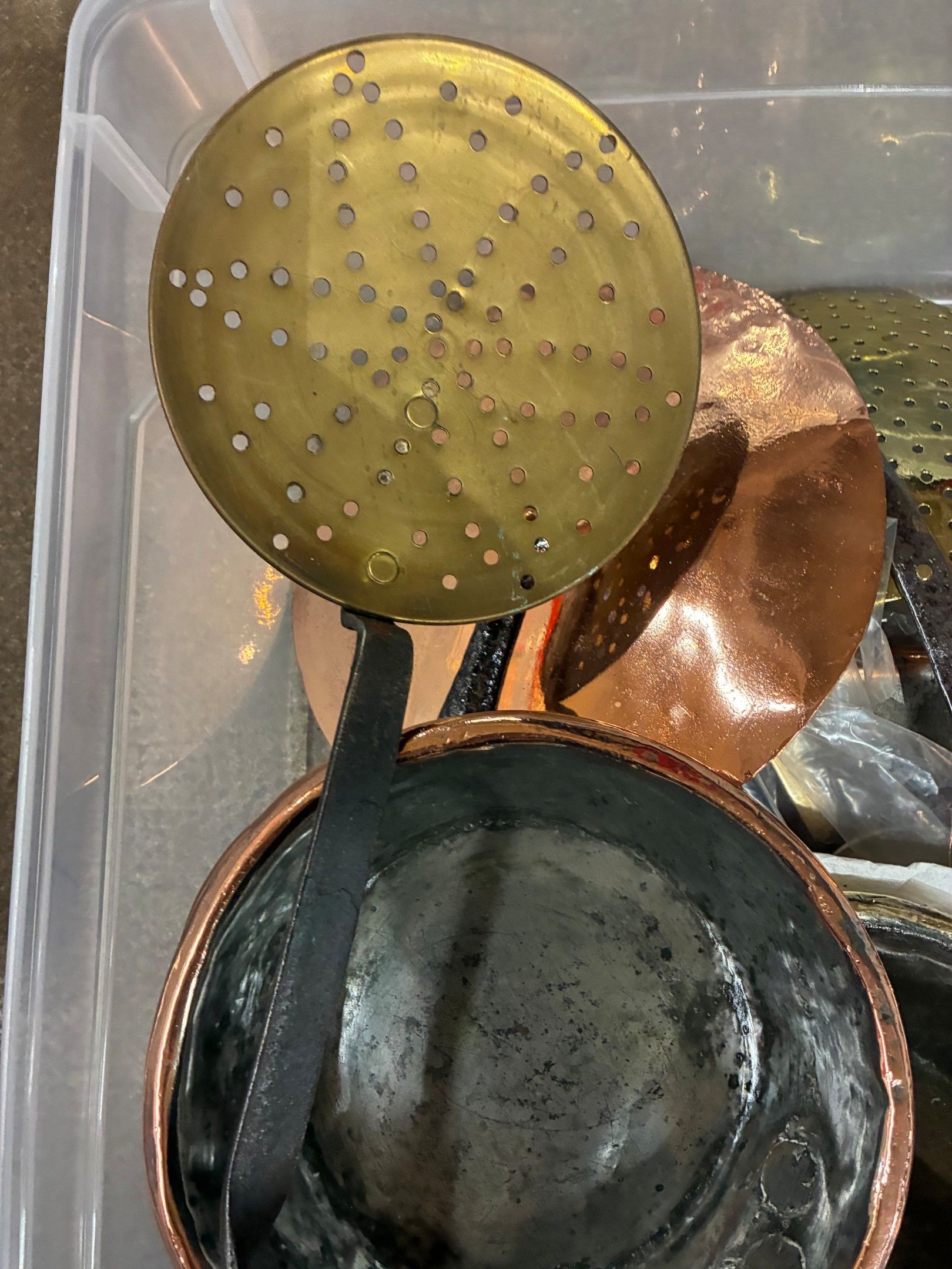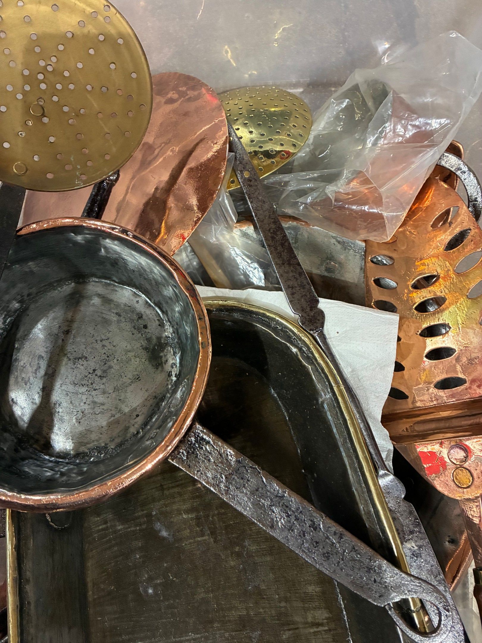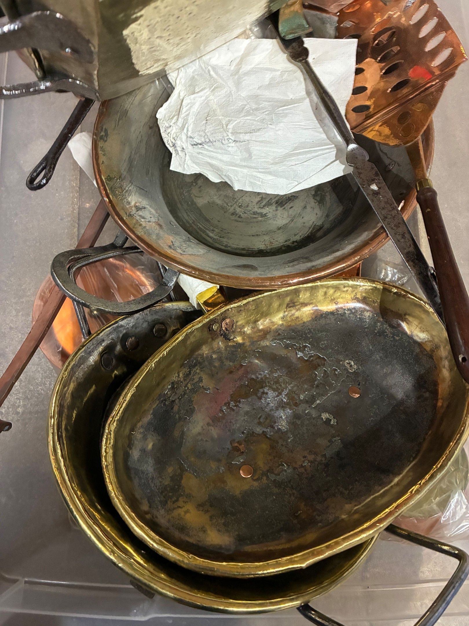 Batch of antique copper and brass: dishes, drainers, stoves …