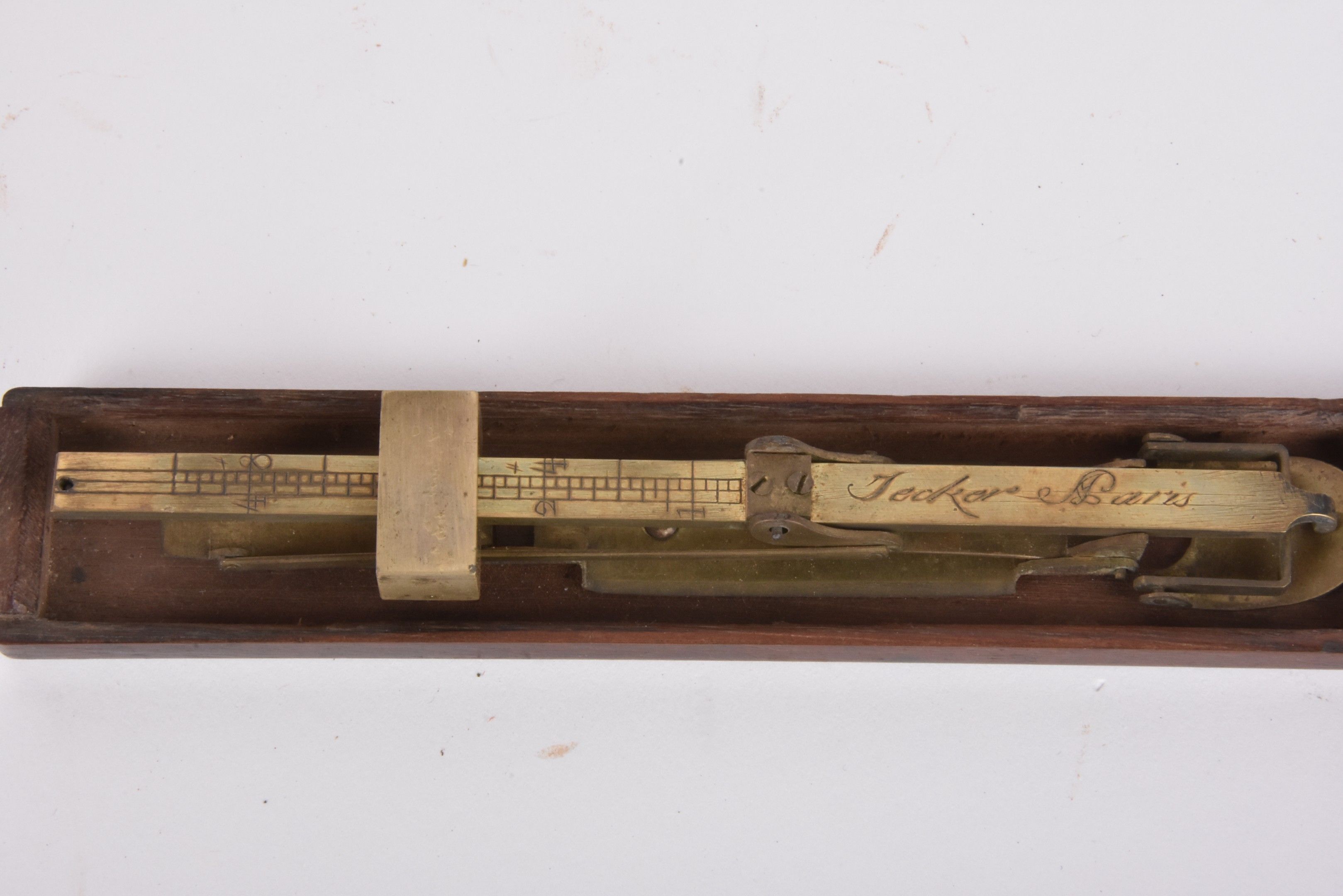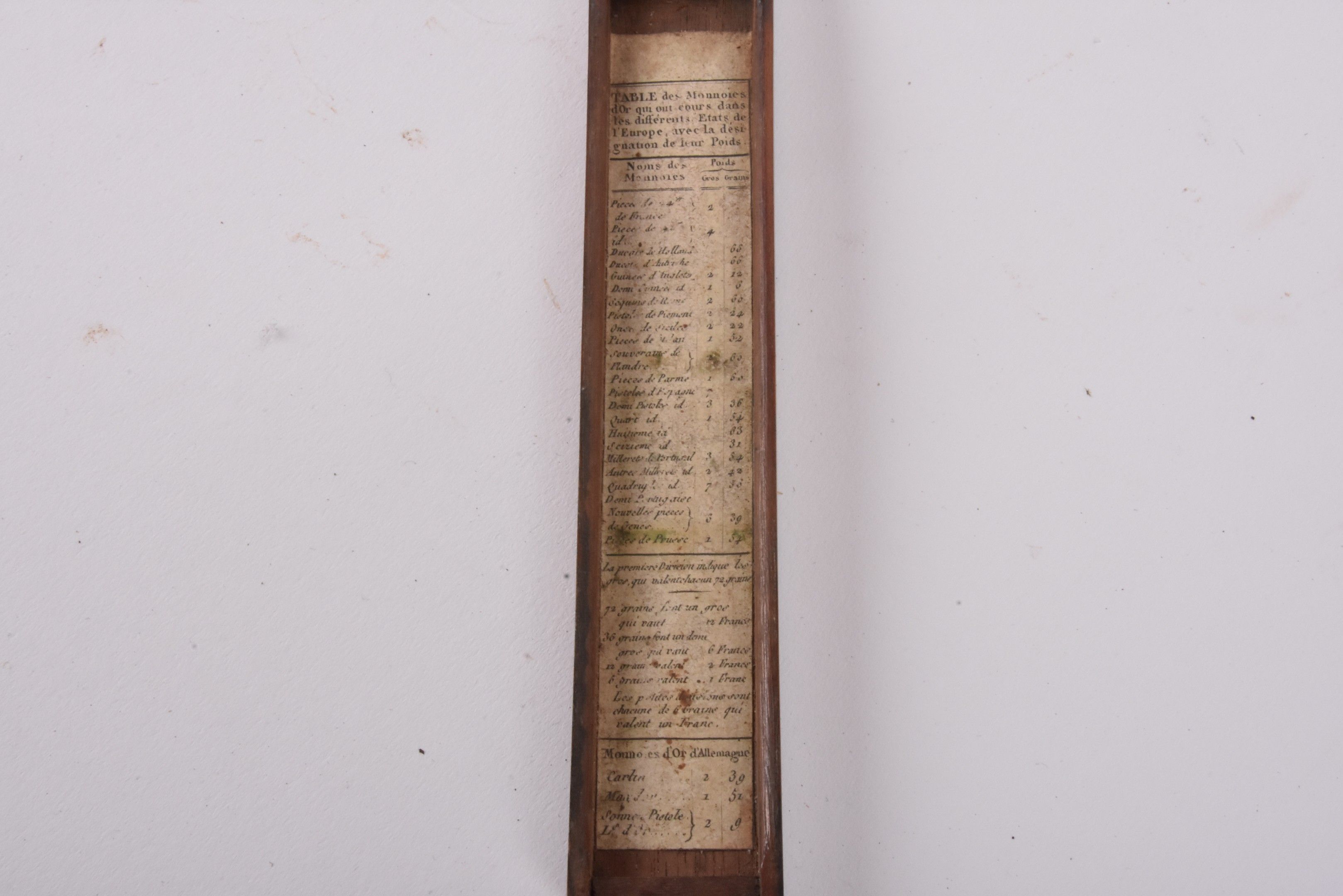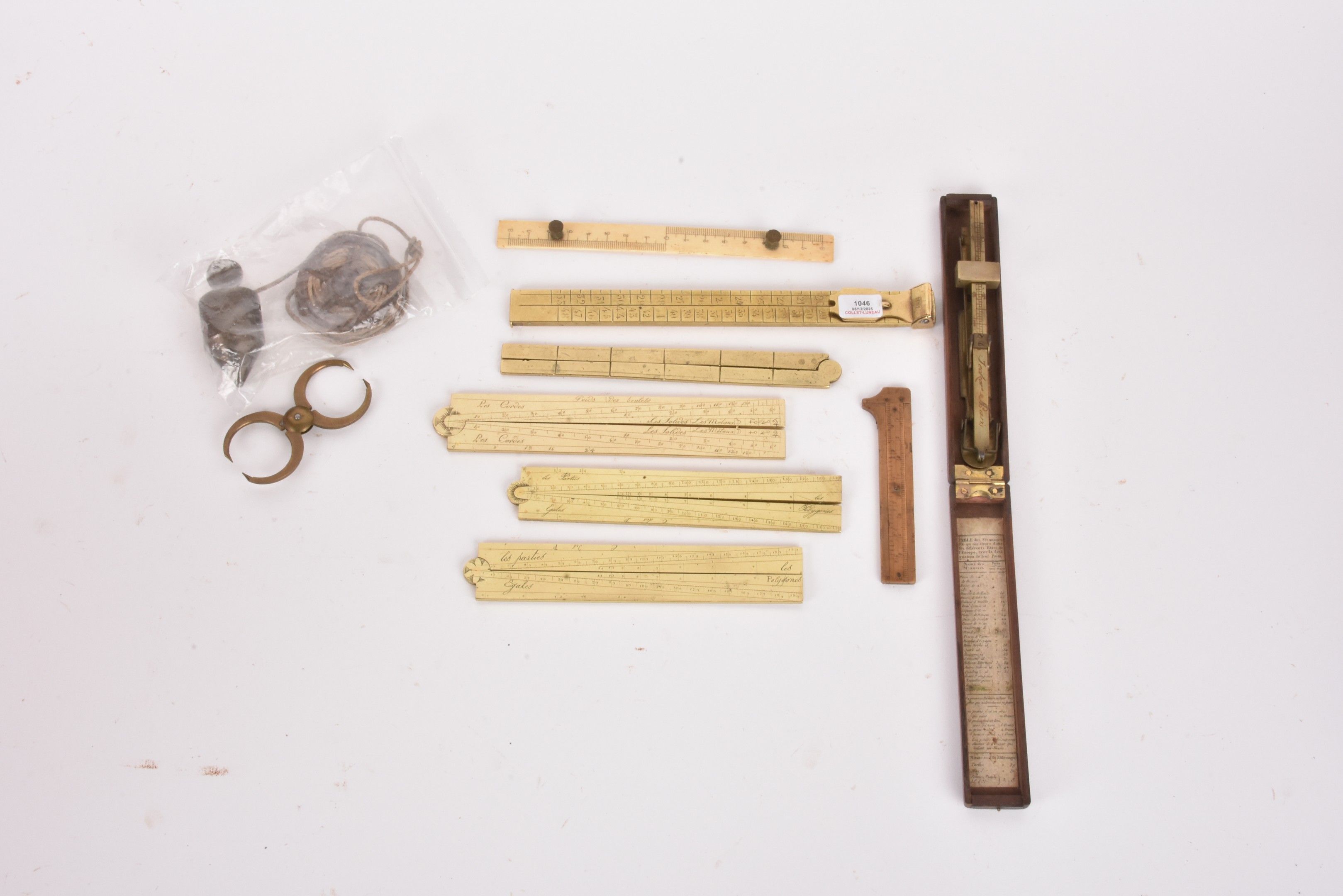 Batch of measuring instruments, brass, bone and wood XIX° century of which a trebuchet signed Jecker in Paris, 5 feet of roy, a calliper, a bone rule and a gauge, plumb line