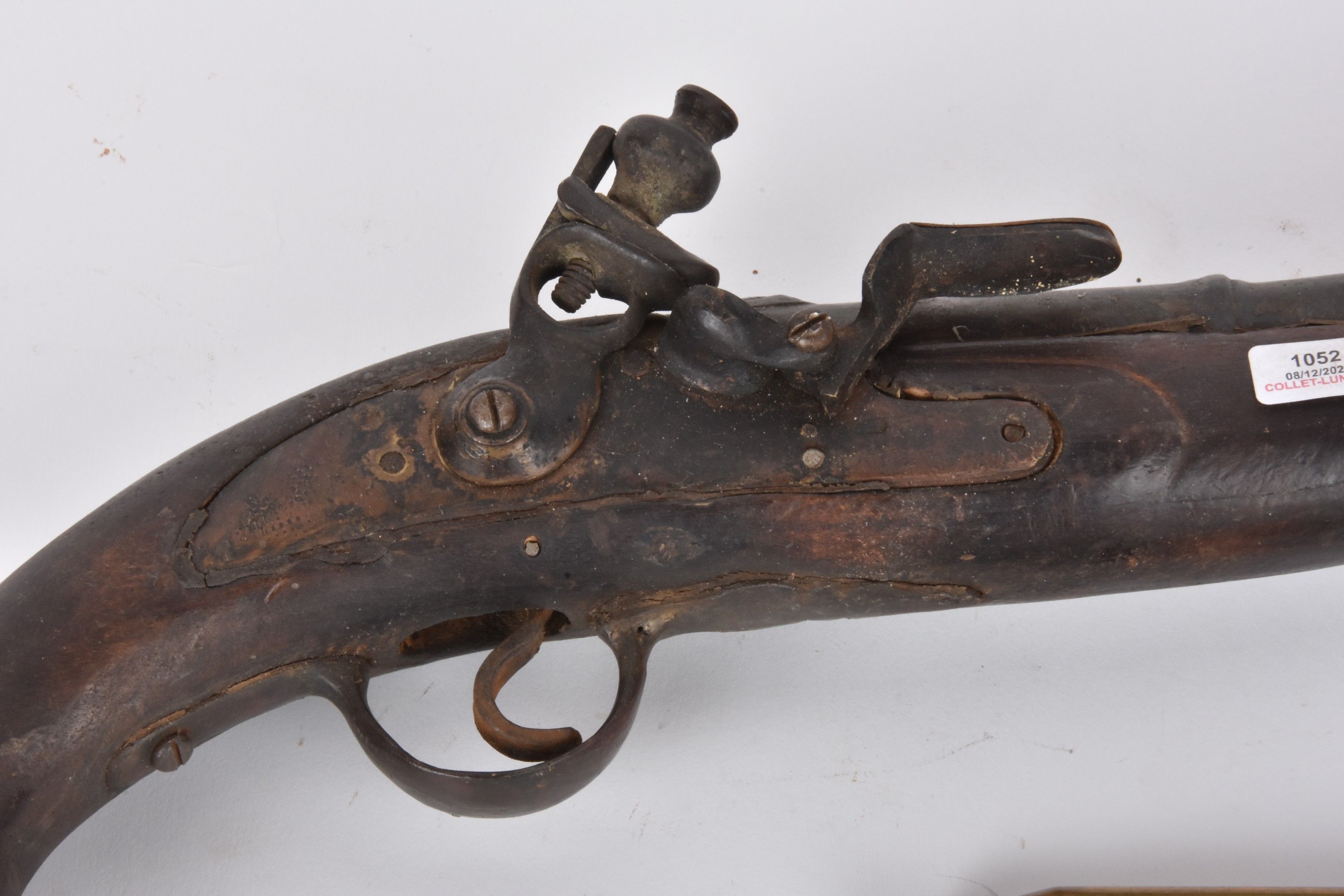 Lot including 2 cannonballs, a flintlock pistol, two brass c…