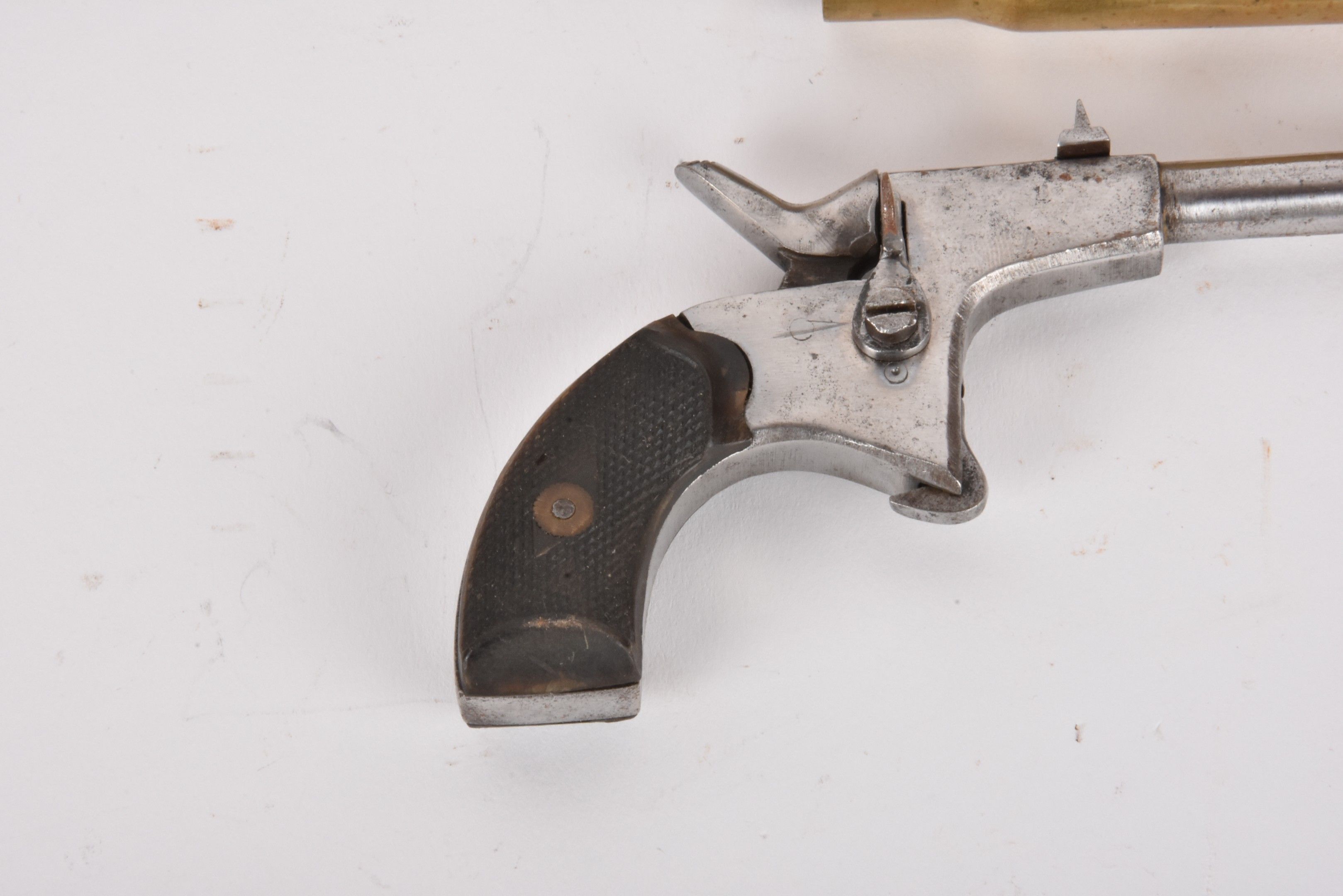 Lot including 2 cannonballs, a flintlock pistol, two brass cartridge cases and a small revolver.