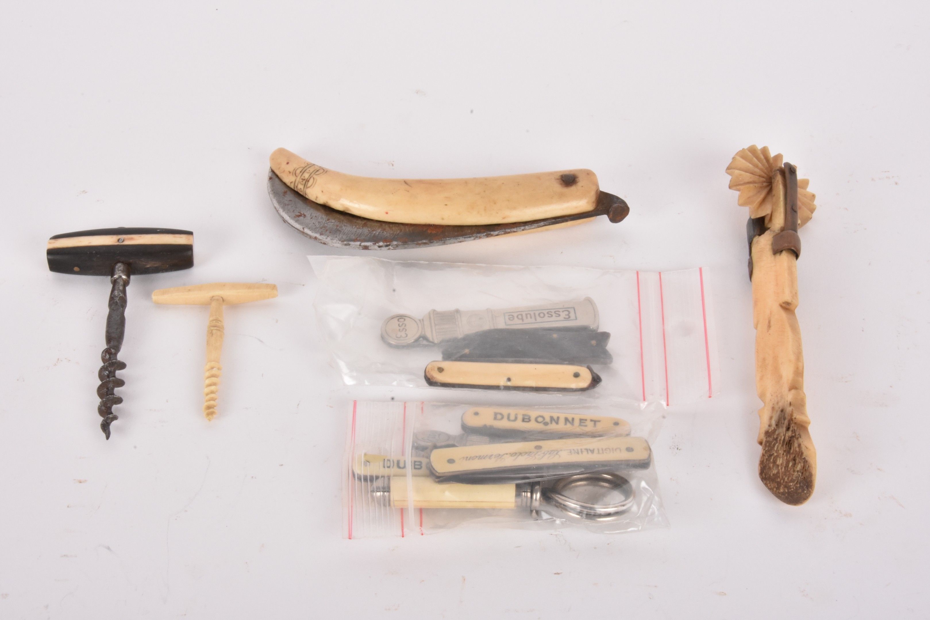 Set of small promotional bone penknives, a serpette and a roulette wheel