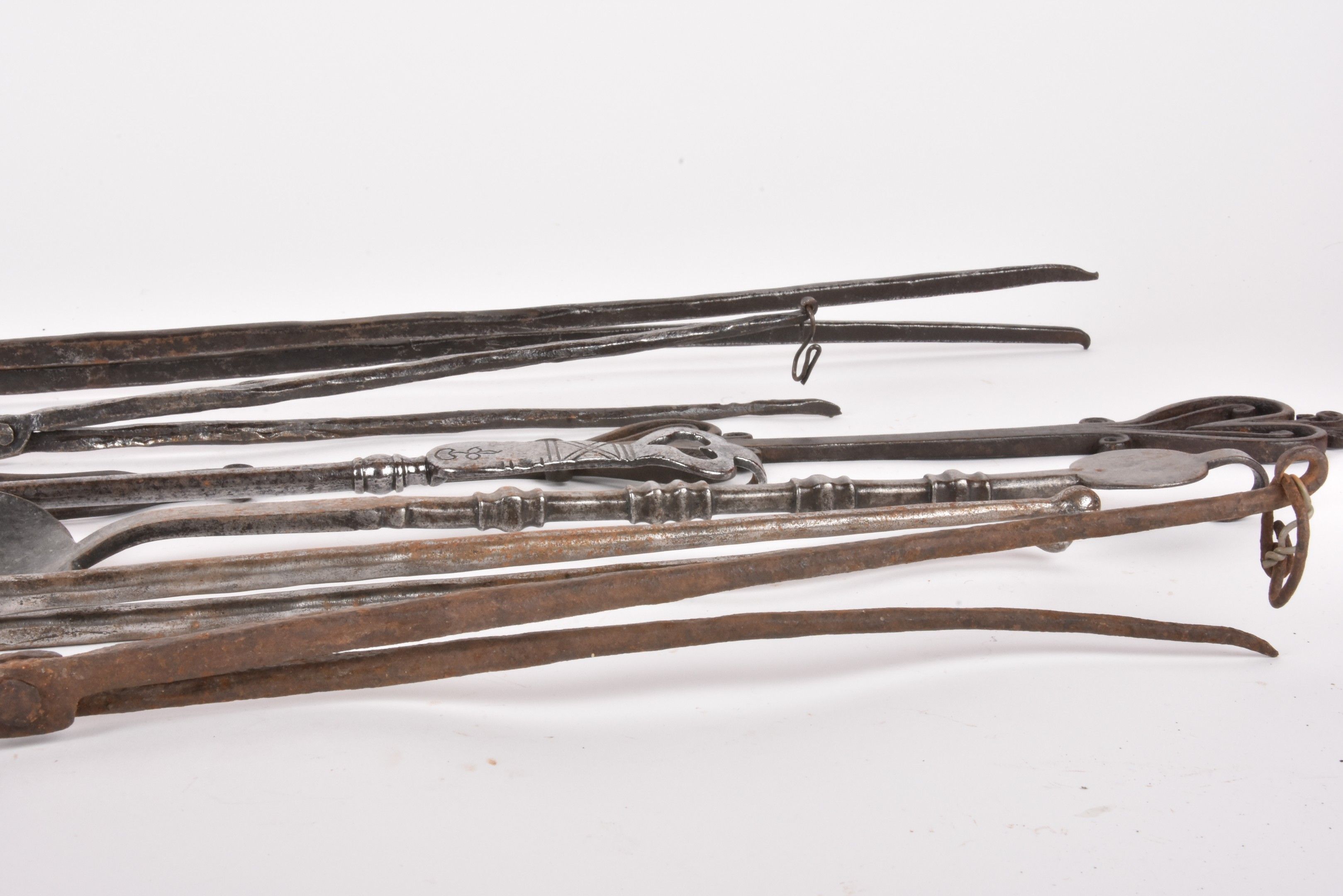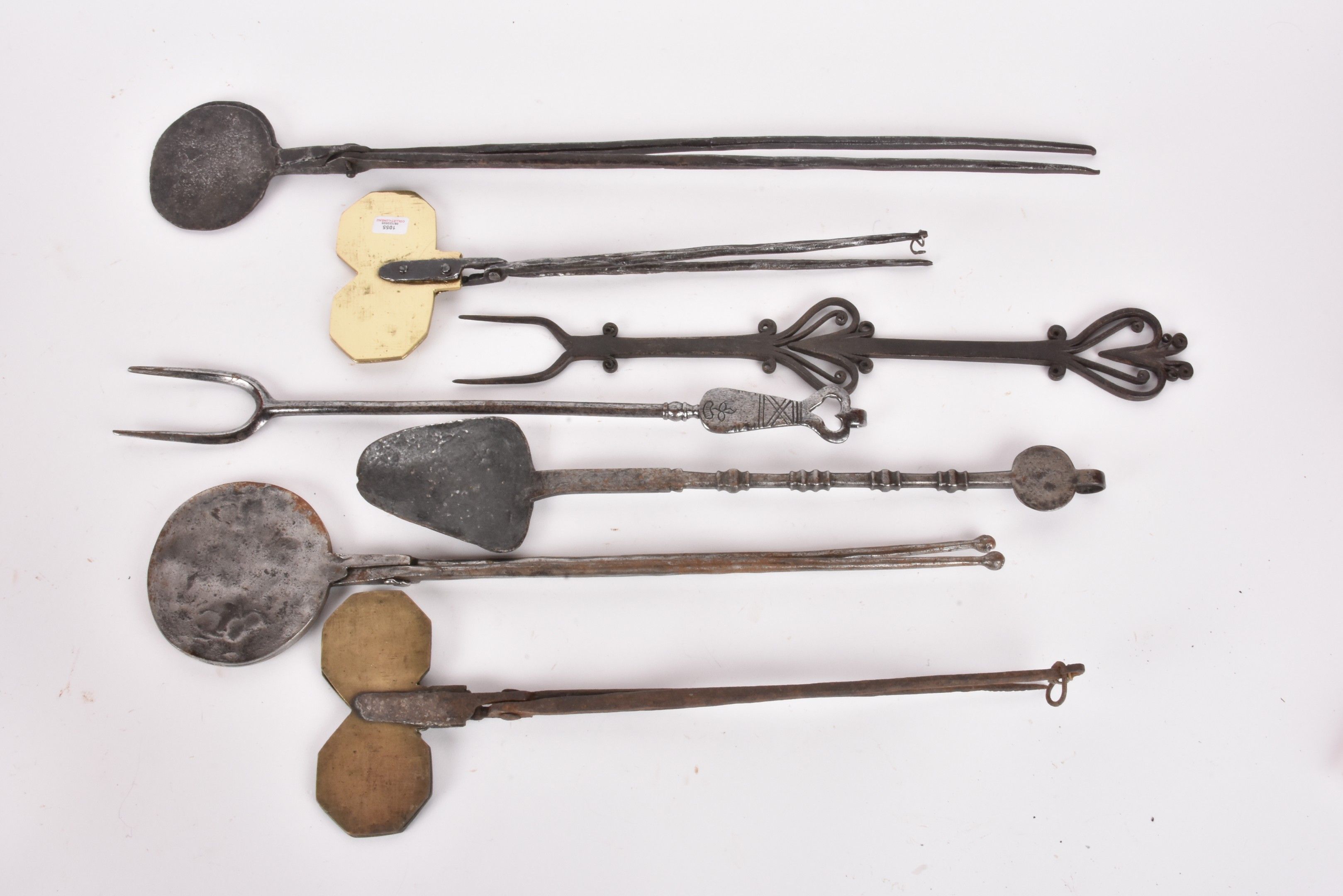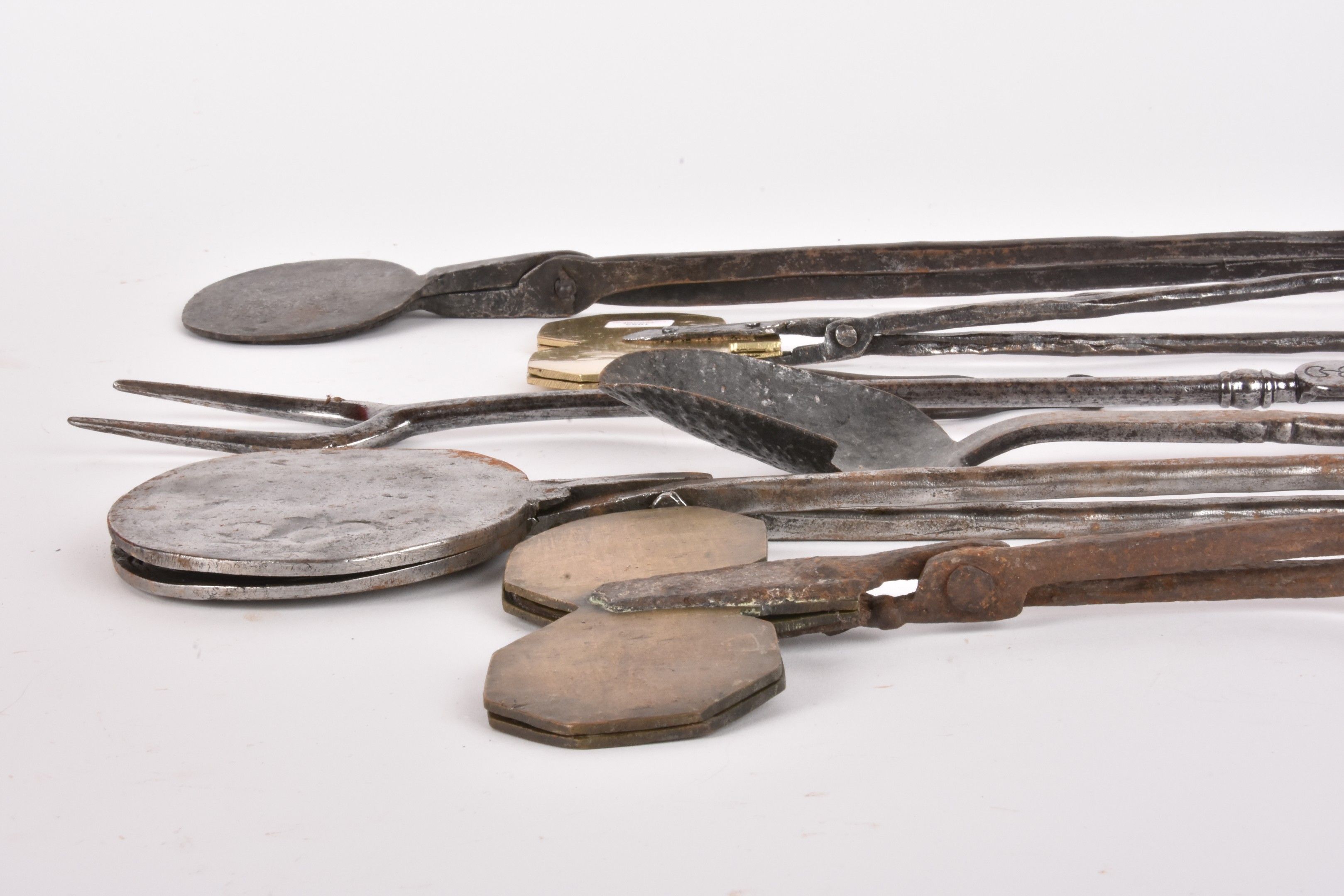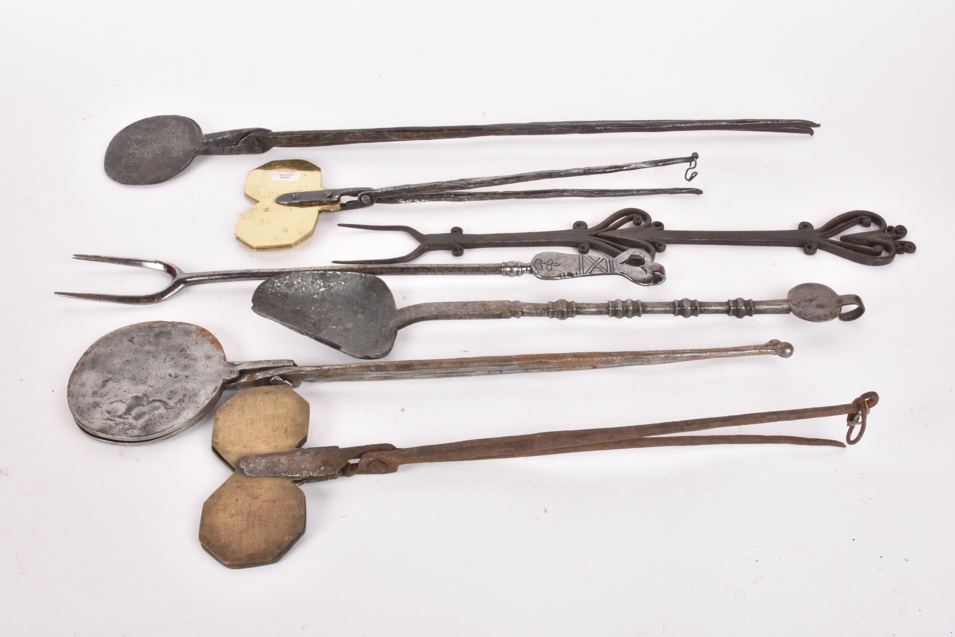 Set of 18th century waffle or forget moulds, 2 large two-pronged forks and a shovel