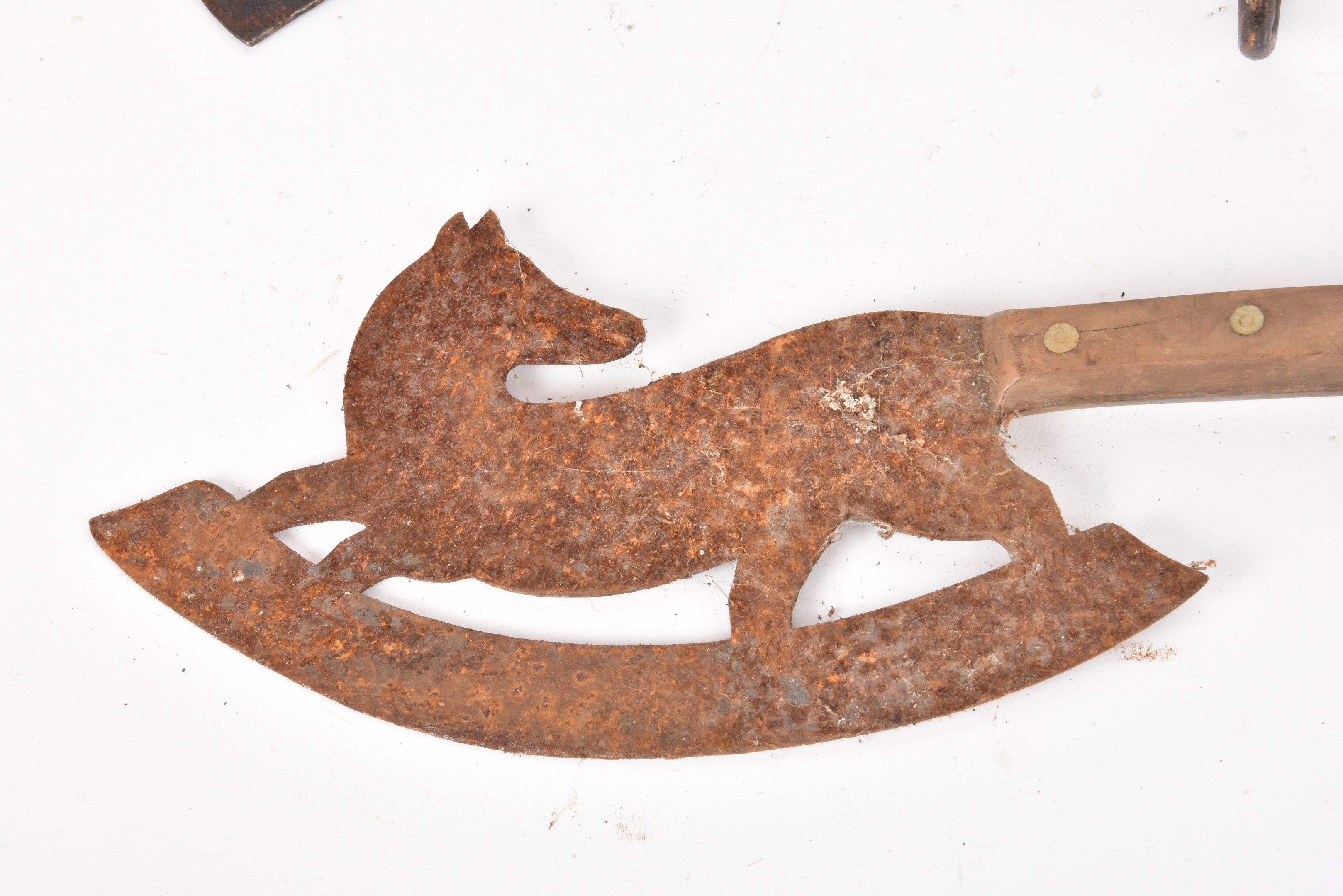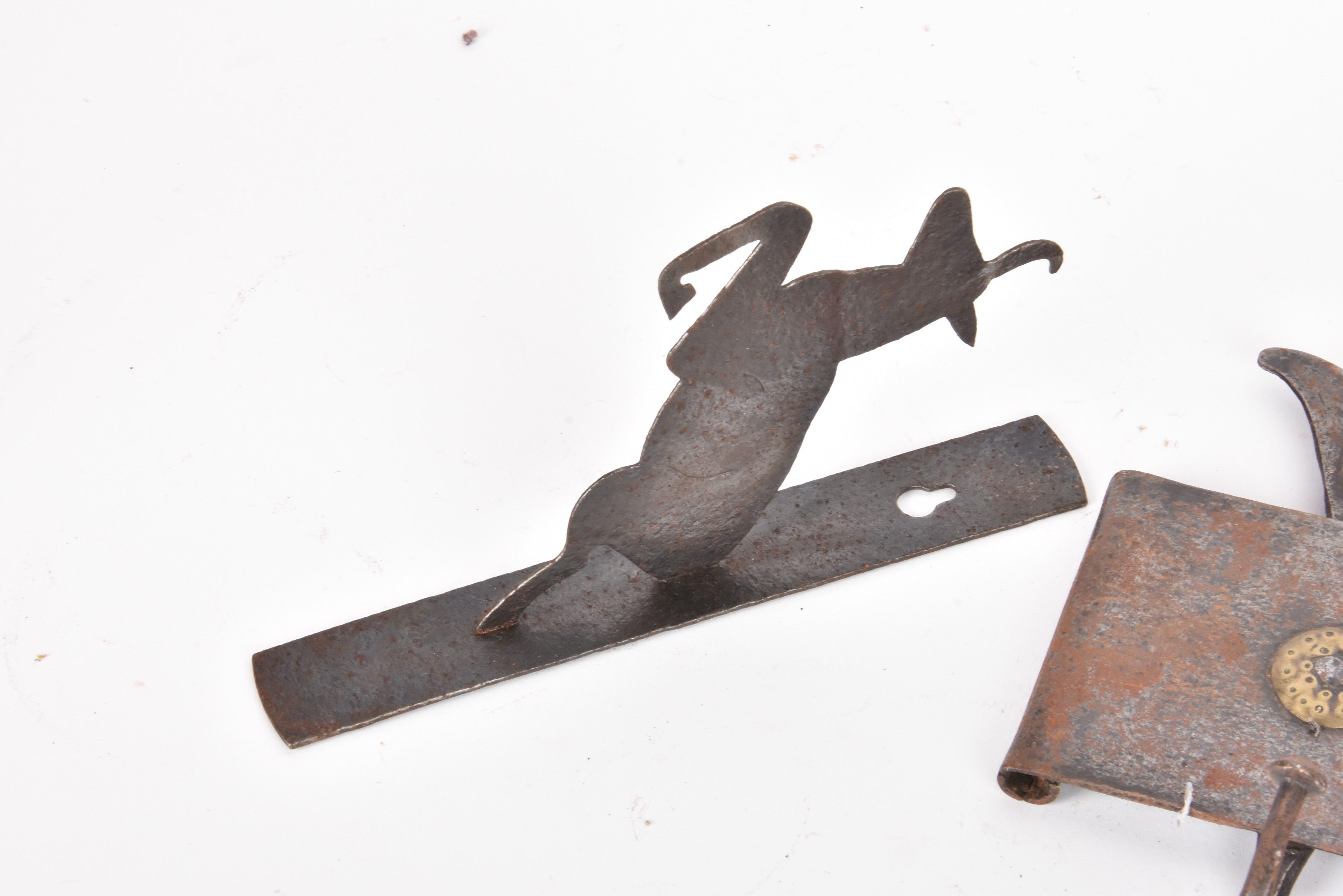 Batch of wrought-iron items: instrument and miscellaneous holders and two fox-decorated cleavers