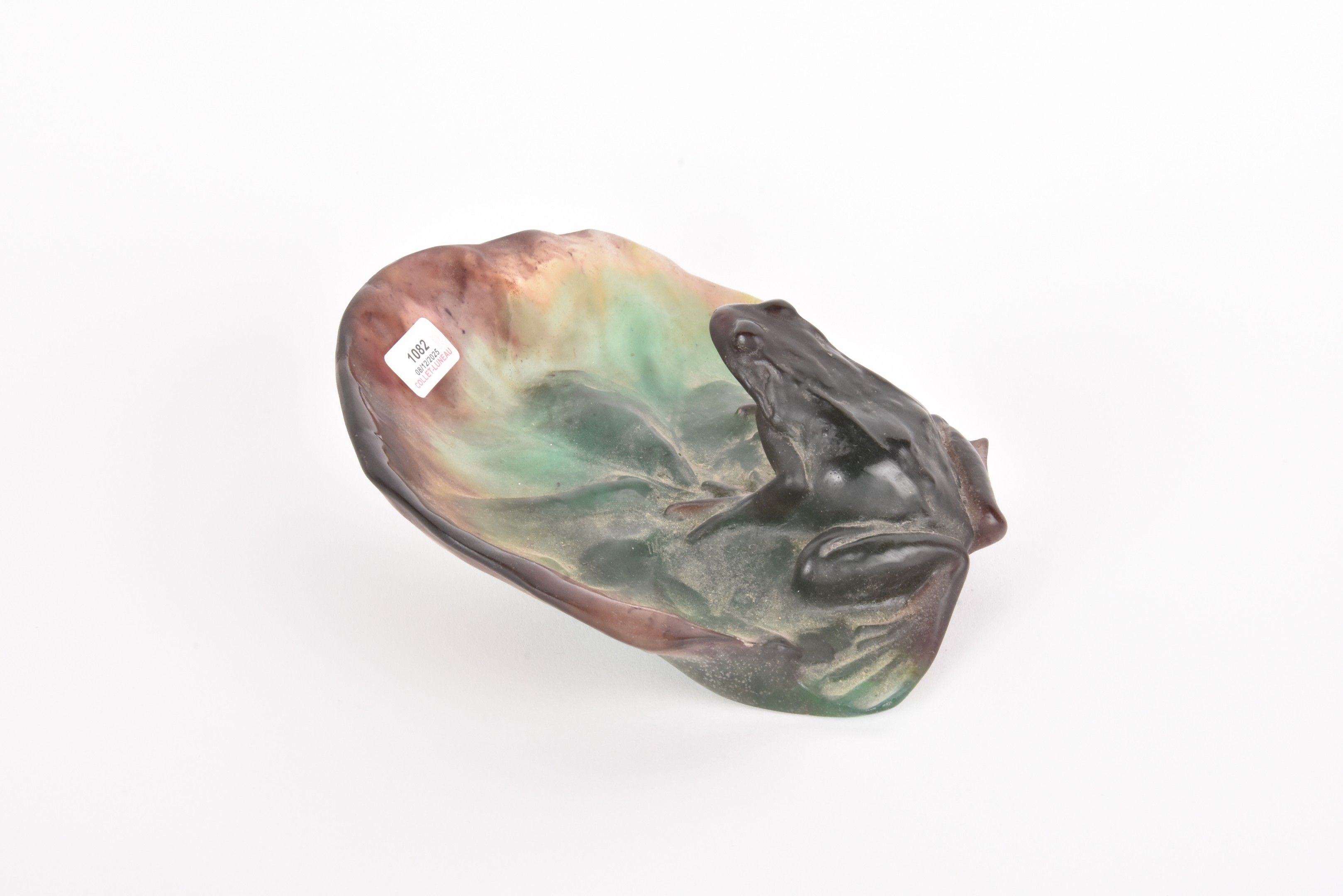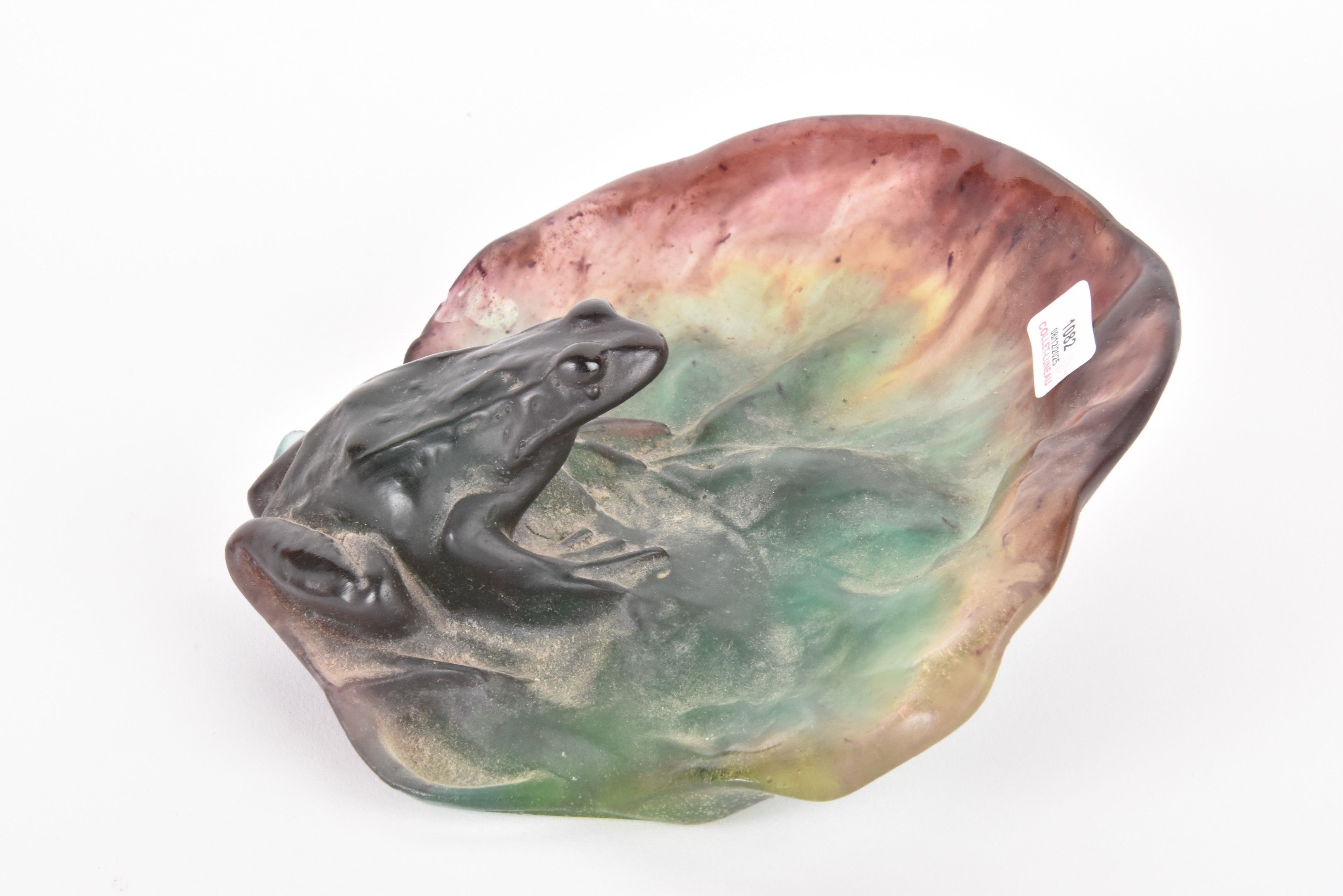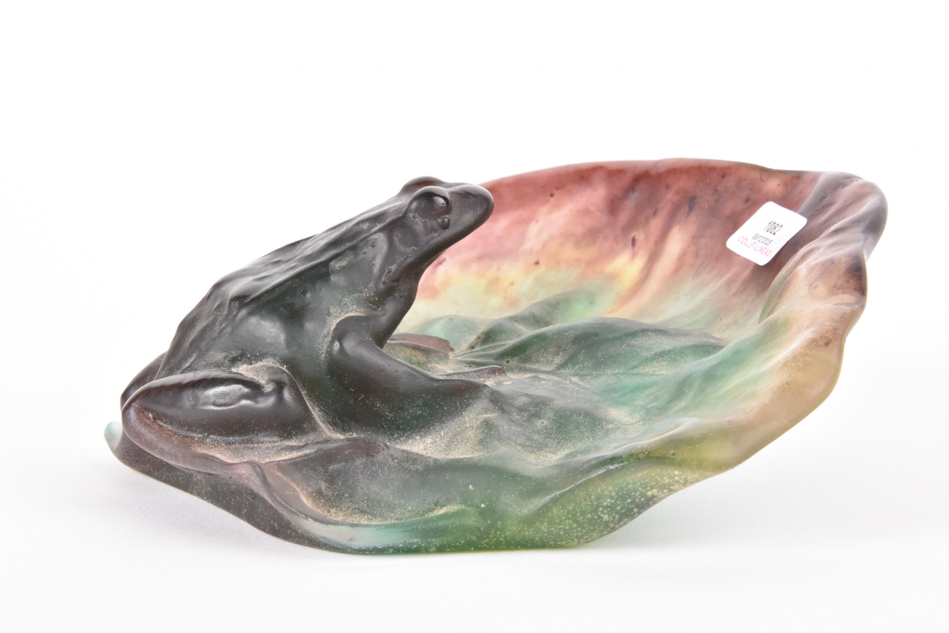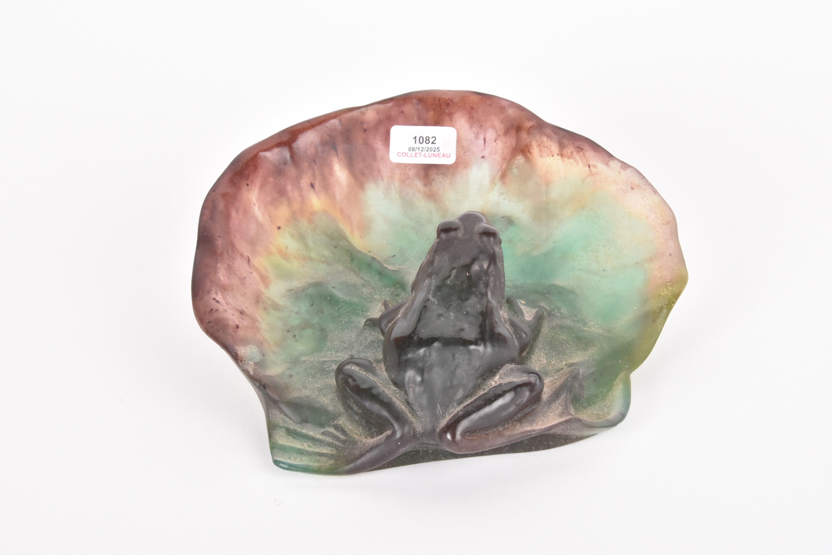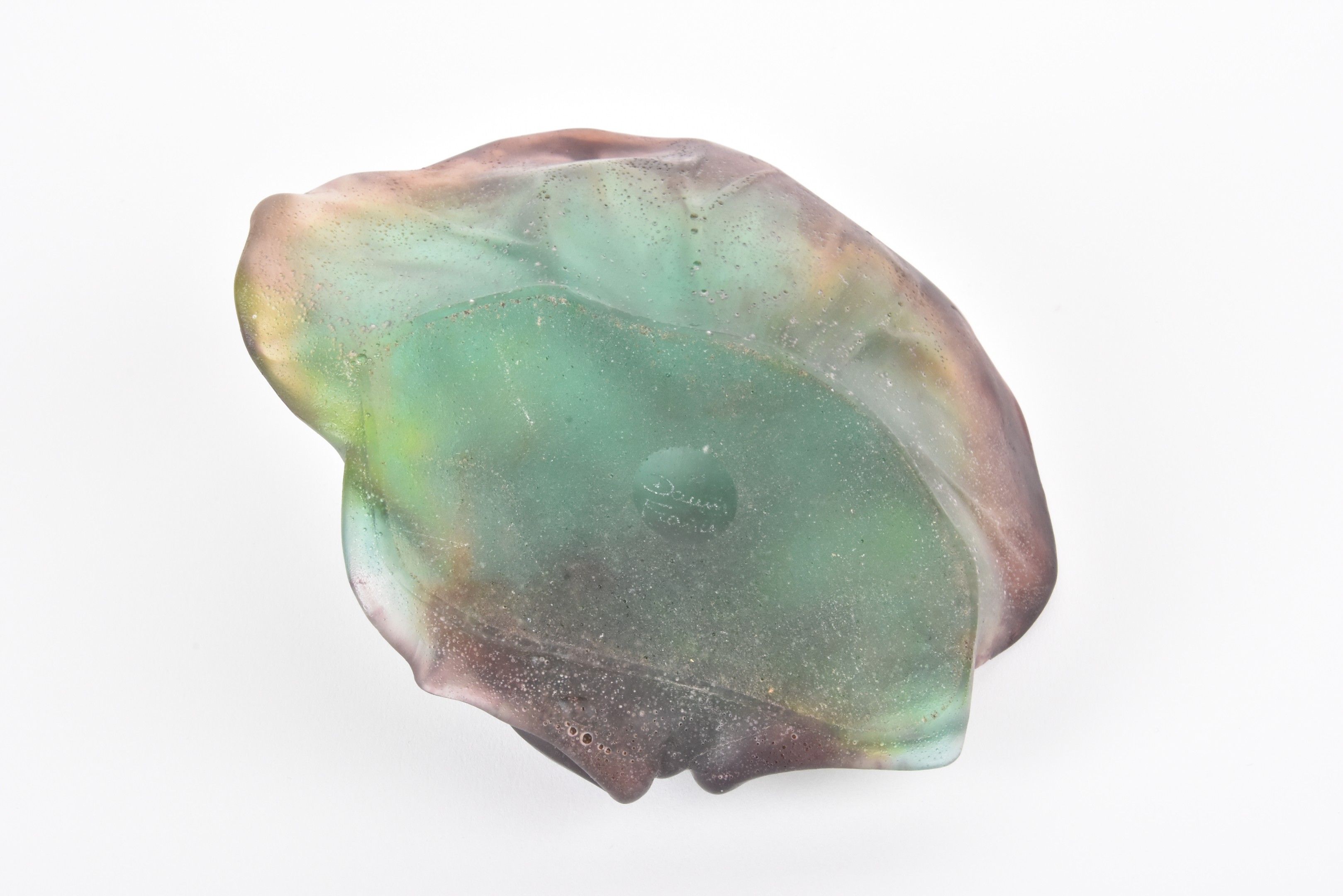 DAUM France - Green and mauve pâte de verre pocket with frog decoration (chip) L. 16 cm