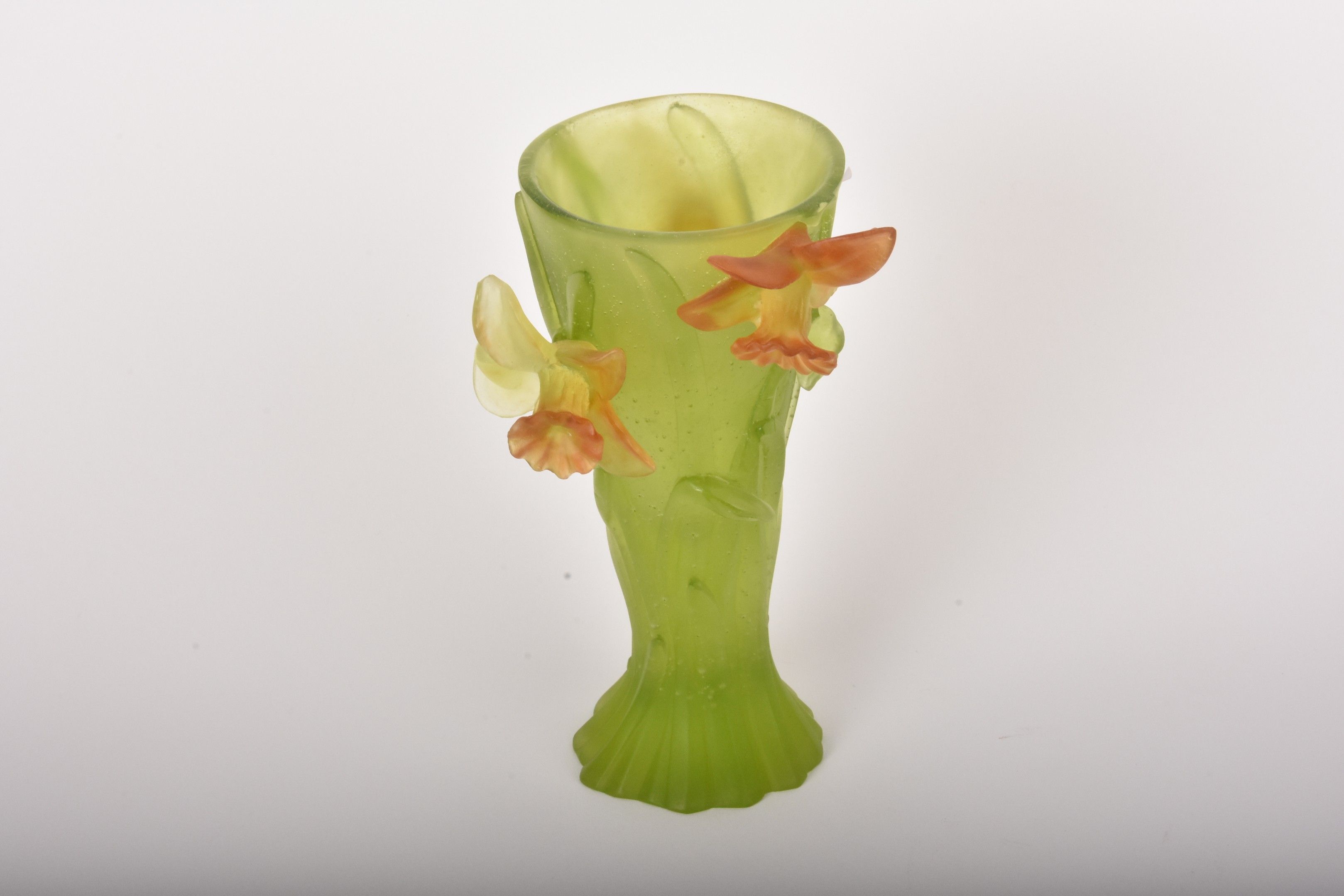 DAUM France - Daffodil vase in green and yellow shaded glass H: 18 cm. In its original box