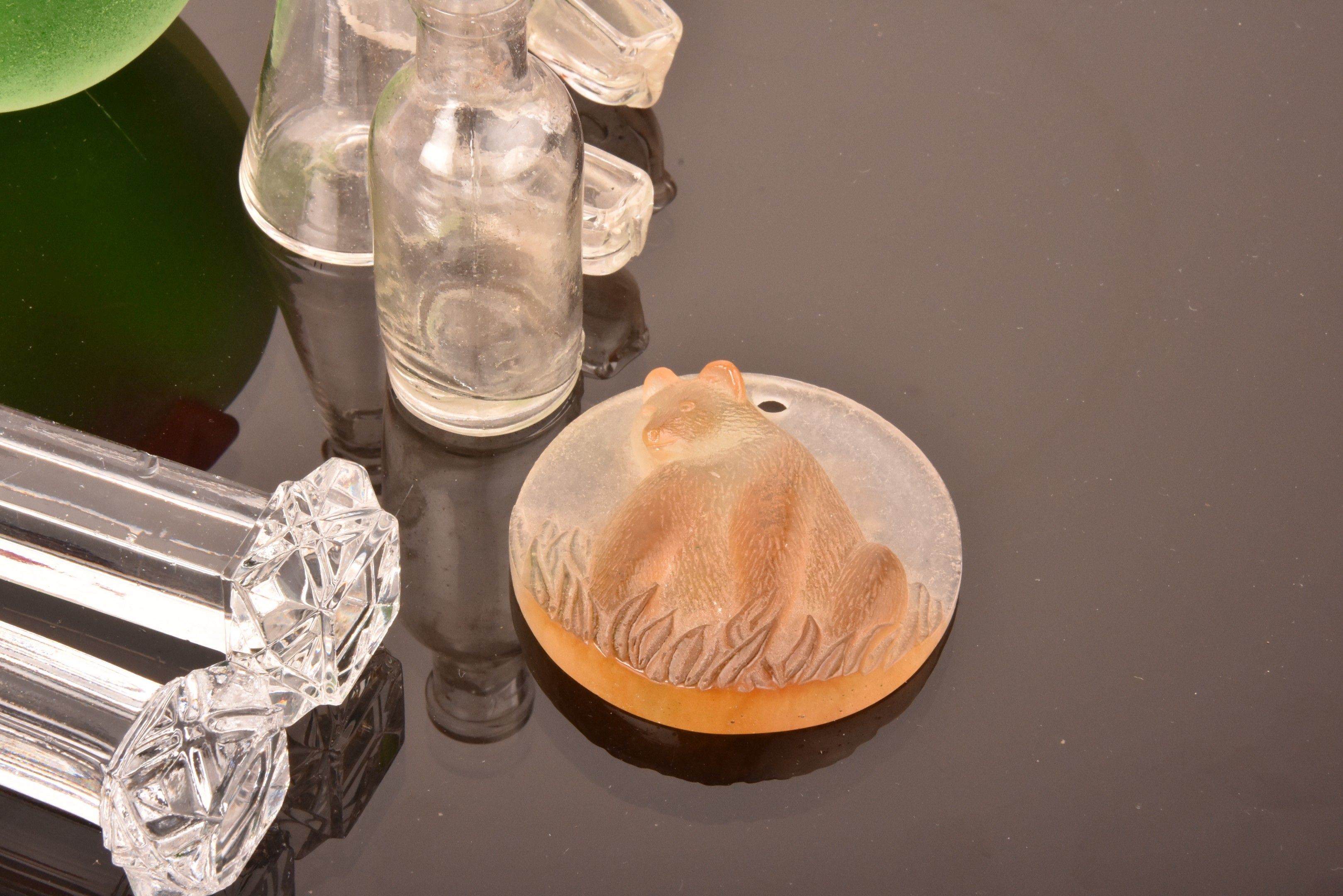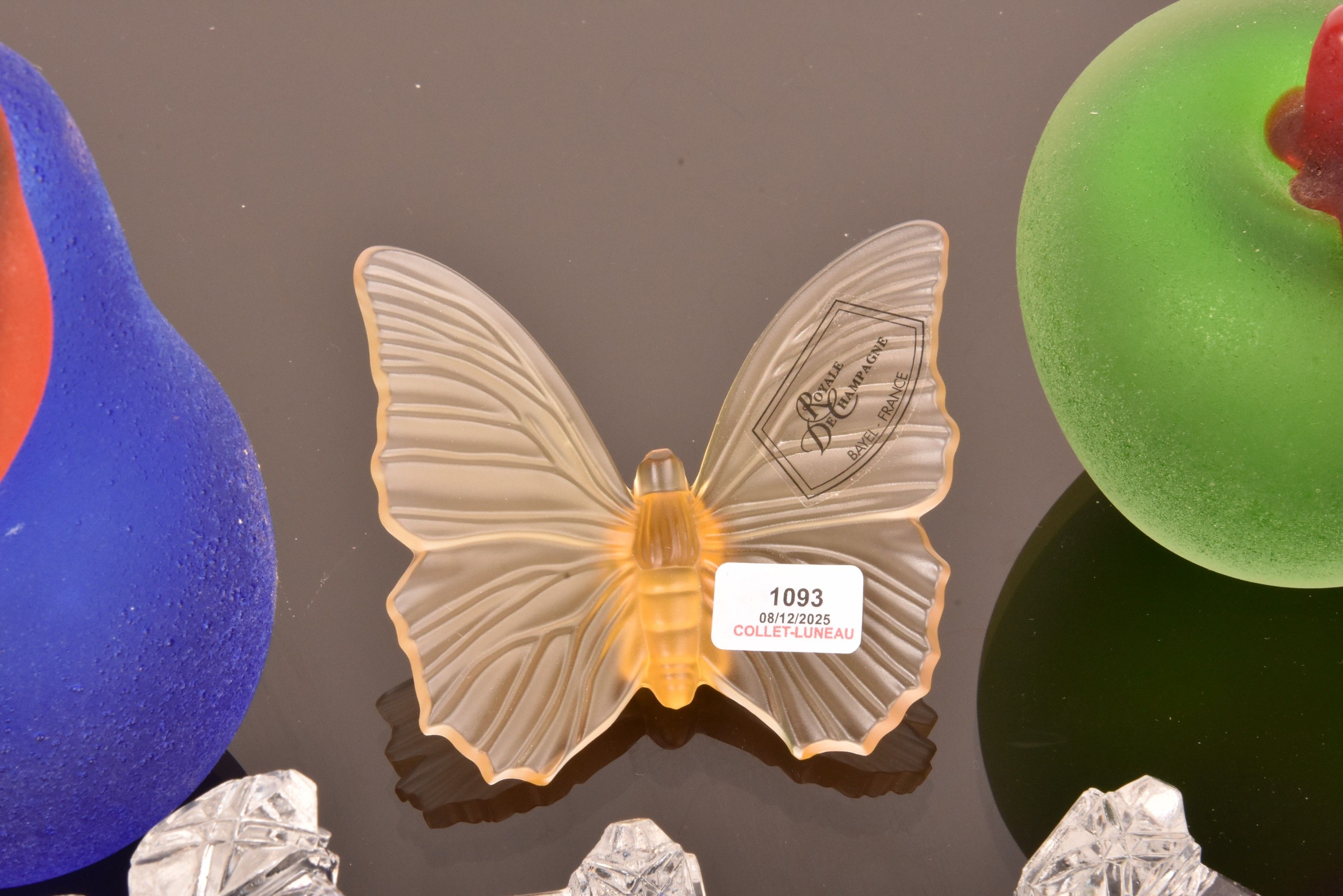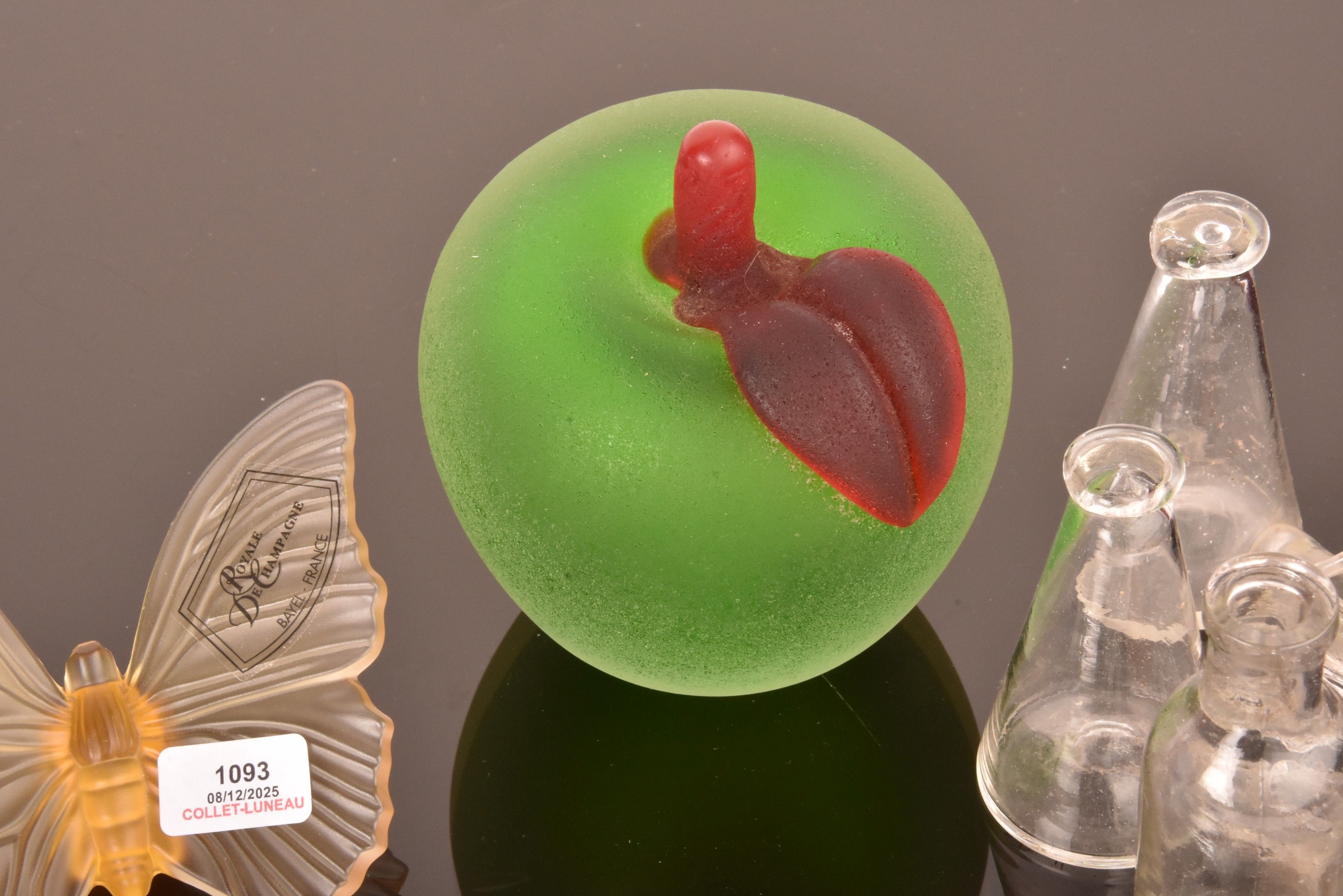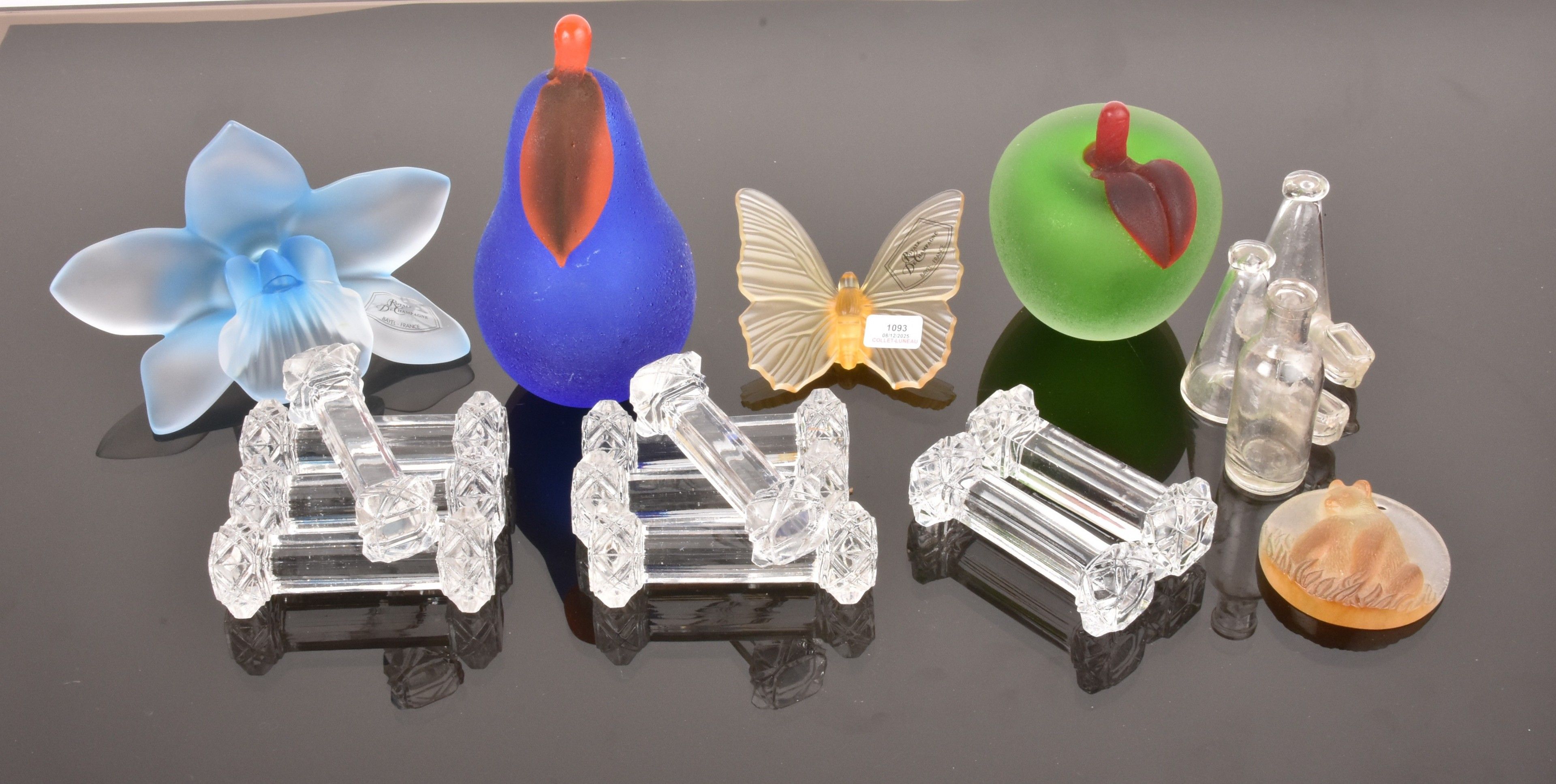 Lot including a butterfly and an orchid from CRISTALLERIEl ROYALE DE CHAMPAGNE, a set of 11 crystal knife-holders, an apple and a pear signed MORETT and a bear medallion.