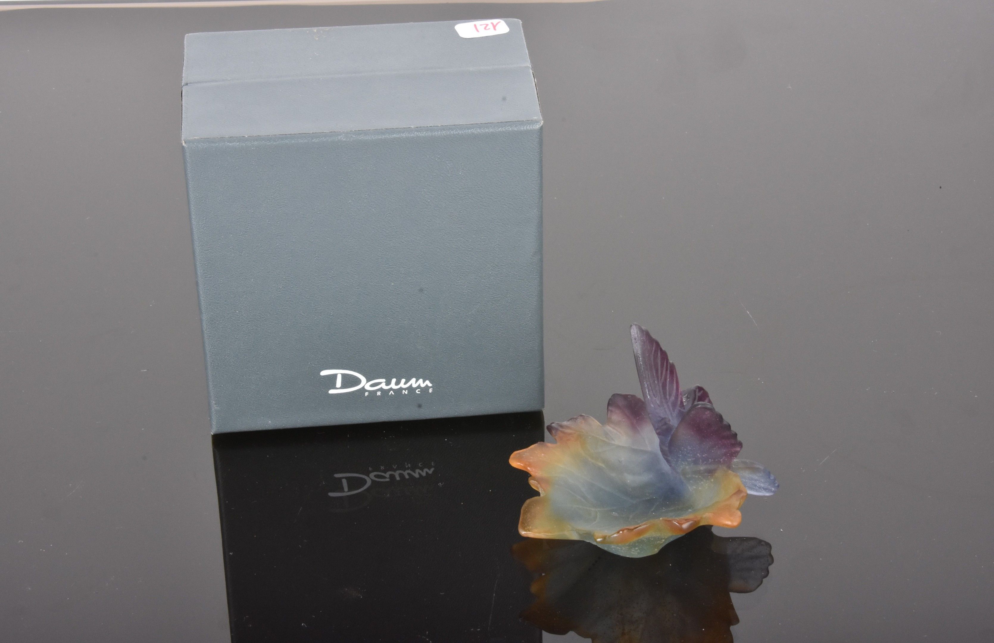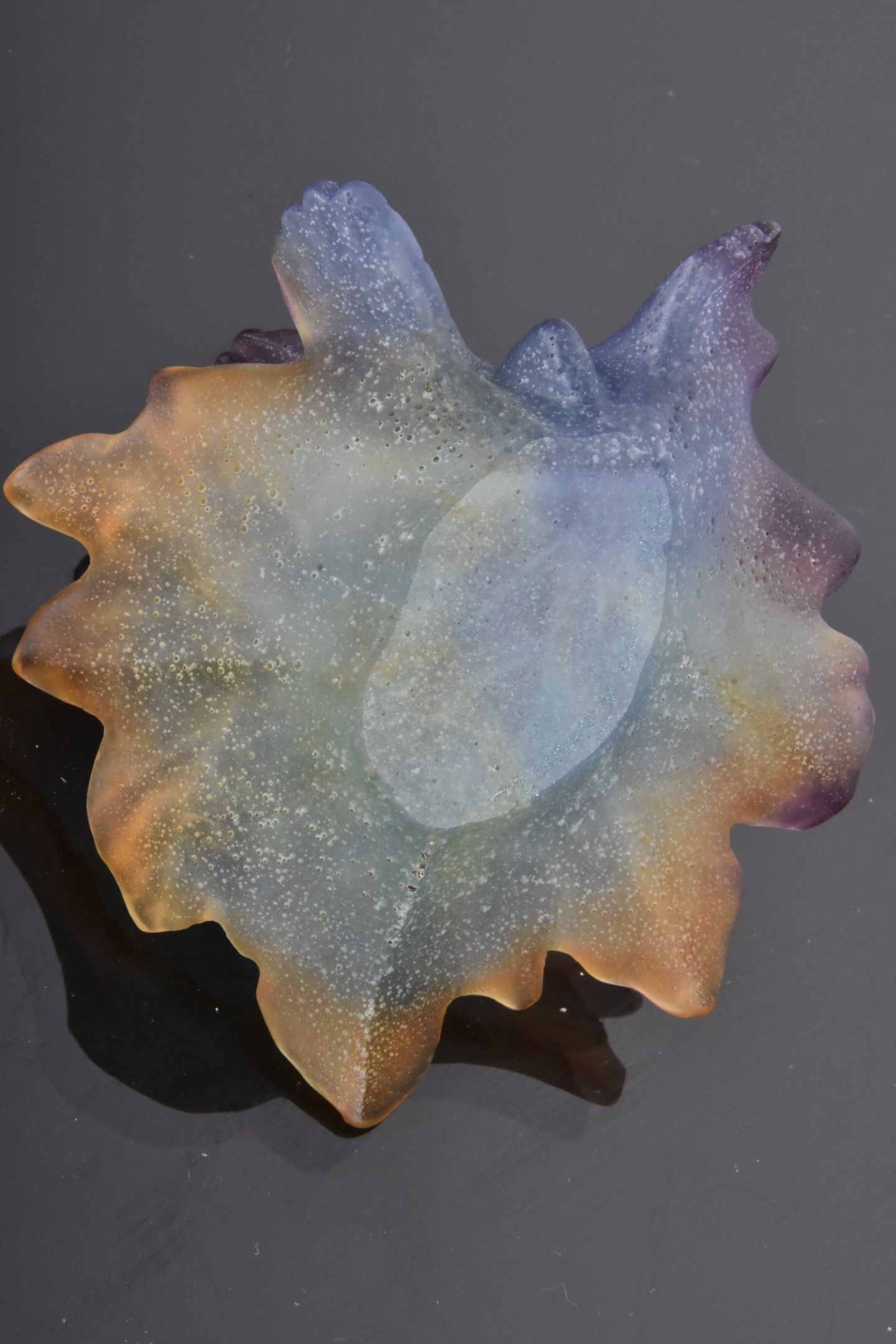 DAUM France - A small brown and mauve coloured pate de verre pocket with a butterfly on a leaf. Signed. H. 6 cm W. 9 cm