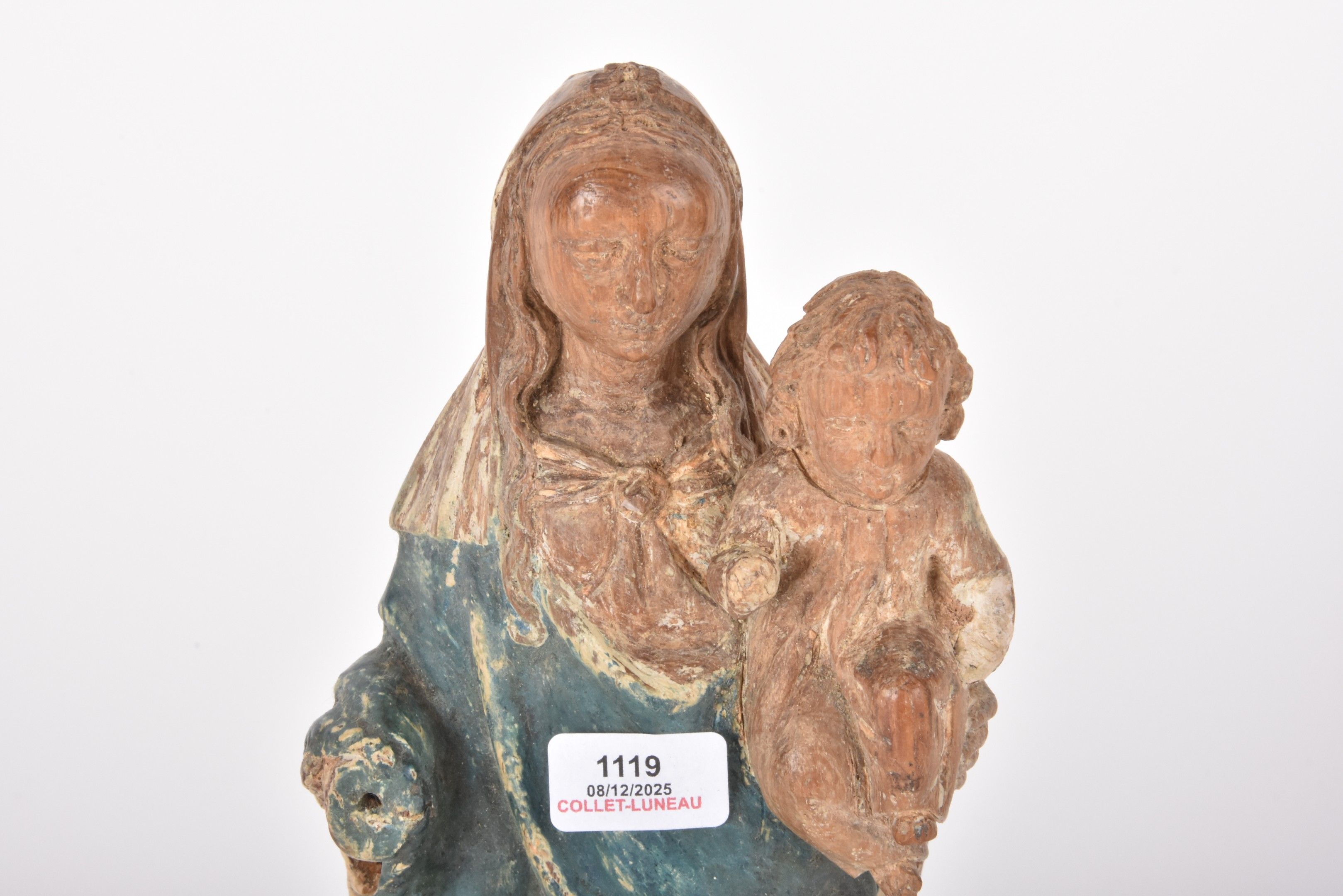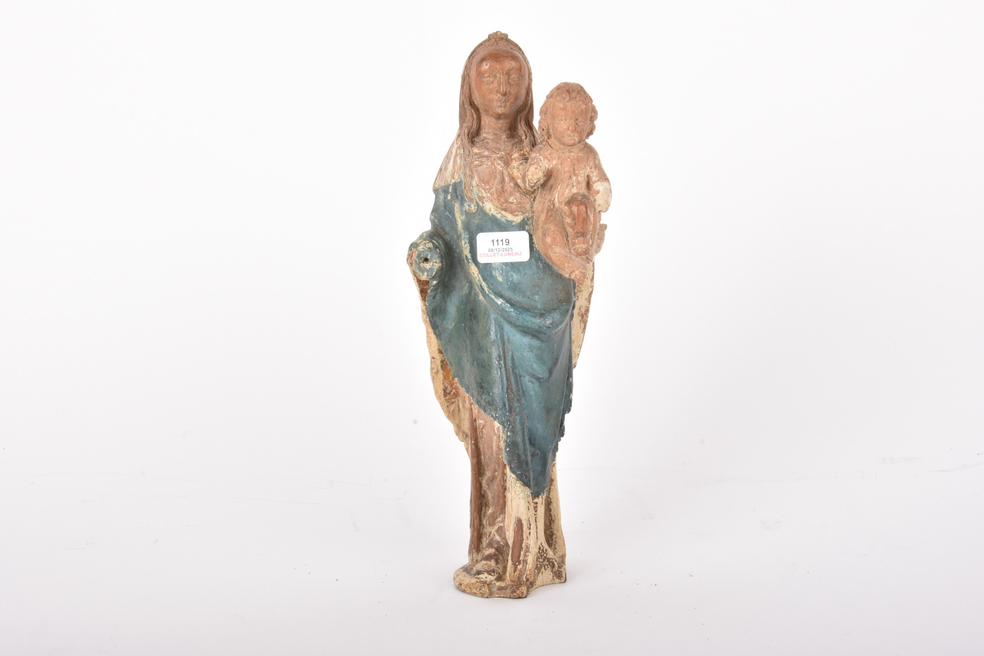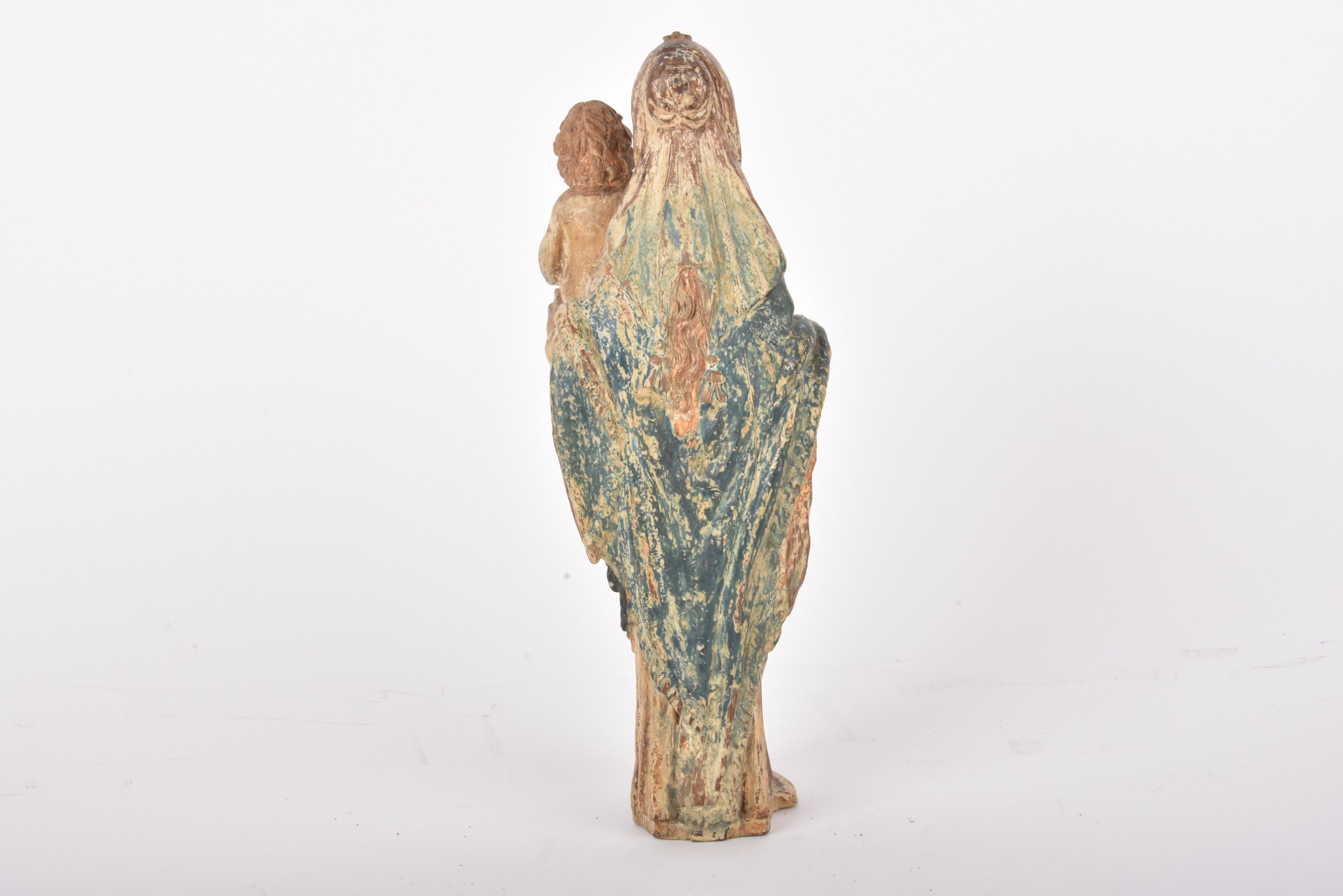 Small polychrome wooden sculpture of the Virgin and Child. Late 18th century, missing parts H: 24 cm