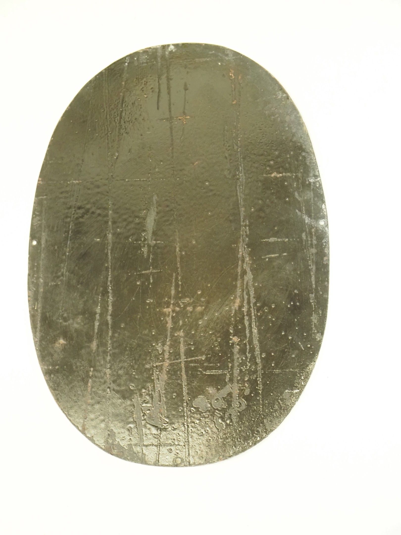 POTASSE D'ALSACE - Sels de - Oval enamelled sheet decorated with a stork on a cathedral background - 4 holes - 59 x 39.5 cm - restored for "Sels de" top left and centre (blue) bottom (black and white) - edge chips