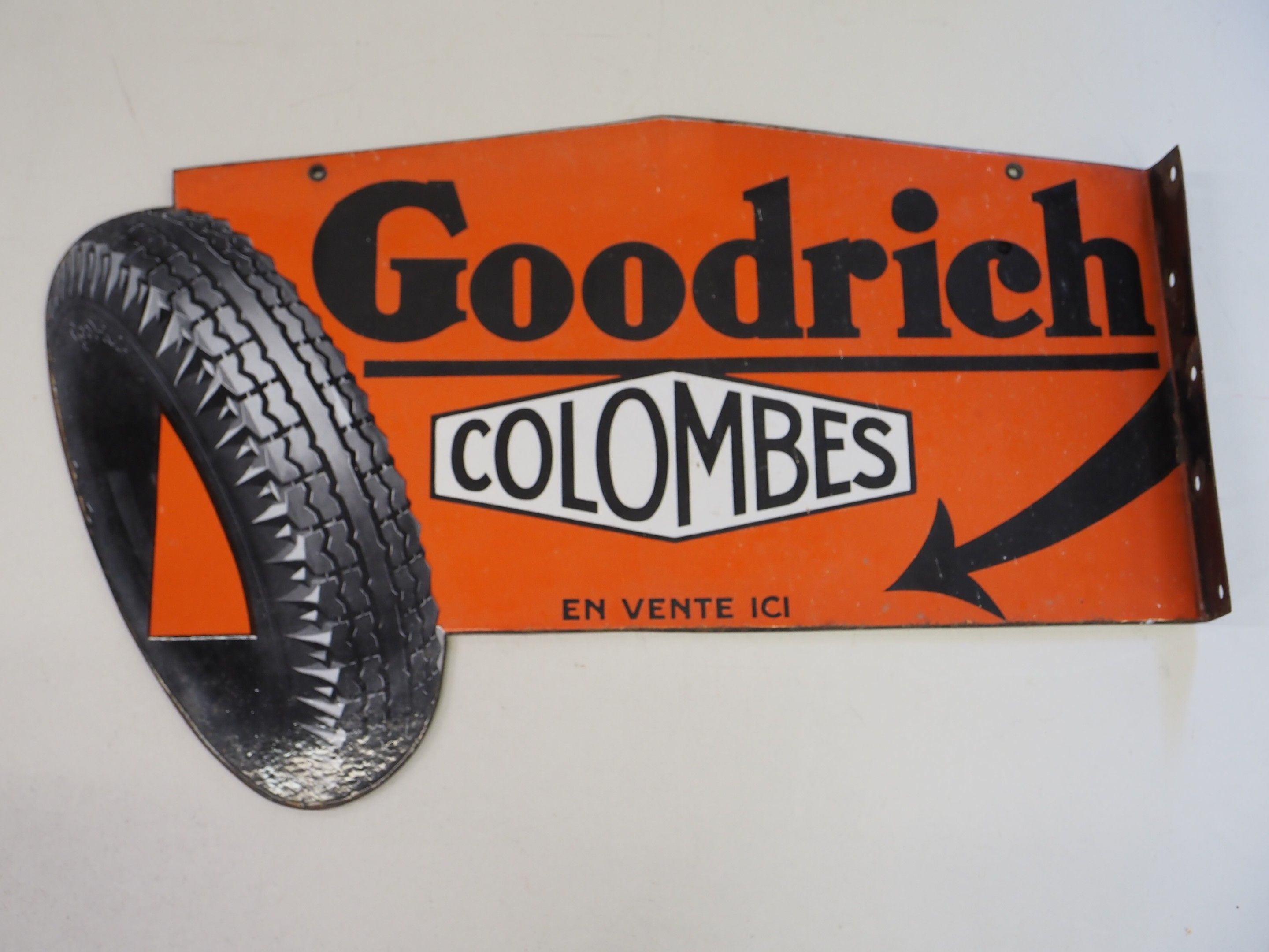 GOODRICH - COLOMBES - Double-sided enamelled sheet metal plate with side bracket - Black lettering and tyre on red, orange and white background - 2 mounting holes - 38.5 and 46.5 x 80 cm - various chips and defects