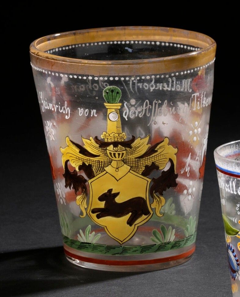 Large glass decorated with a polychrome enamelled coat of arms bearing an inscription "Geinrich von der Affeburg / Tilke von Mollendorff/."