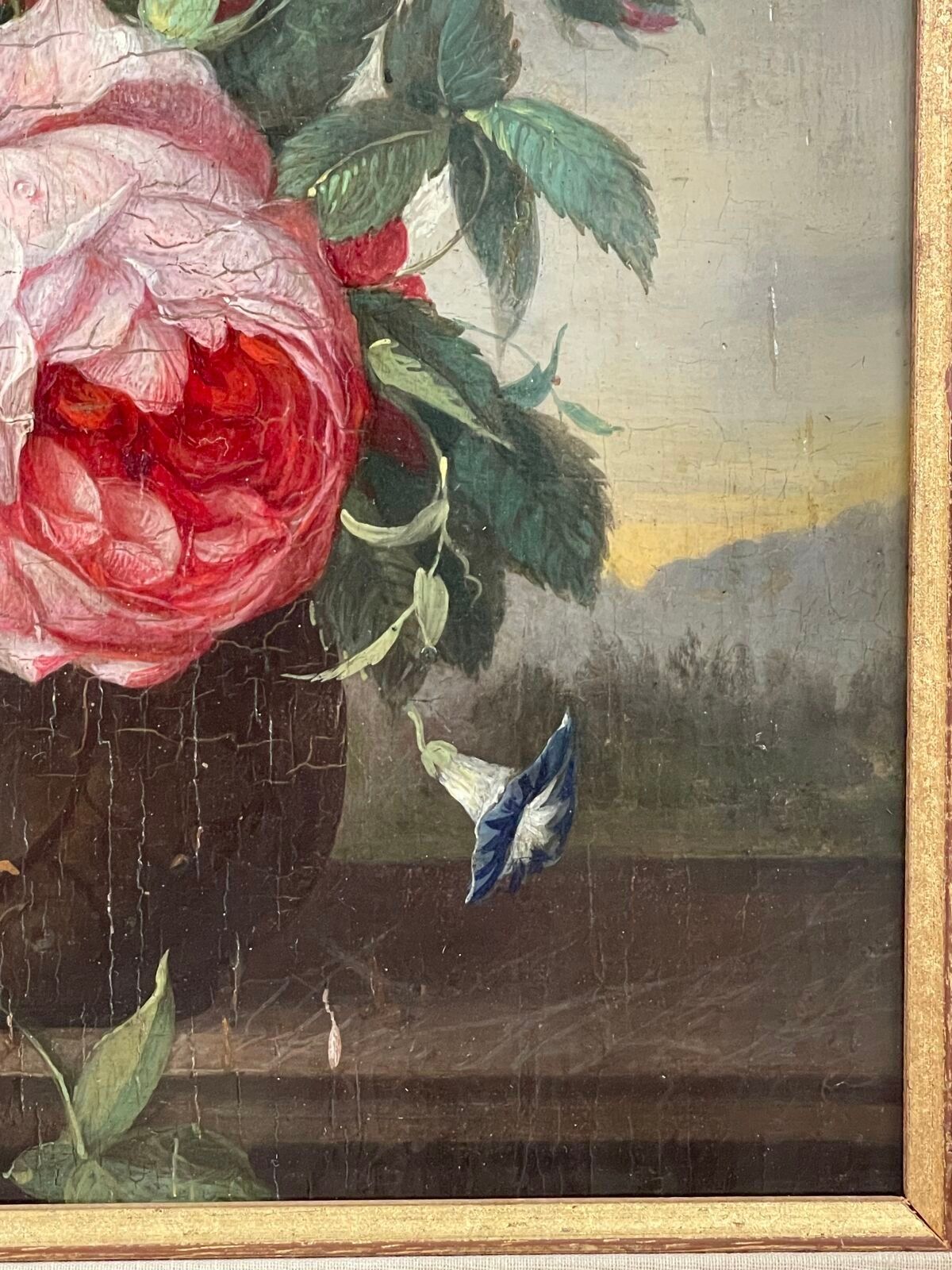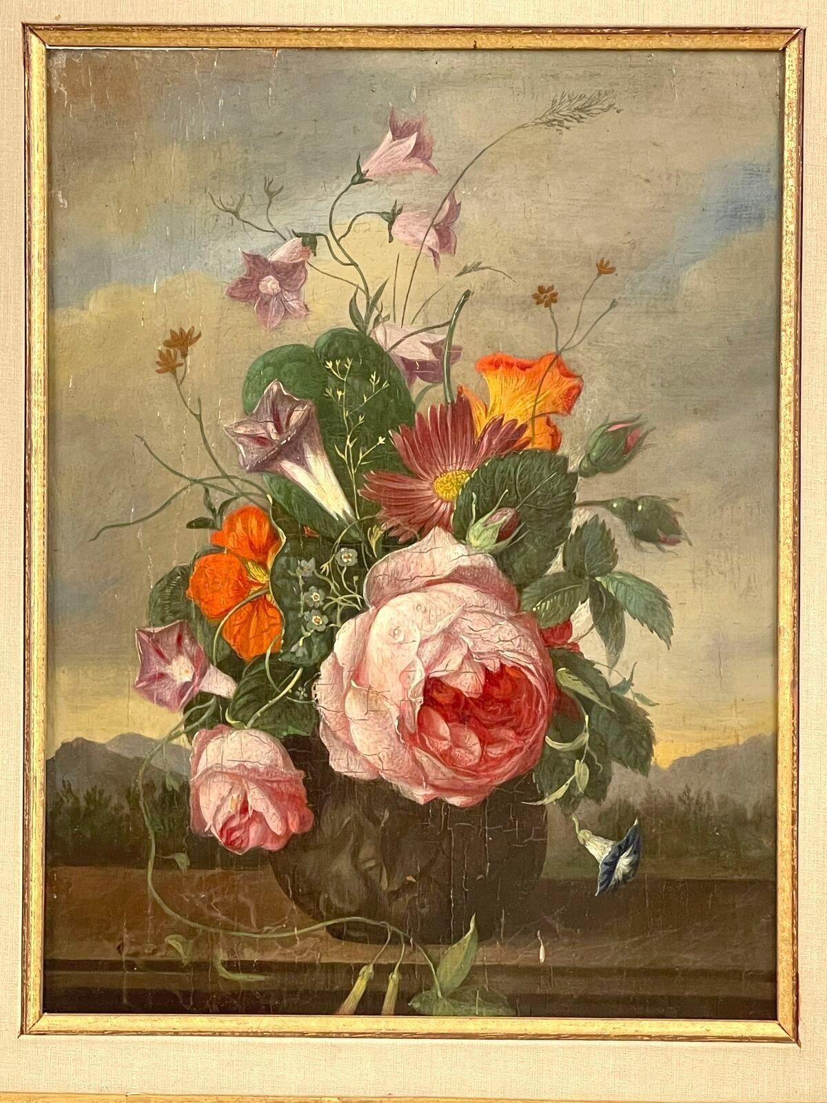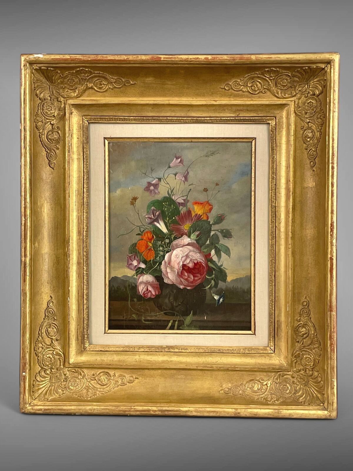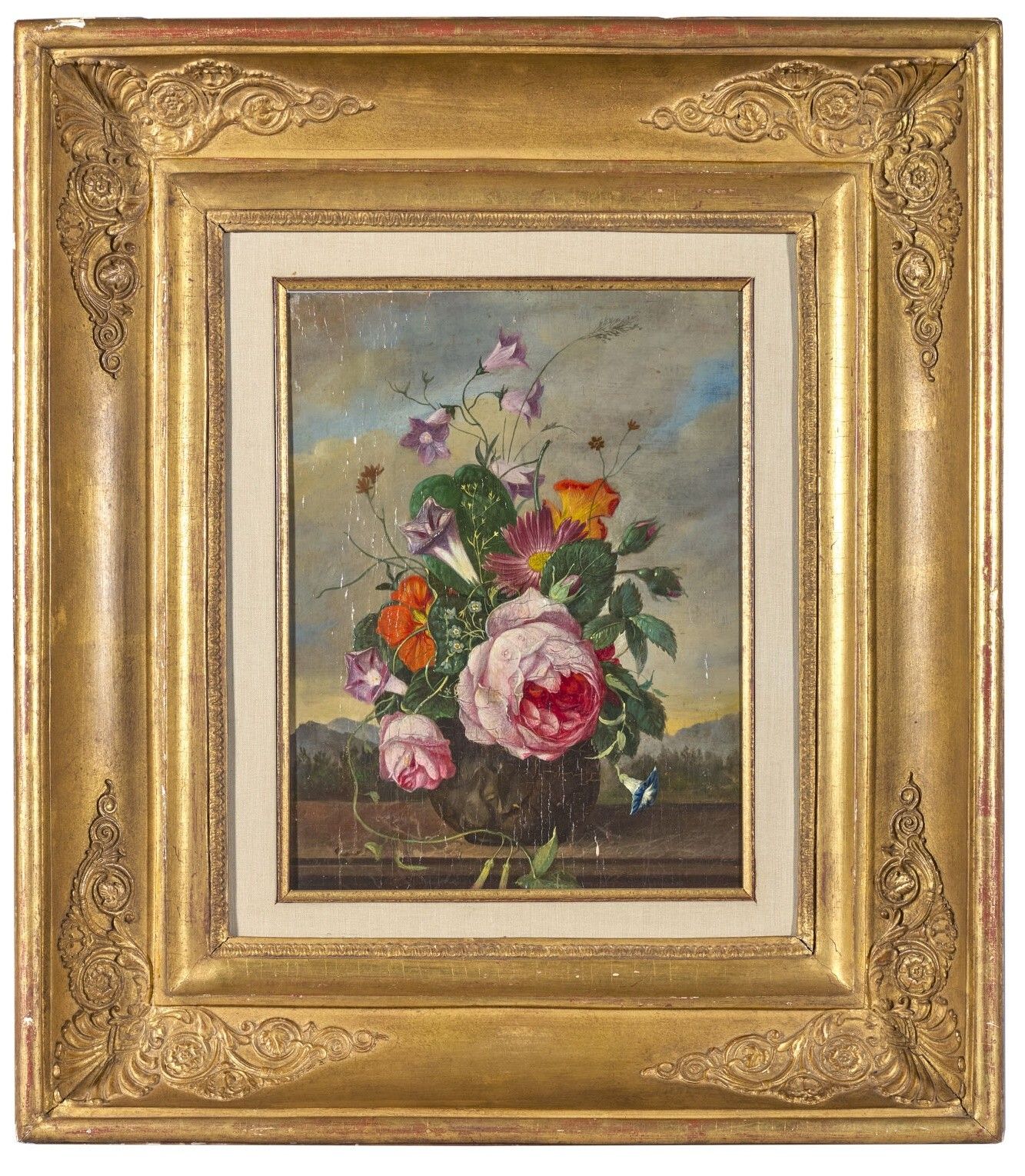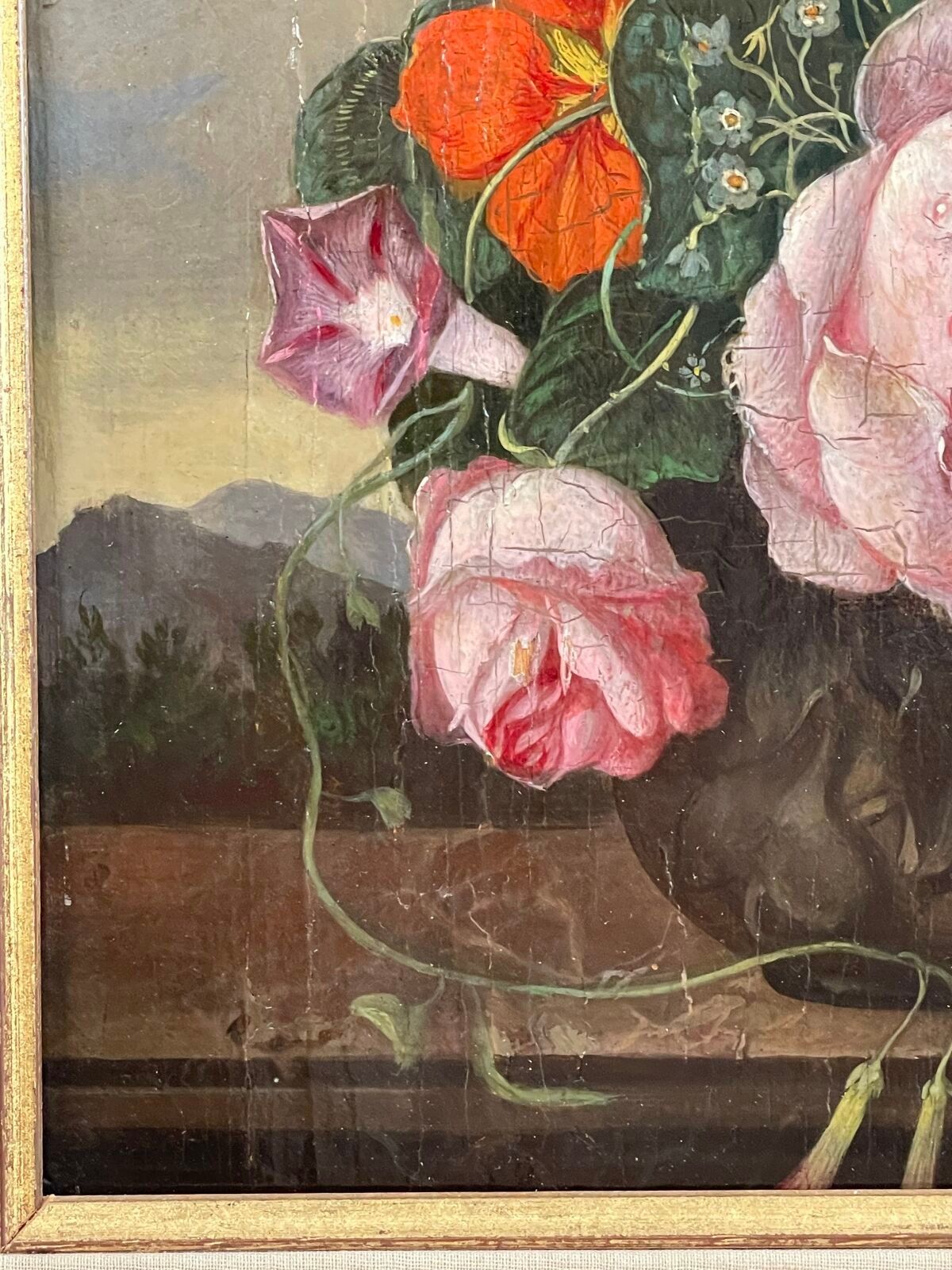 Vase of flowers on an entablature in a landscape.