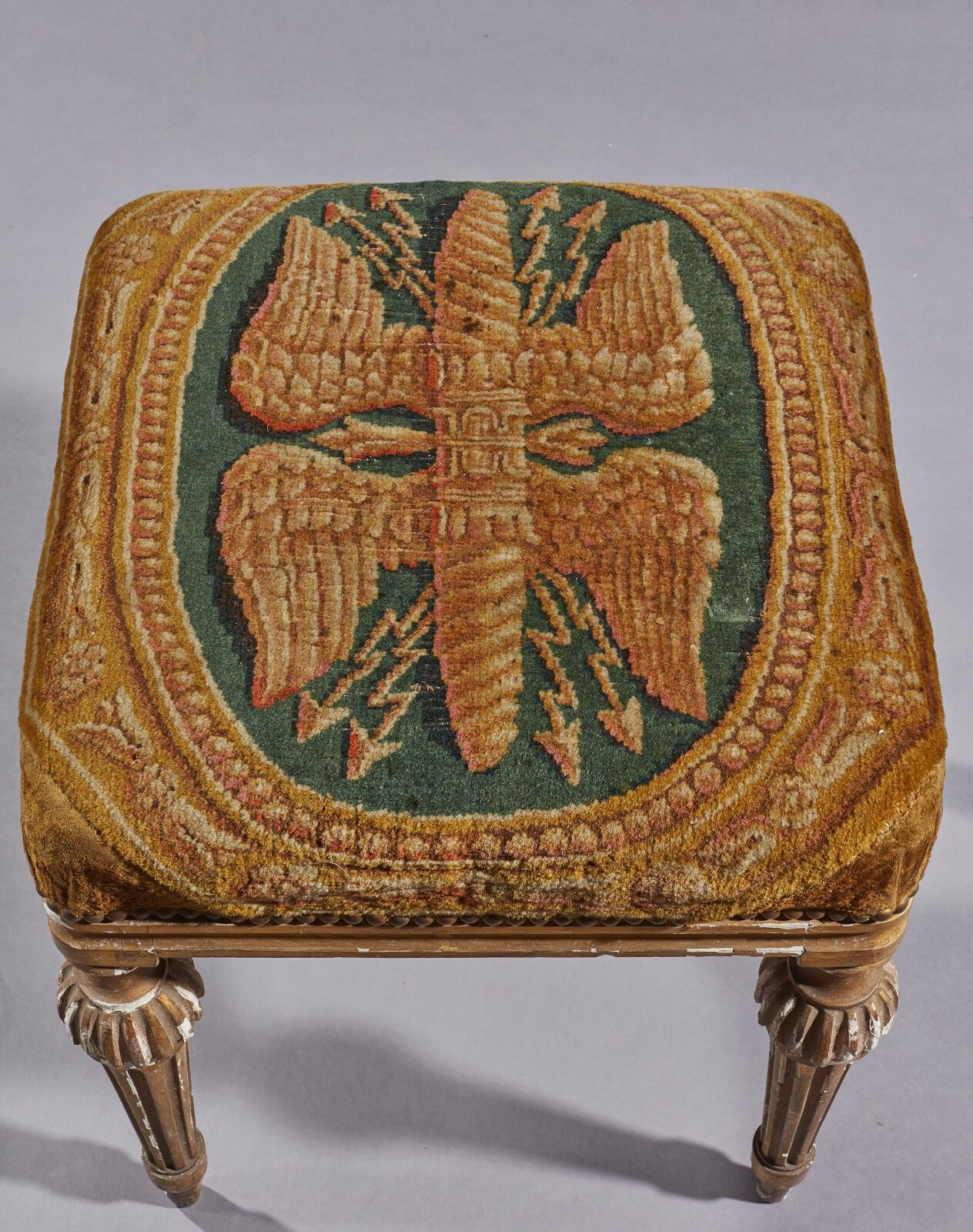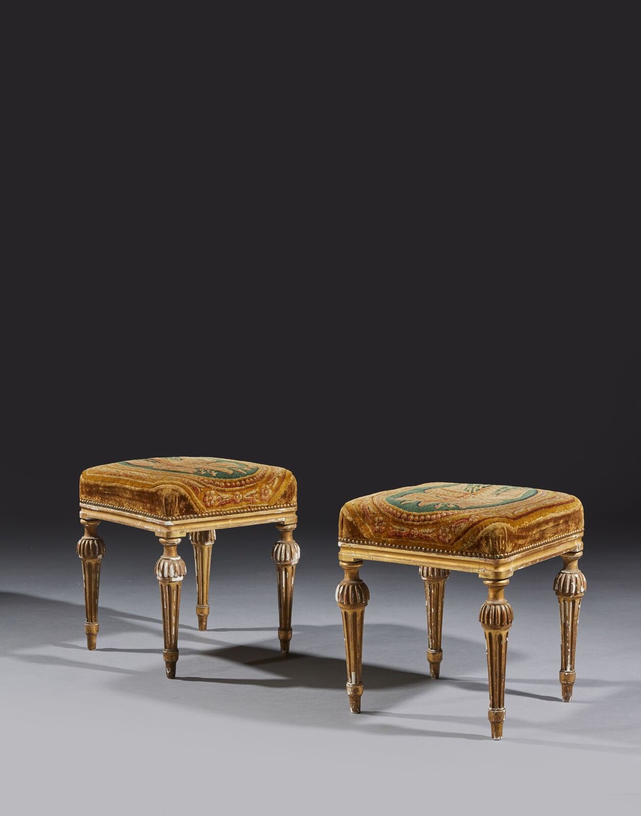 Pair of square stools in moulded and gilded wood, resting on tapered fluted legs, upholstered in Savonnerie point carpet; (accidents and restorations).