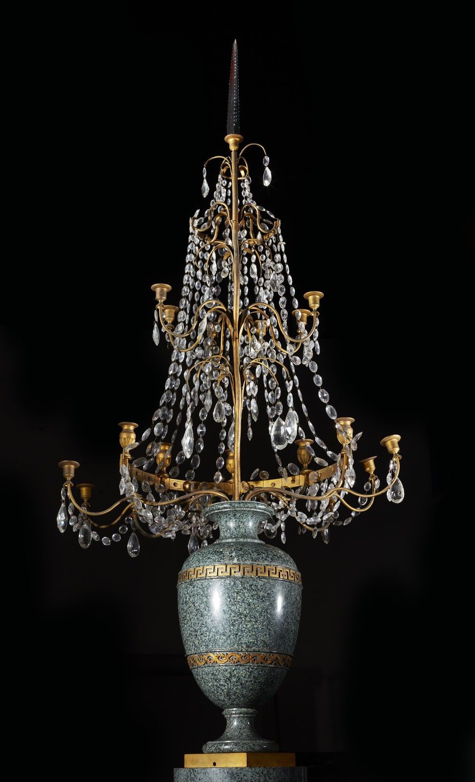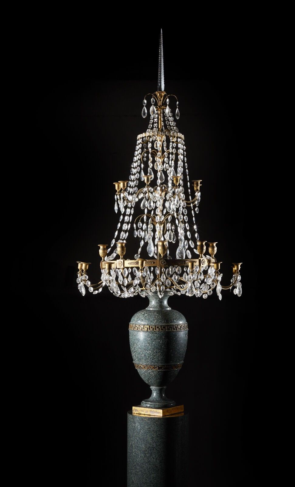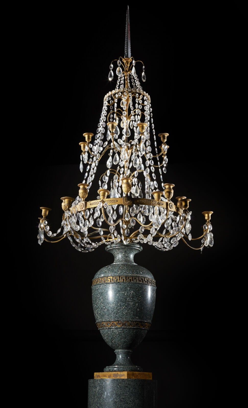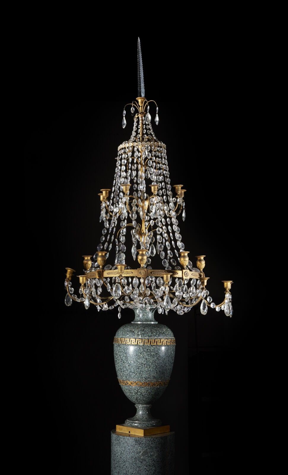 A pair of girandoles on pedestals in green granite, ormolu and cut glass, with nineteen lights on three rows, decorated with palmettes, grecques and rosettes, garlands of cabochons and pendants; (accidents and missing parts).