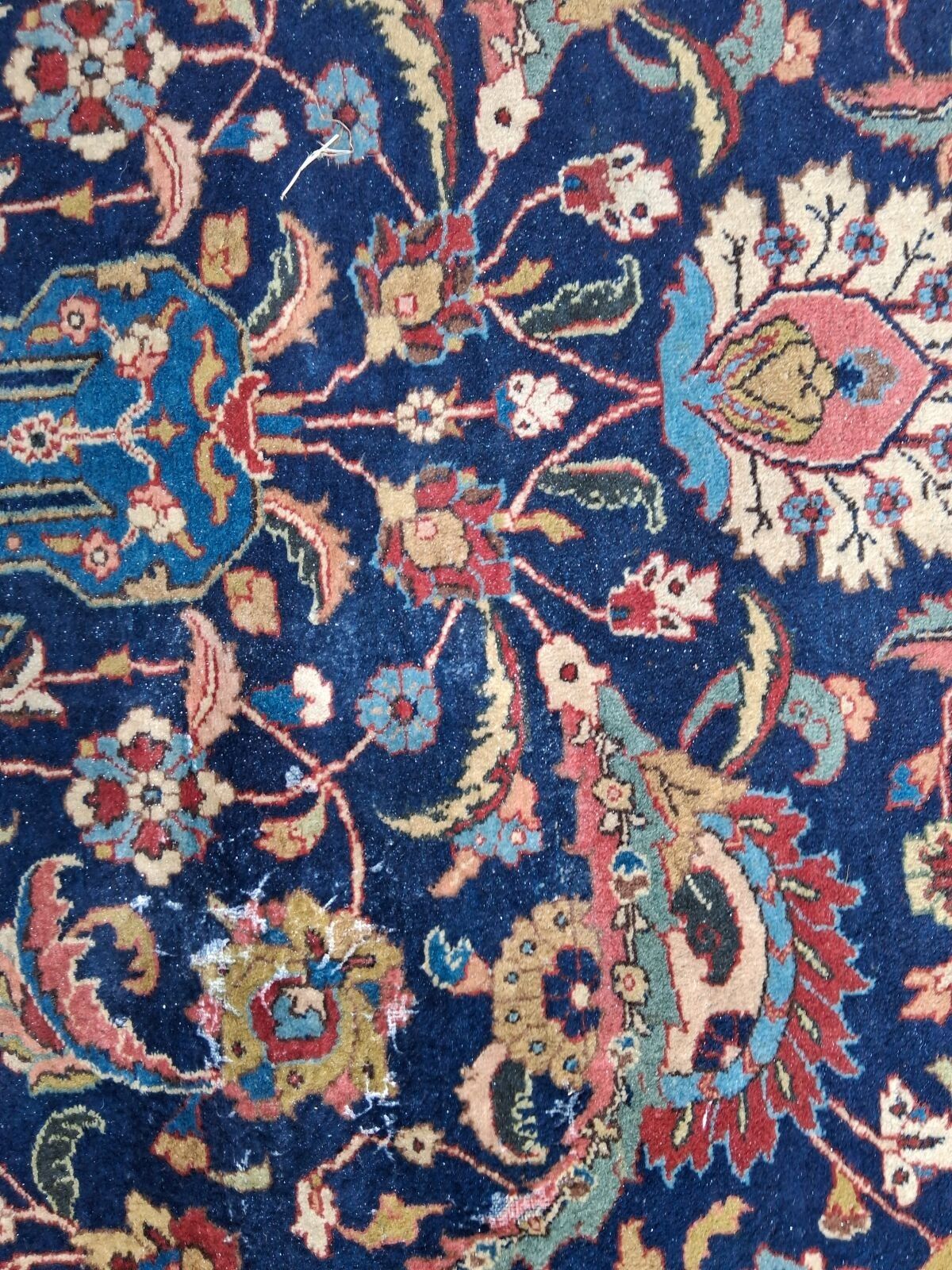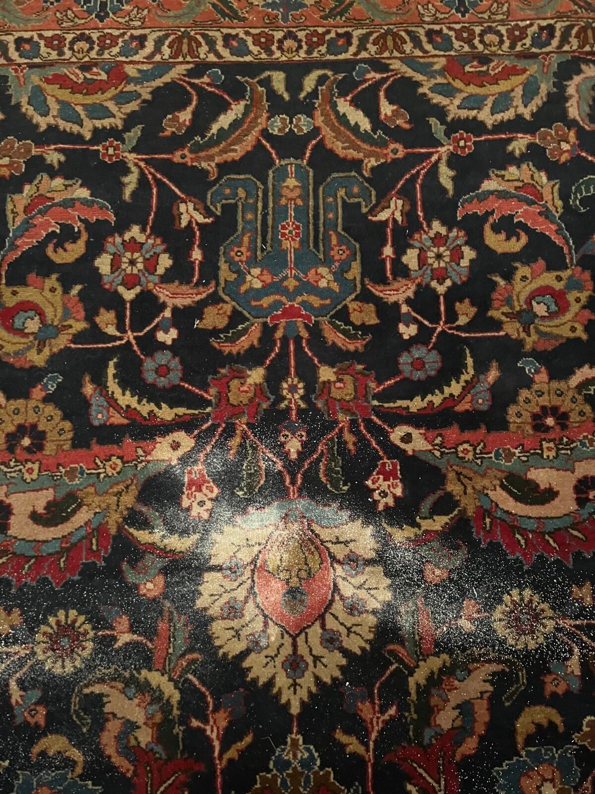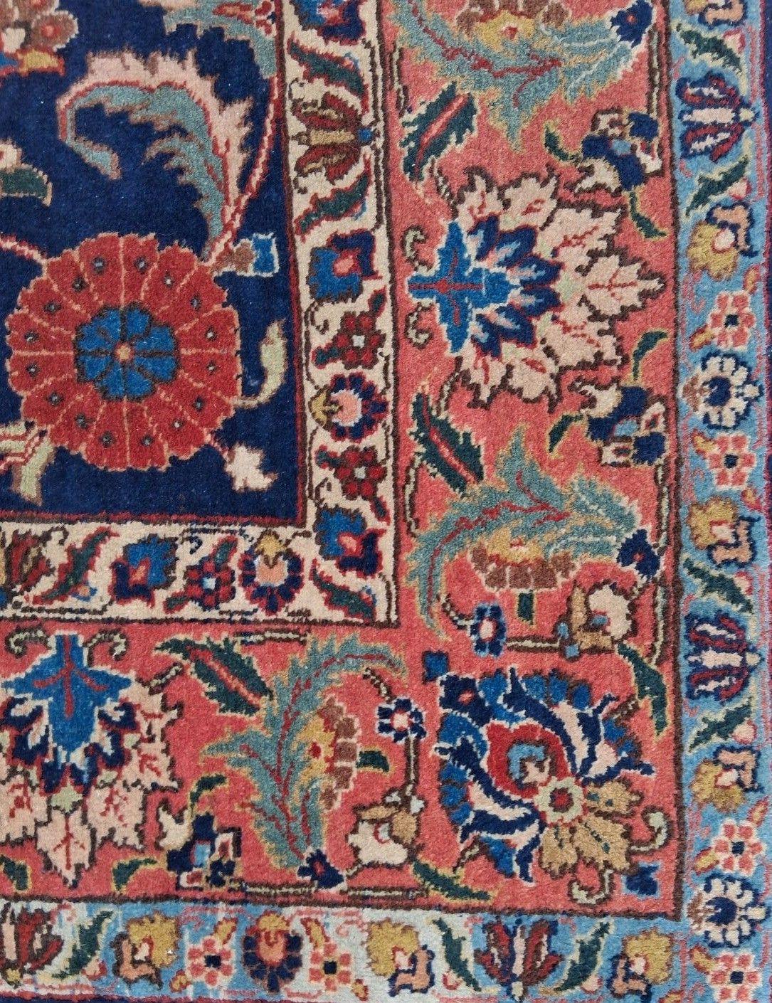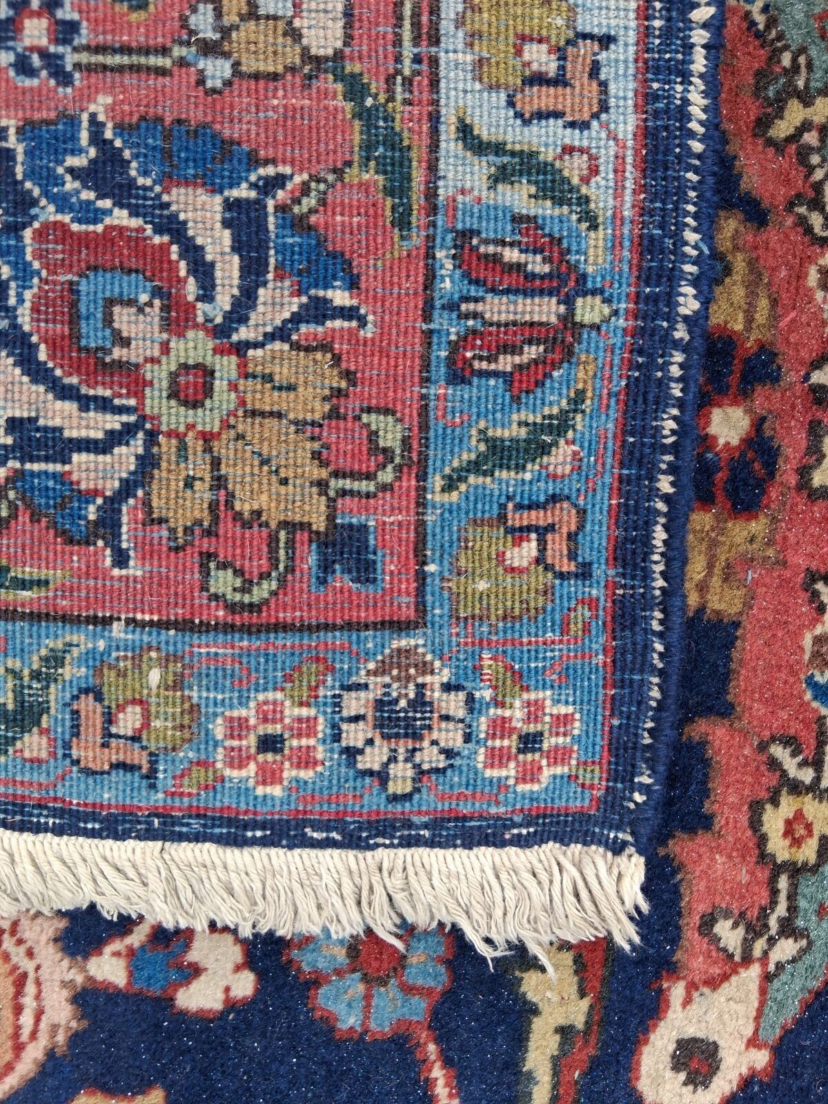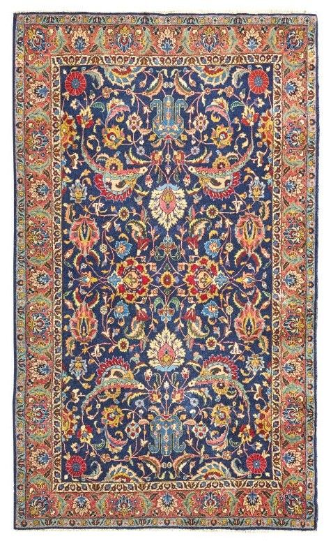 The carpet is embellished with an elegant polychrome stylised floral design on a navy blue background. A wide red border with garlands of flowers is framed by two counter-borders.