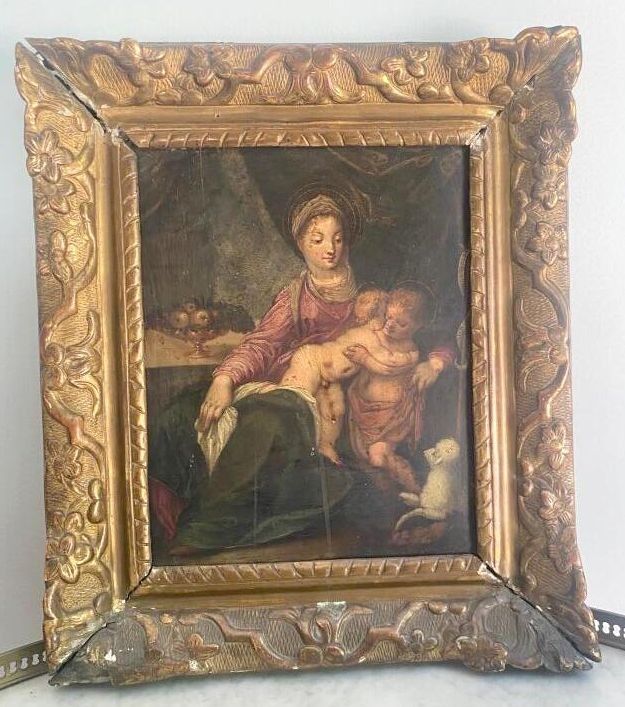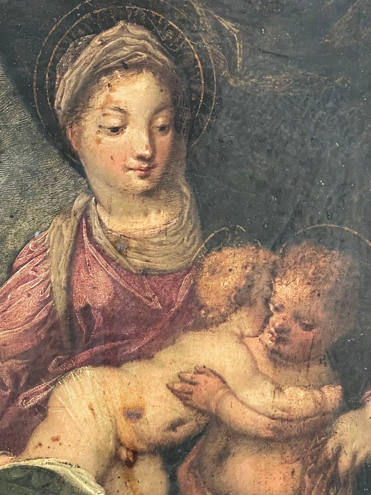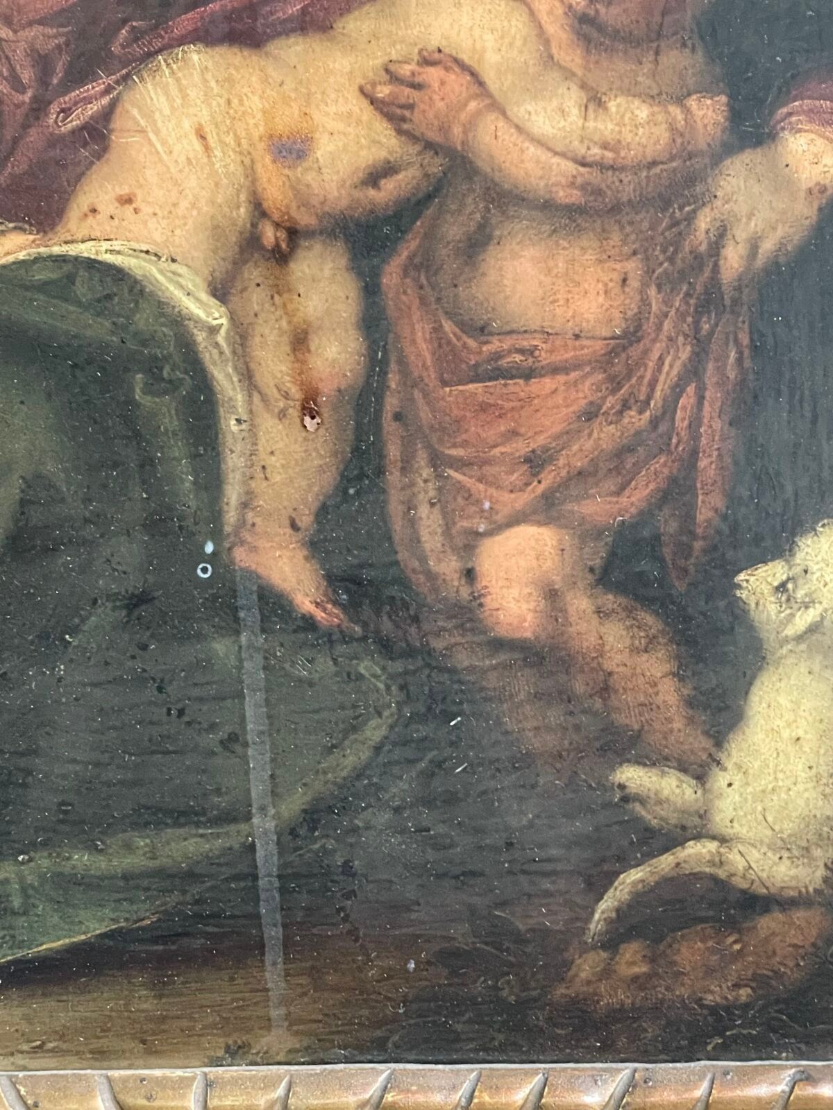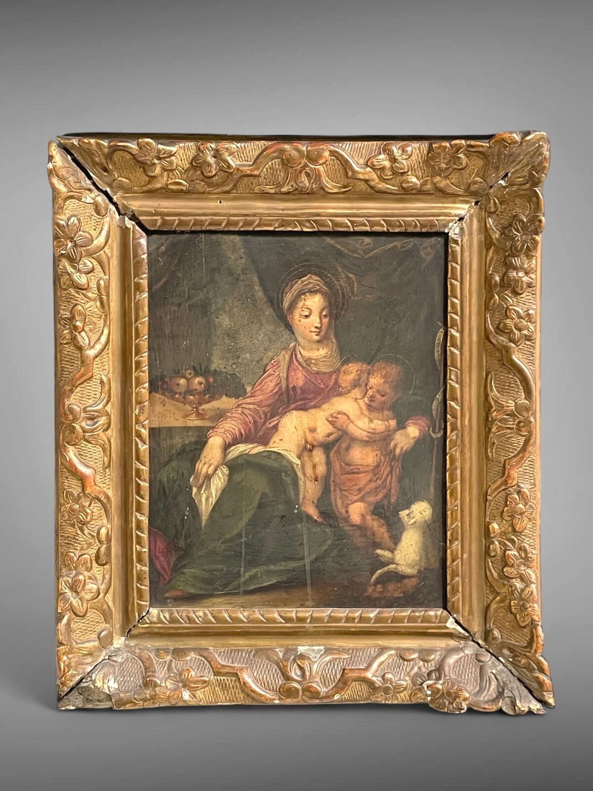 Flemish school of the 17th century, entourage of ROTTENHAMER Virgin and Child with Little Saint John the Baptist Copper Height 26 cm; Width: 20.8 cm Gilded carved wood frame, French work from the 18th century Expert : Cabinet TURQUIN - Stéphane PINTA.