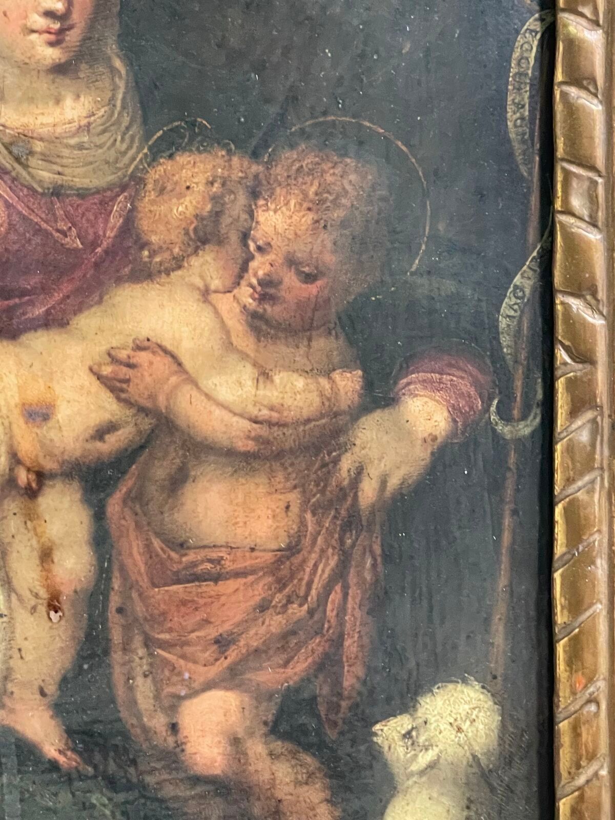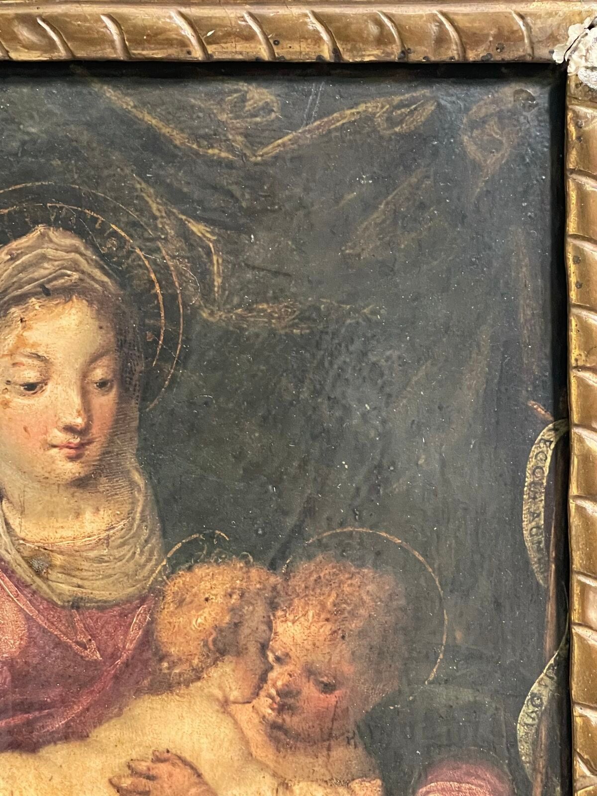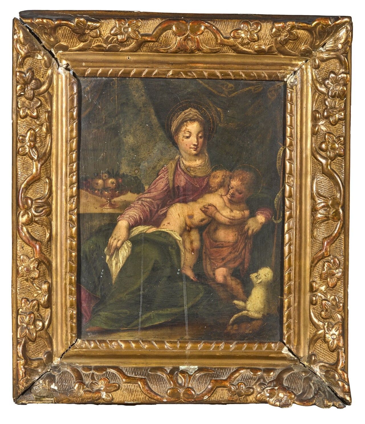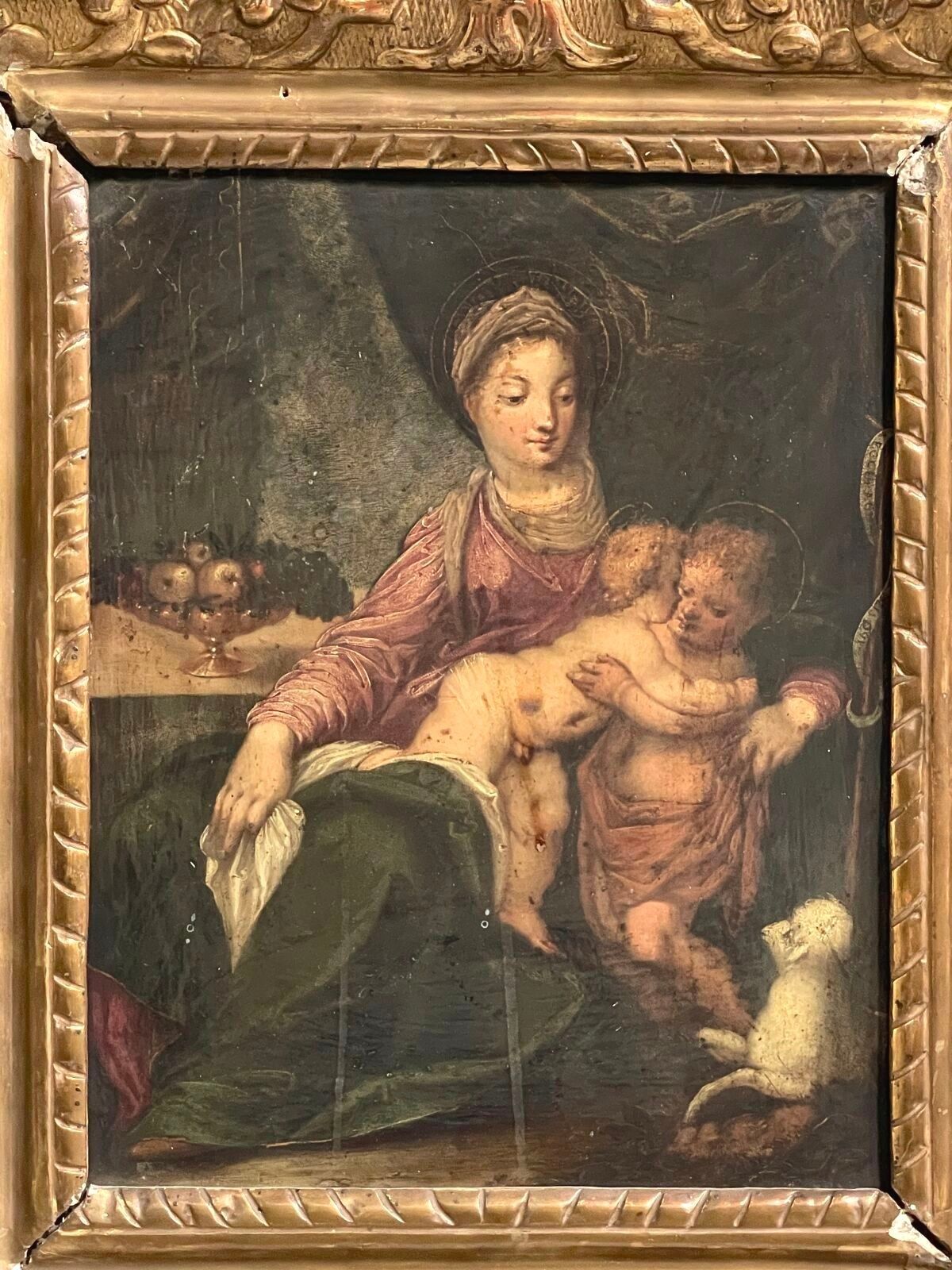 Flemish school of the 17th century, entourage of ROTTENHAMER Virgin and Child with Little Saint John the Baptist Copper Height 26 cm; Width: 20.8 cm Gilded carved wood frame, French work from the 18th century Expert : Cabinet TURQUIN - Stéphane PINTA.