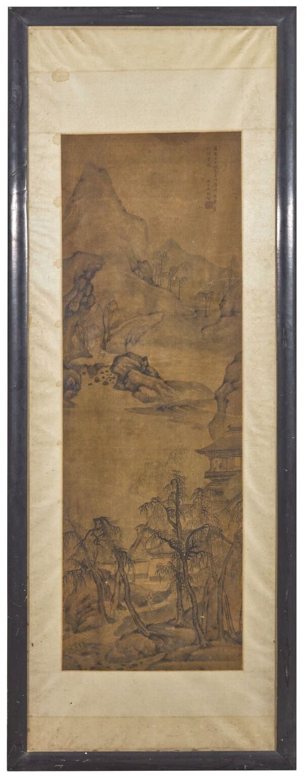 Ink and colours on silk, letter in a pavilion in a mountainous landscape. Bears the apocryphal signature of Wen Zhengming.