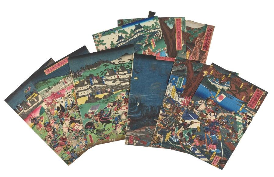 An oban tate-e, the battle of Okugawa and Kinugawa from the 7th month to the 9th month of the 5th year of Kohei, 1062. Signed Ichijusai Yoshikazu ga, publisher Kansendo. Dated 1855 (Holes). Size 35.6 x 24.8 cm.
