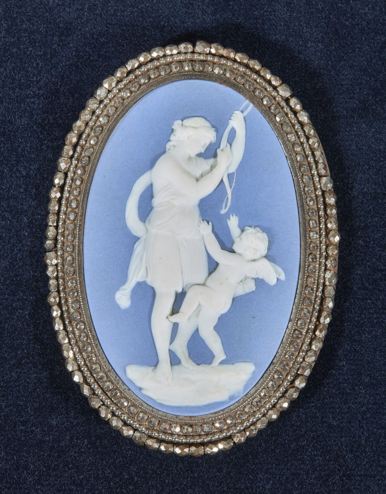 Oval cameo medallion of Diana disarming Cupid after Pompeo Batoni (1761) in Wedgwood stoneware with blue ground and white relief edged with three rows of faceted steel pearls. Steel mounting pierced to be sewn onto the belt and central hook.