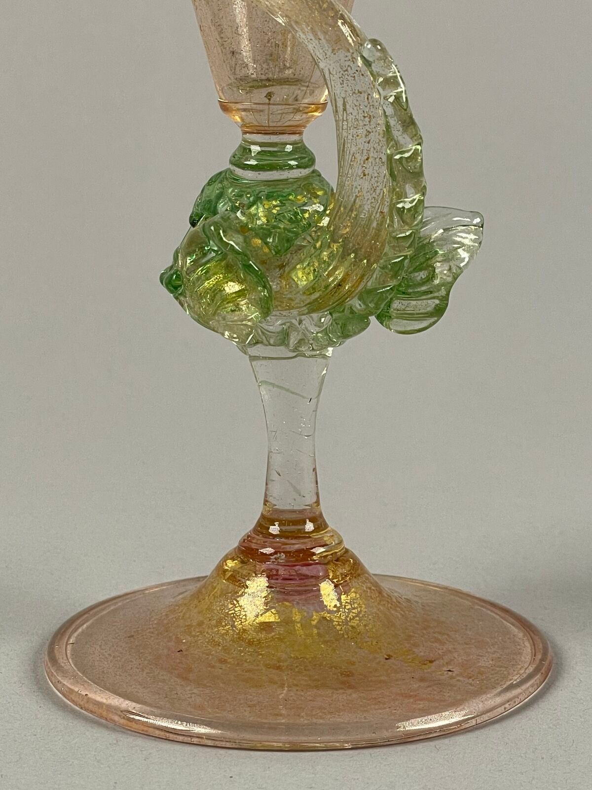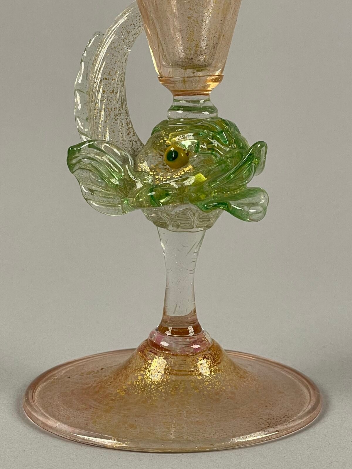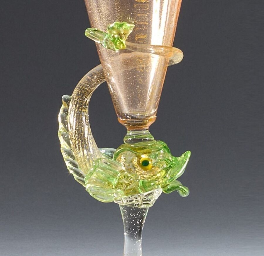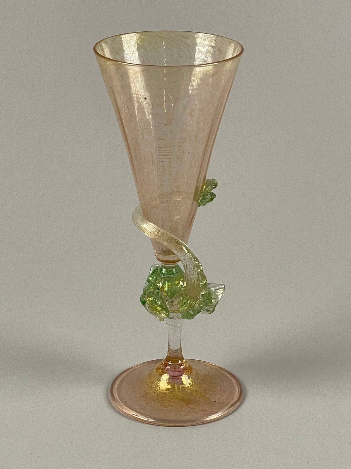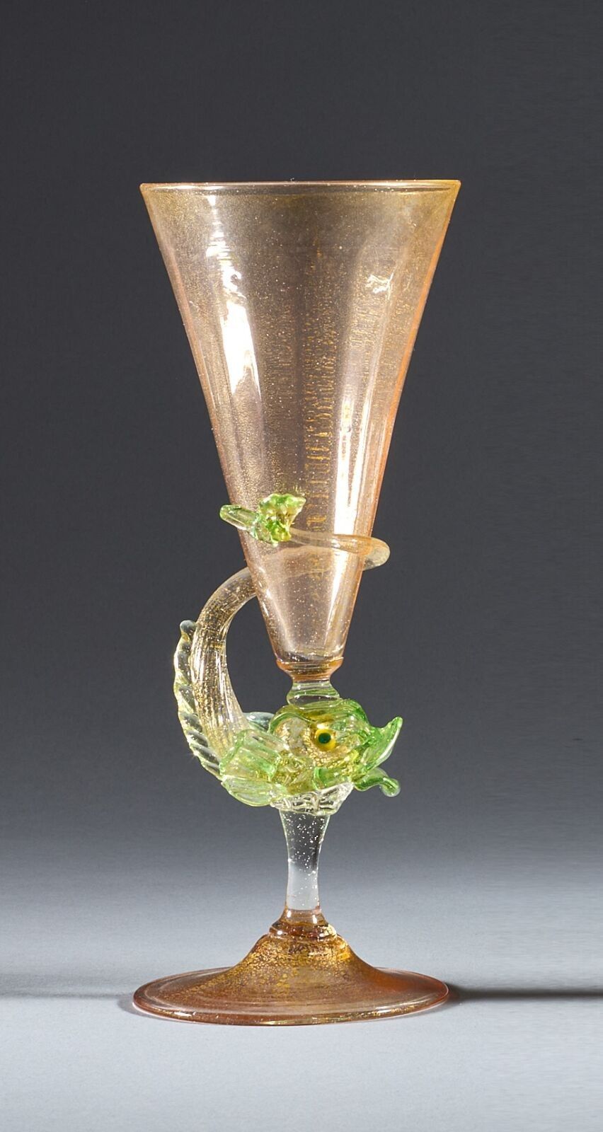 Conical blown and tinted glass with relief decoration of a dolphin wrapped around the leg and the bowl, resting on a circular base.