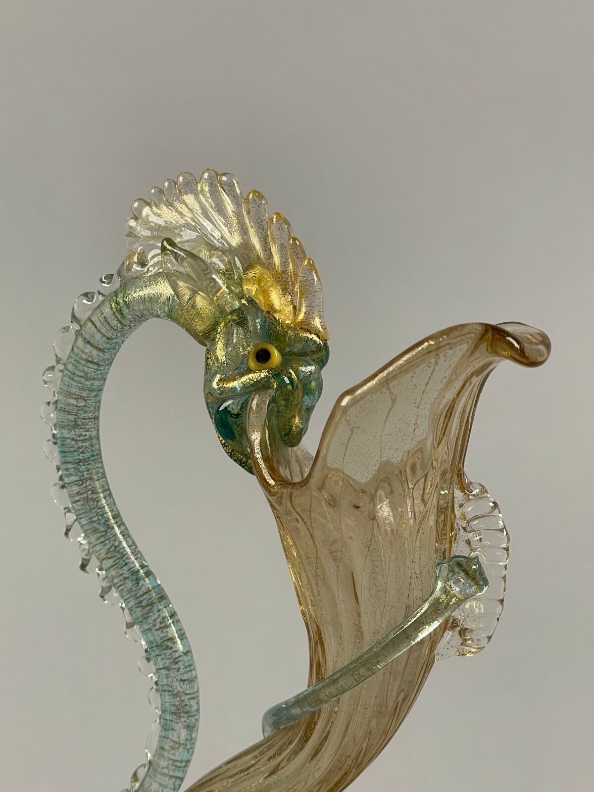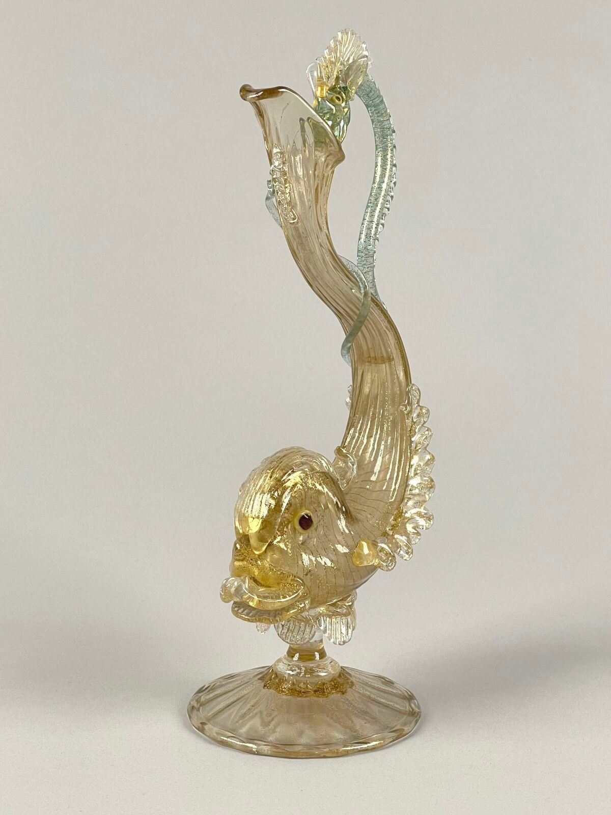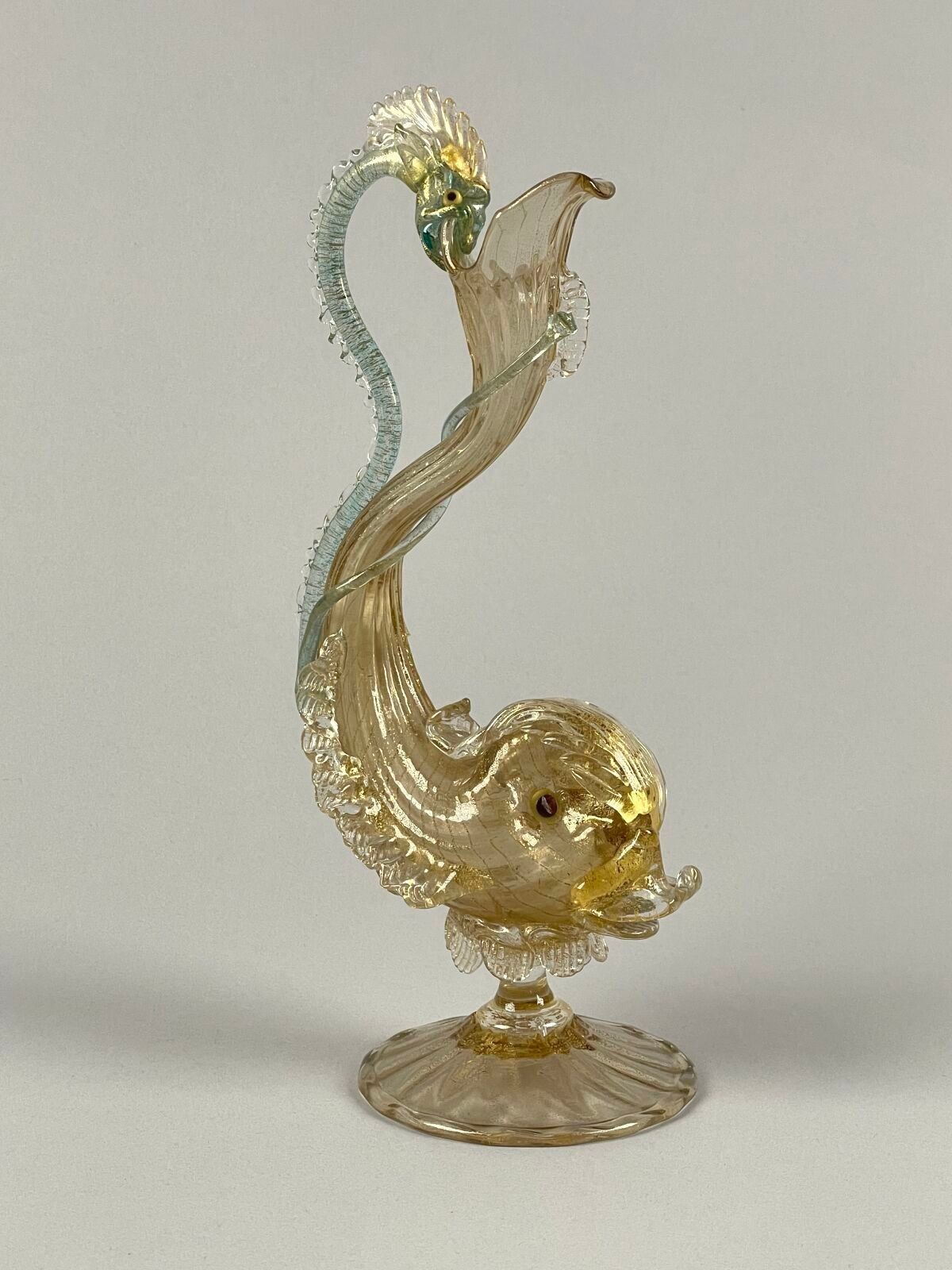 Dolphin ewer in coloured blown glass, decorated with gold inlays and resting on a circular base.