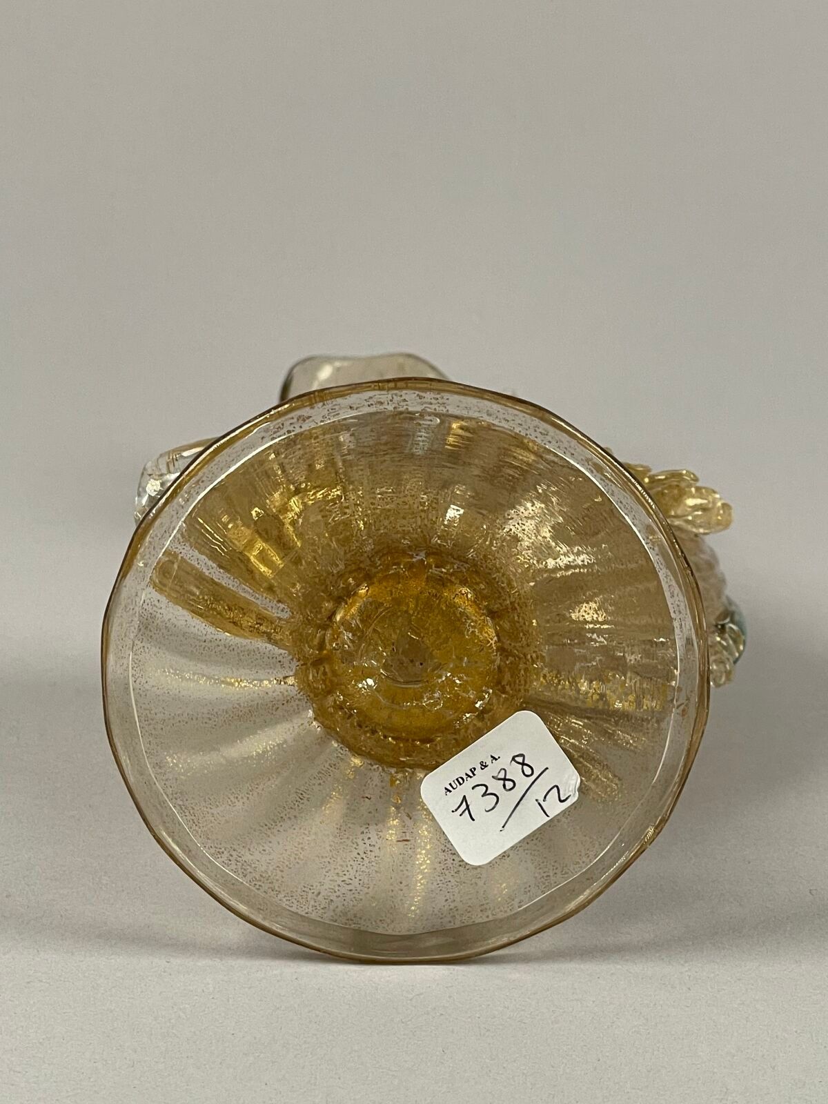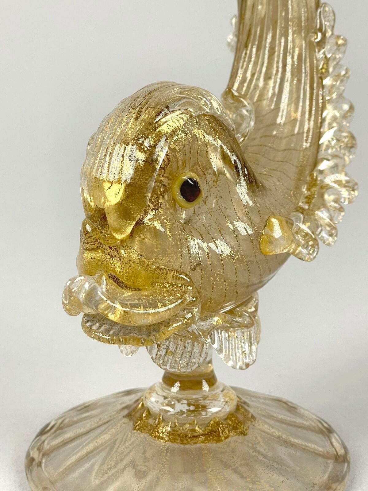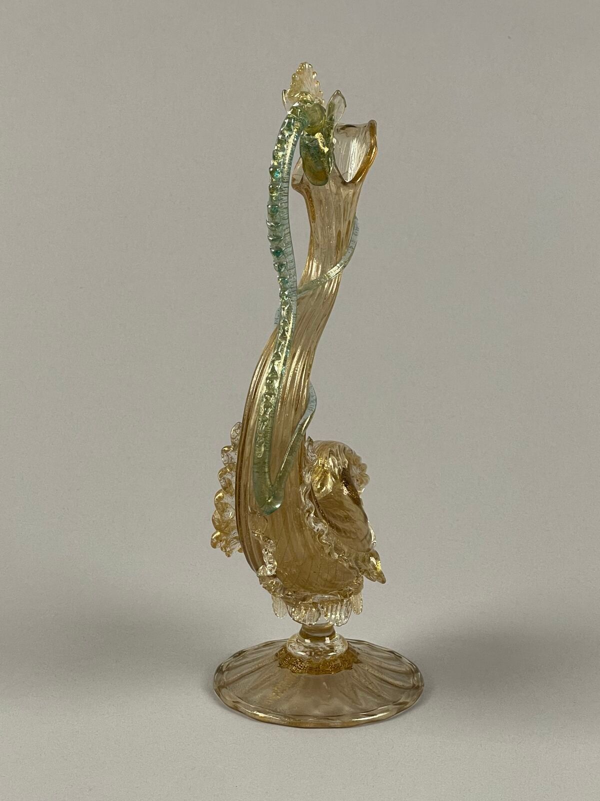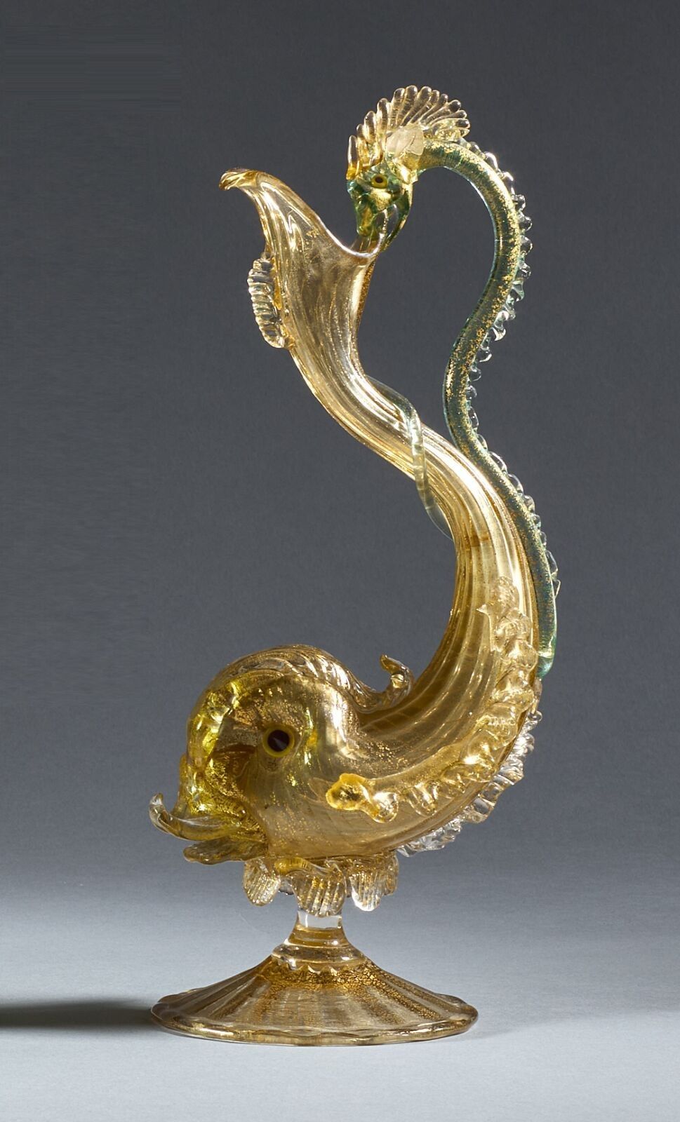 Dolphin ewer in coloured blown glass, decorated with gold inlays and resting on a circular base.