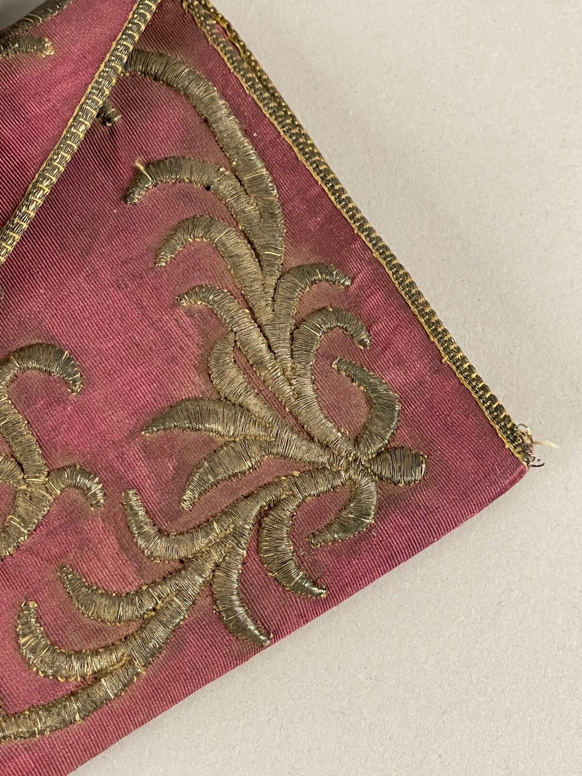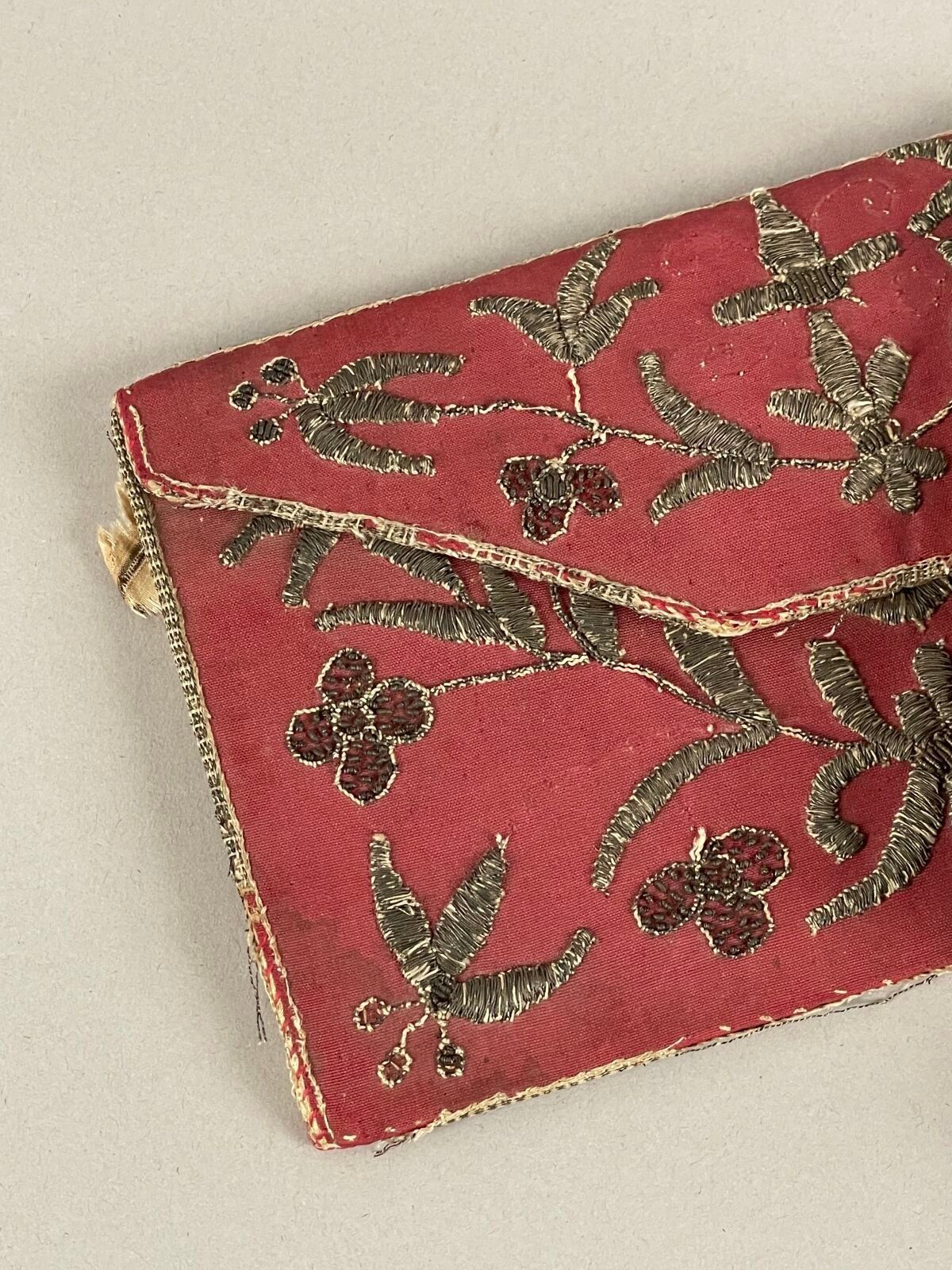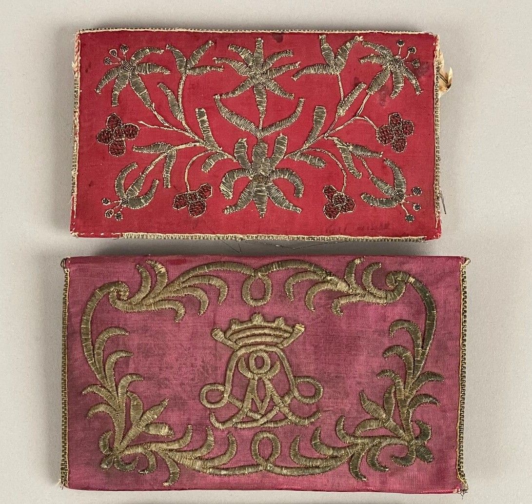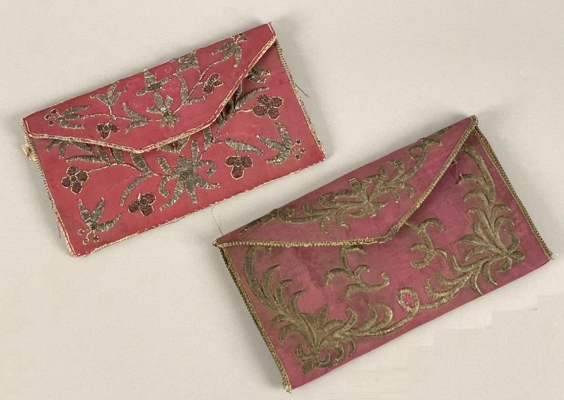 Set of two small pink silk folio holders with flaps, decorated with foliage and flowers in silver embroidery, one with a number under an open crown on the reverse.